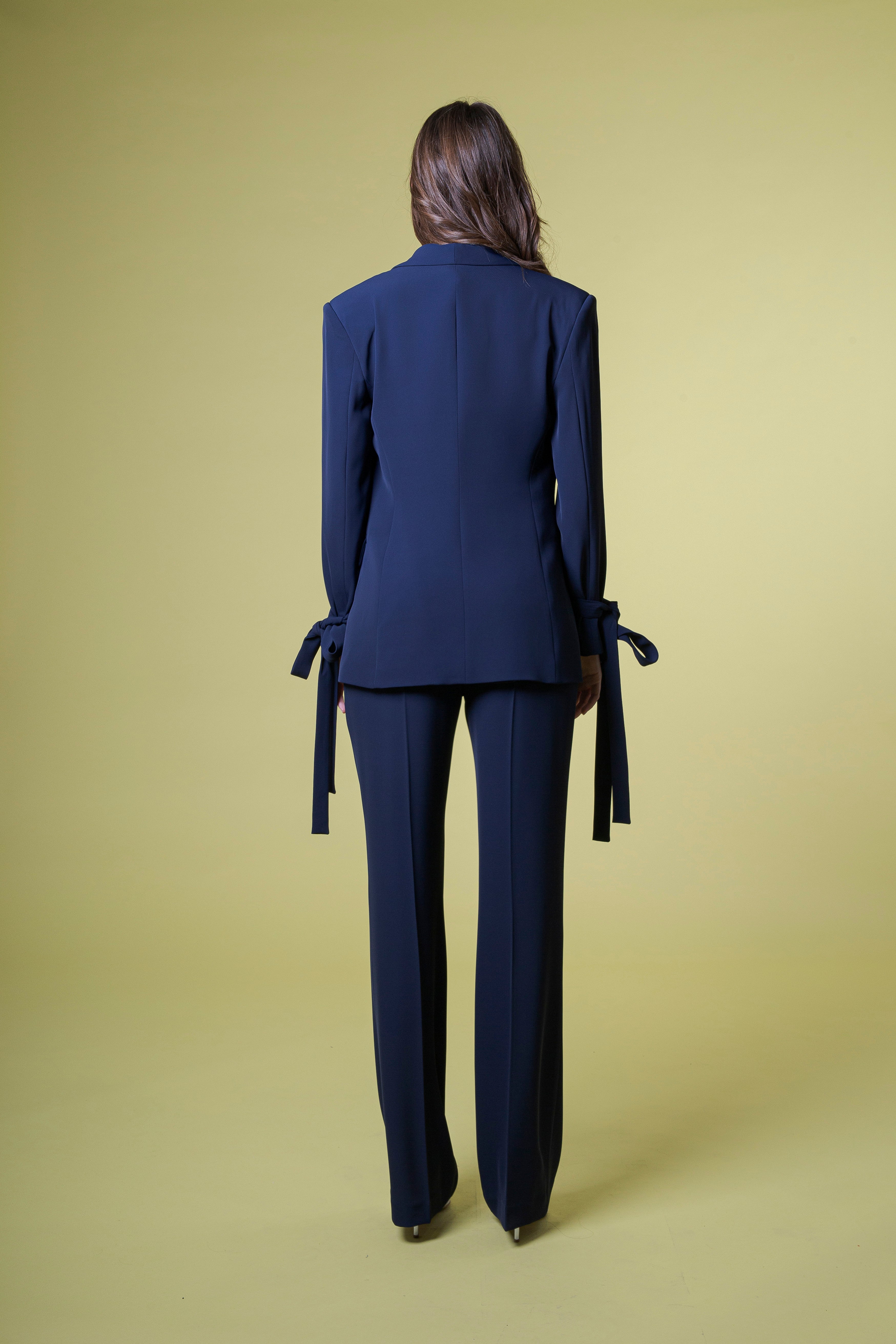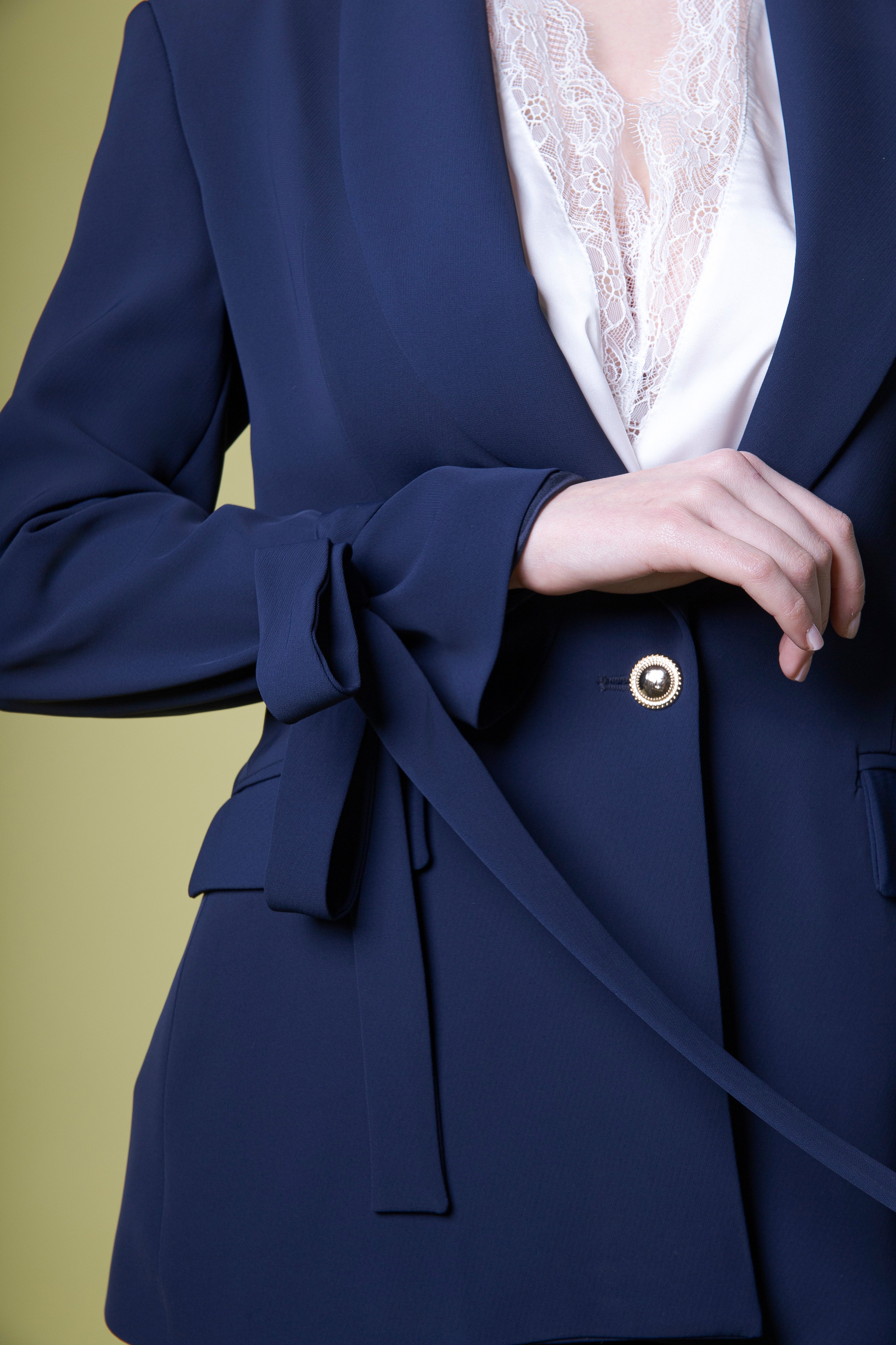 I rever eleganti incorniciano il volto e il décolleté con raffinatezza, richiamando la tradizione del tailoring ma reinterpretata in chiave moderna, mentre il bottone oro FC Flavio Castellani diventa il fulcro del design, piccolo gioiello sartoriale che illumina il davanti del capo con sofisticata discrezione. Sul bordo dei polsi, una piccola fusciacca aggiunge un tocco giocoso e prezioso, quasi un delicato sussurro di stile che movimenta la manica senza alterare l’equilibrio della giacca.