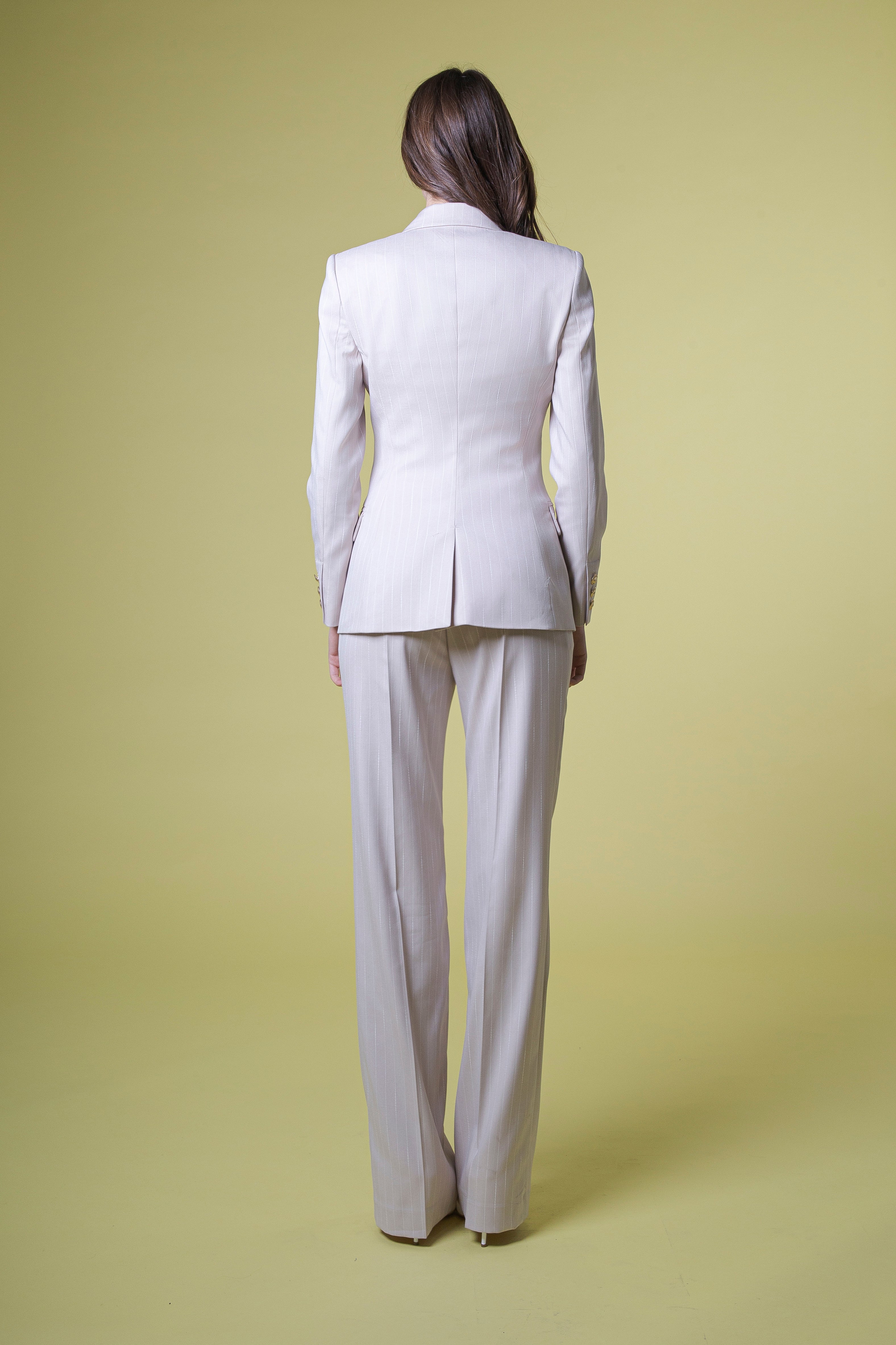Questa giacca doppiopetto gessata è un capolavoro di eleganza sartoriale, dove la tradizione del tailoring classico si fonde con dettagli preziosi e moderni. Il tessuto gessato, raffinato e rigoroso, definisce una silhouette netta e slanciata, mentre la struttura doppiopetto conferisce autorevolezza e presenza, rendendo il capo perfetto per chi ama distinguersi con stile.