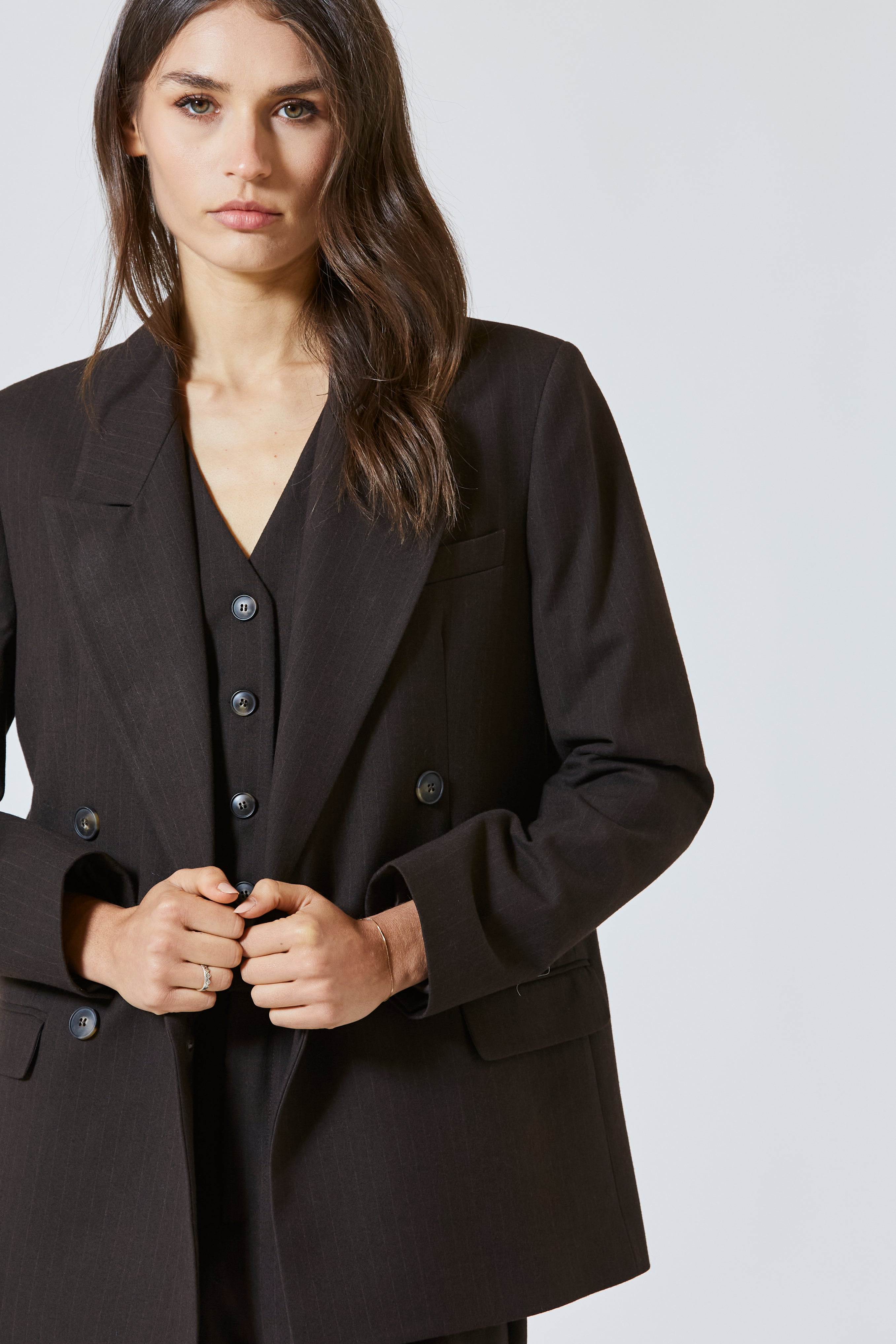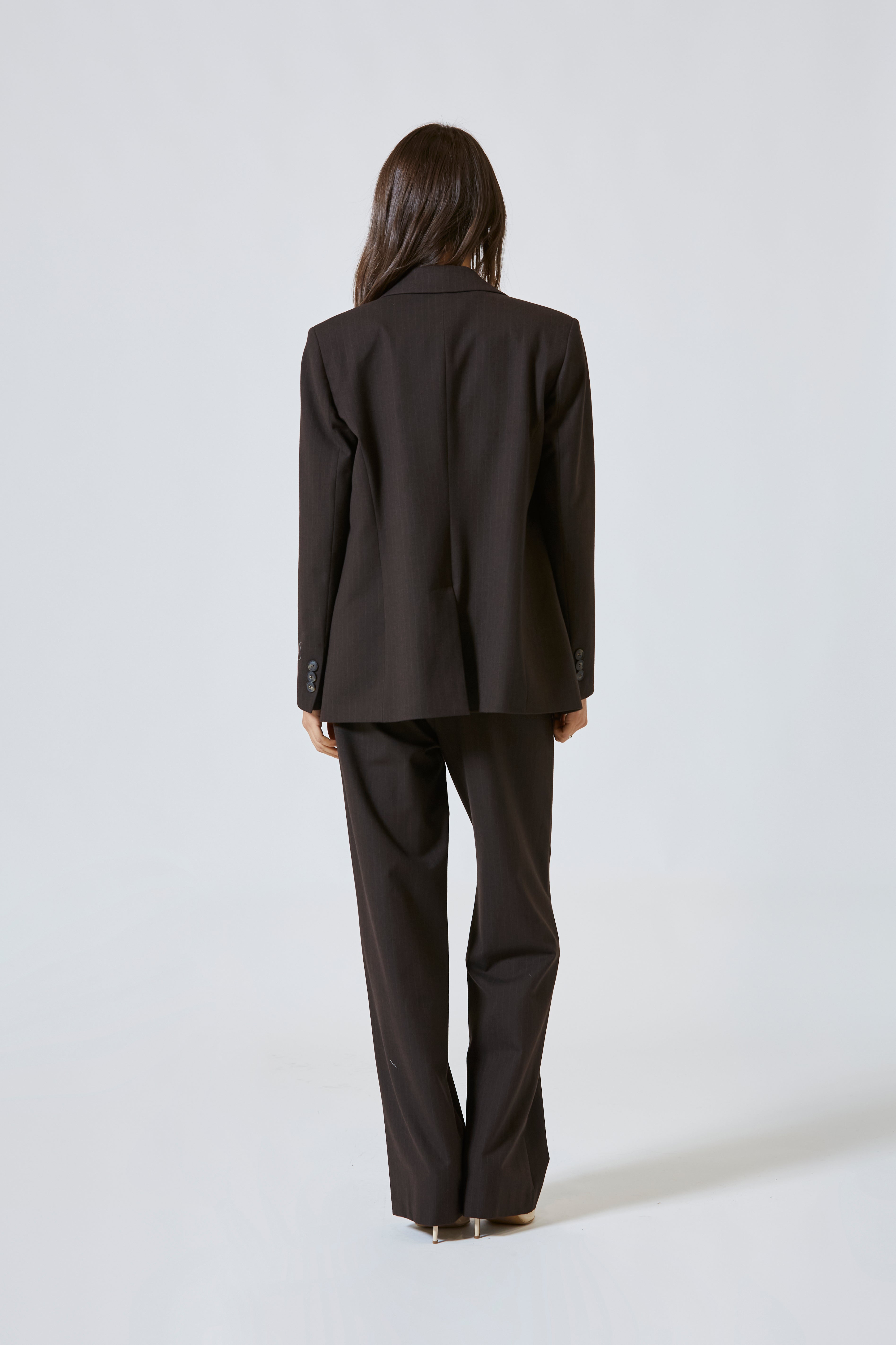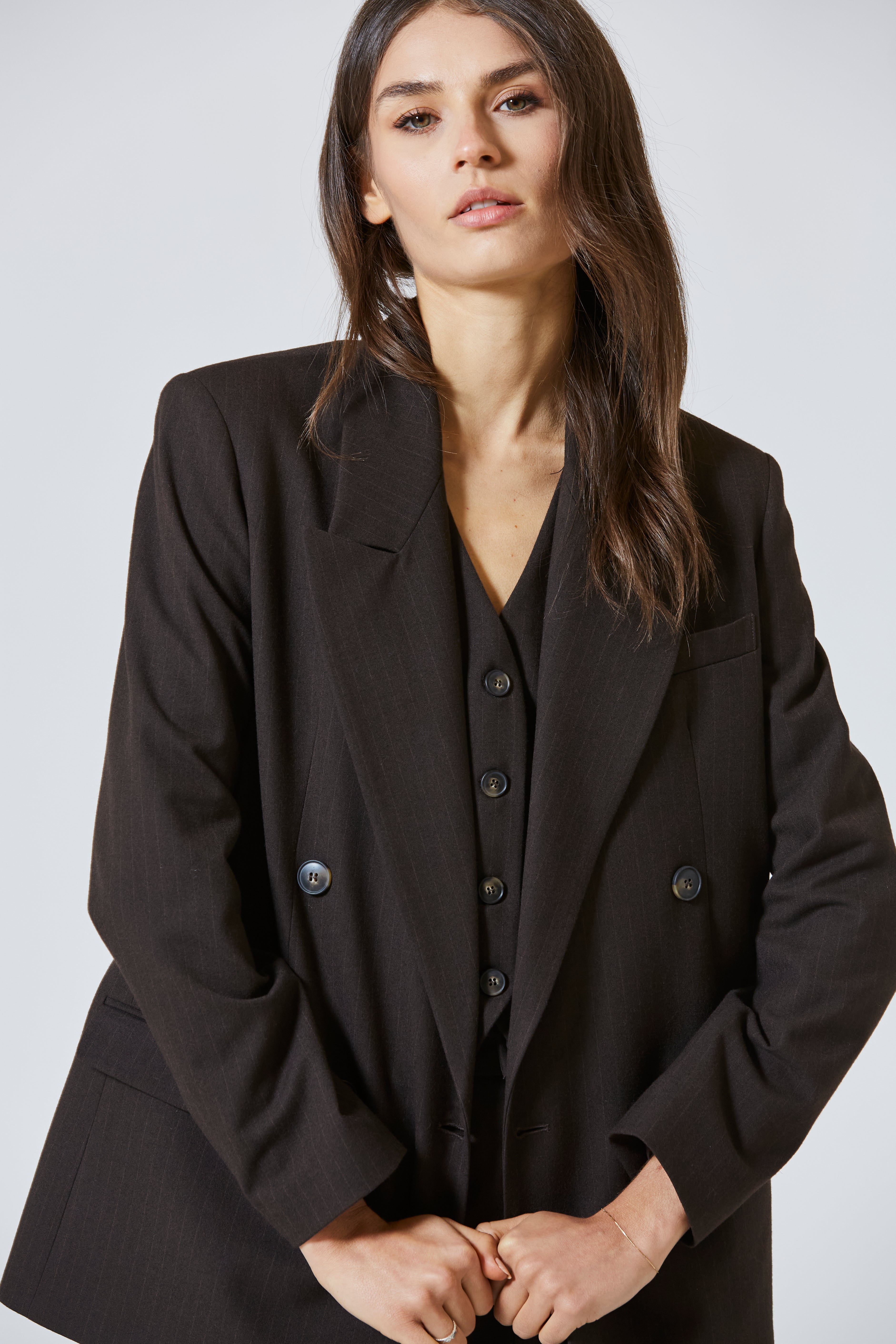 Abbinata al gilet e al pantalone gessati crea un completo dal fascino magnetico, perfetto per la donna che desidera sentirsi elegante e autorevole, senza rinunciare alla sua naturale sensualità. Ma la giacca sa anche vivere da sola: sopra un denim scuro per un contrasto contemporaneo, o su una gonna midi per un’eleganza più romantica.