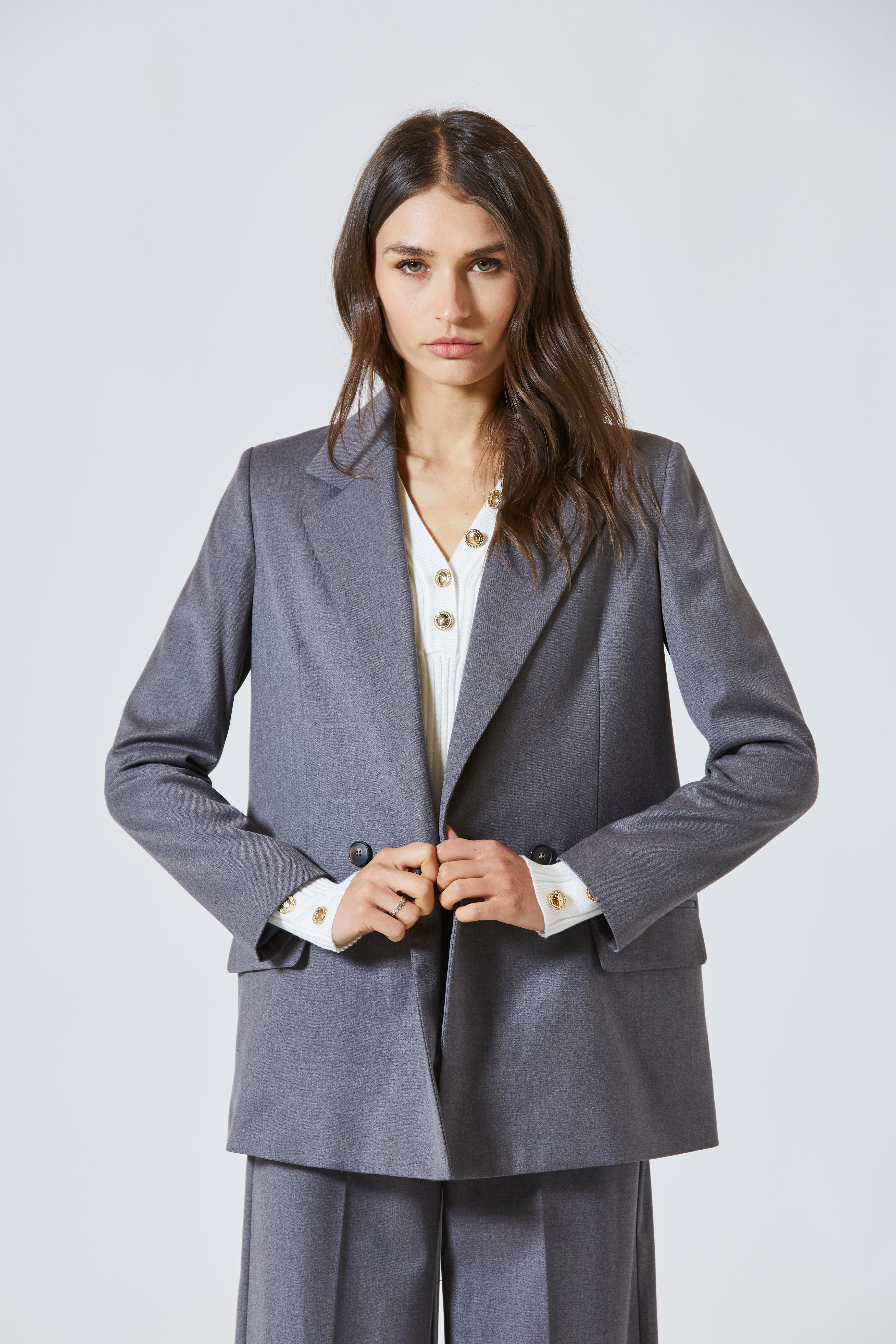 Non è una semplice giacca: è un manifesto di stile, un capo che occupa lo spazio con garbo e determinazione, capace di trasformare l’intera figura con un solo gesto. L’impronta over, studiata nei minimi dettagli, non è sinonimo di eccesso, ma di scelta estetica: il taglio è generoso, sì, ma calibrato con quella sapienza sartoriale tutta italiana che conosce il valore della linea, la direzione delle spalle, la caduta del tessuto.