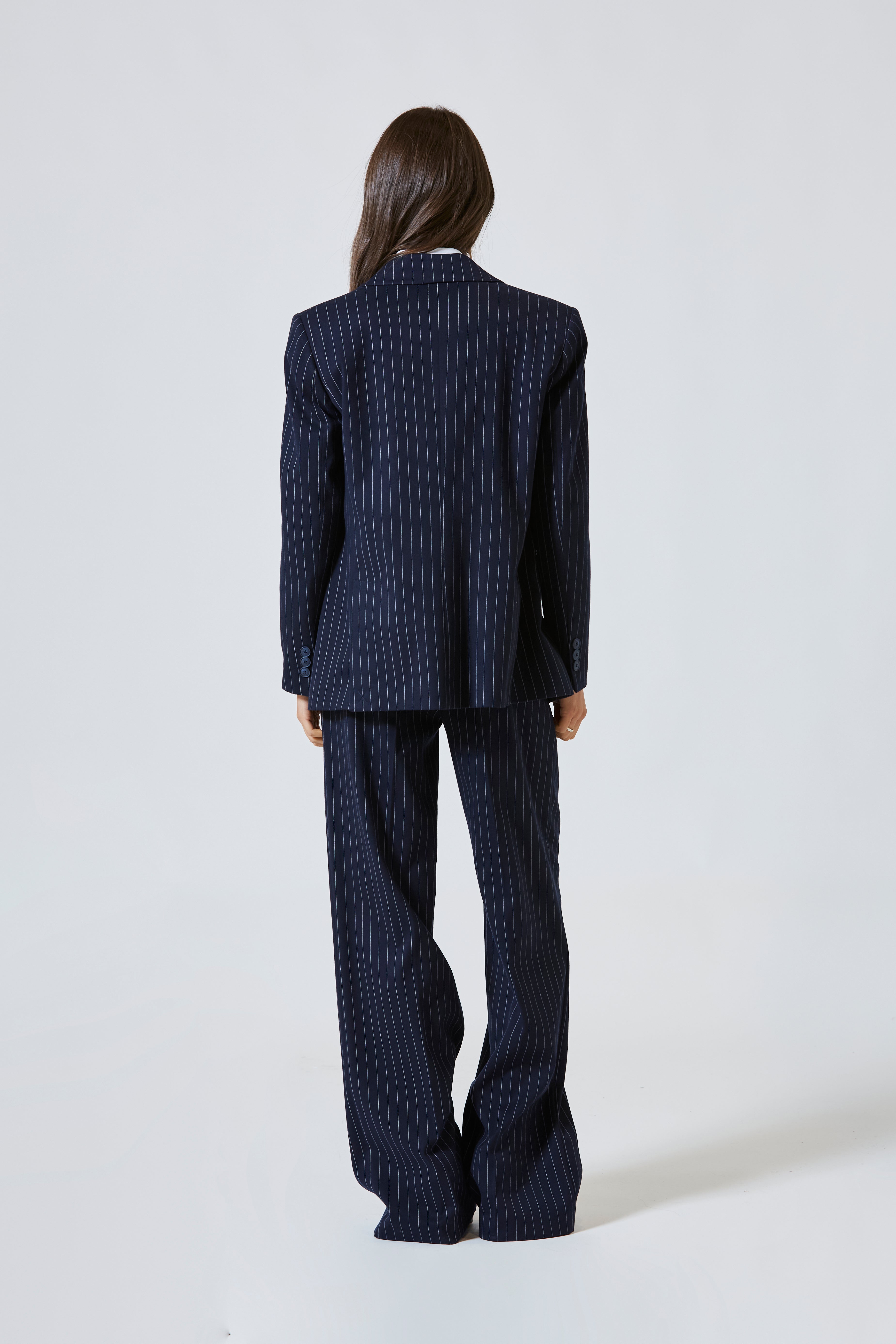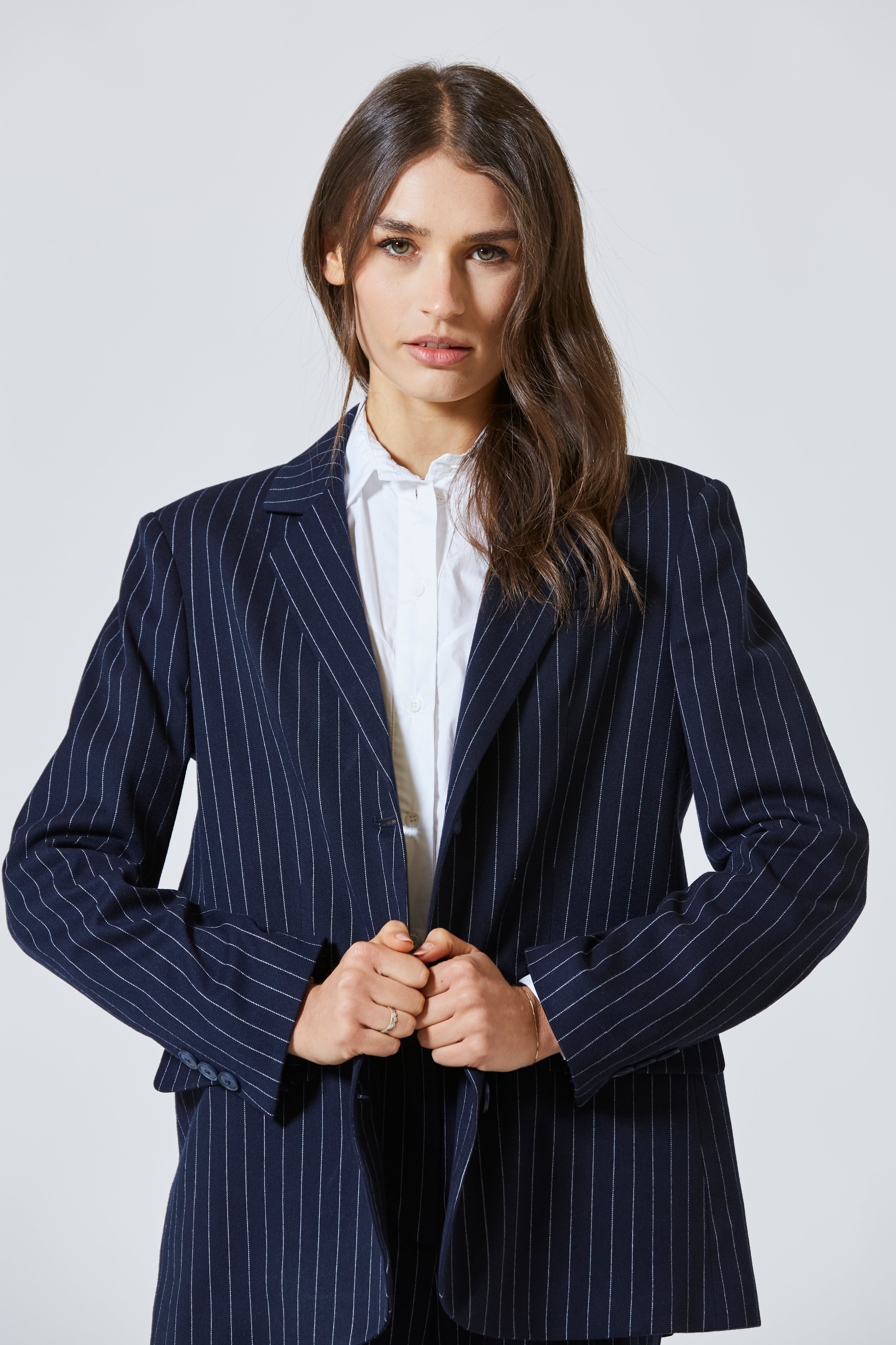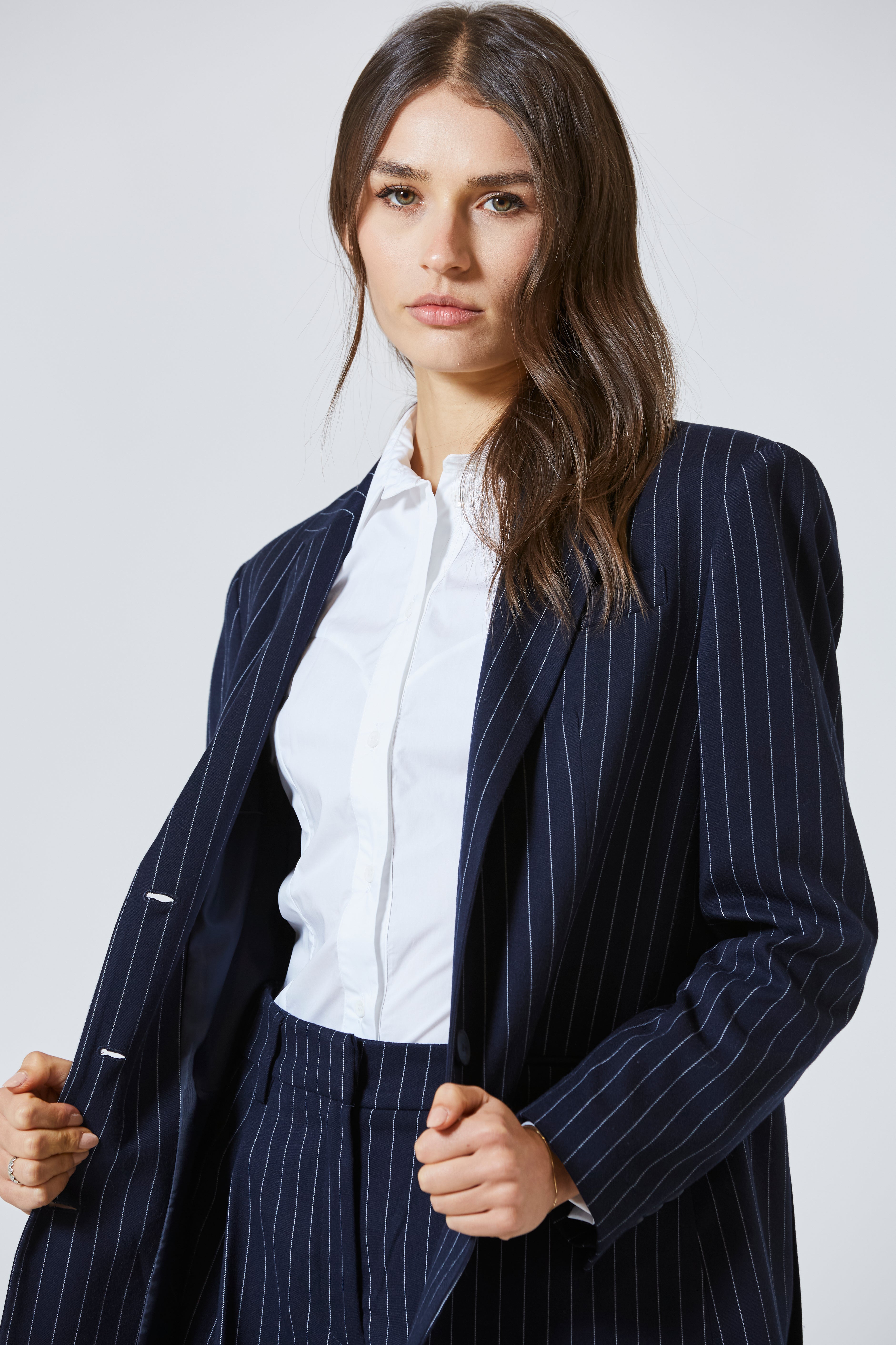 Realizzata in un tessuto di qualità Made in Italy, la giacca gioca con le proporzioni e i volumi: le spalle ampie e la linea over creano un senso di movimento e leggerezza, mentre il motivo gessato mantiene il richiamo alla tradizione sartoriale, conferendo carattere e raffinatezza.