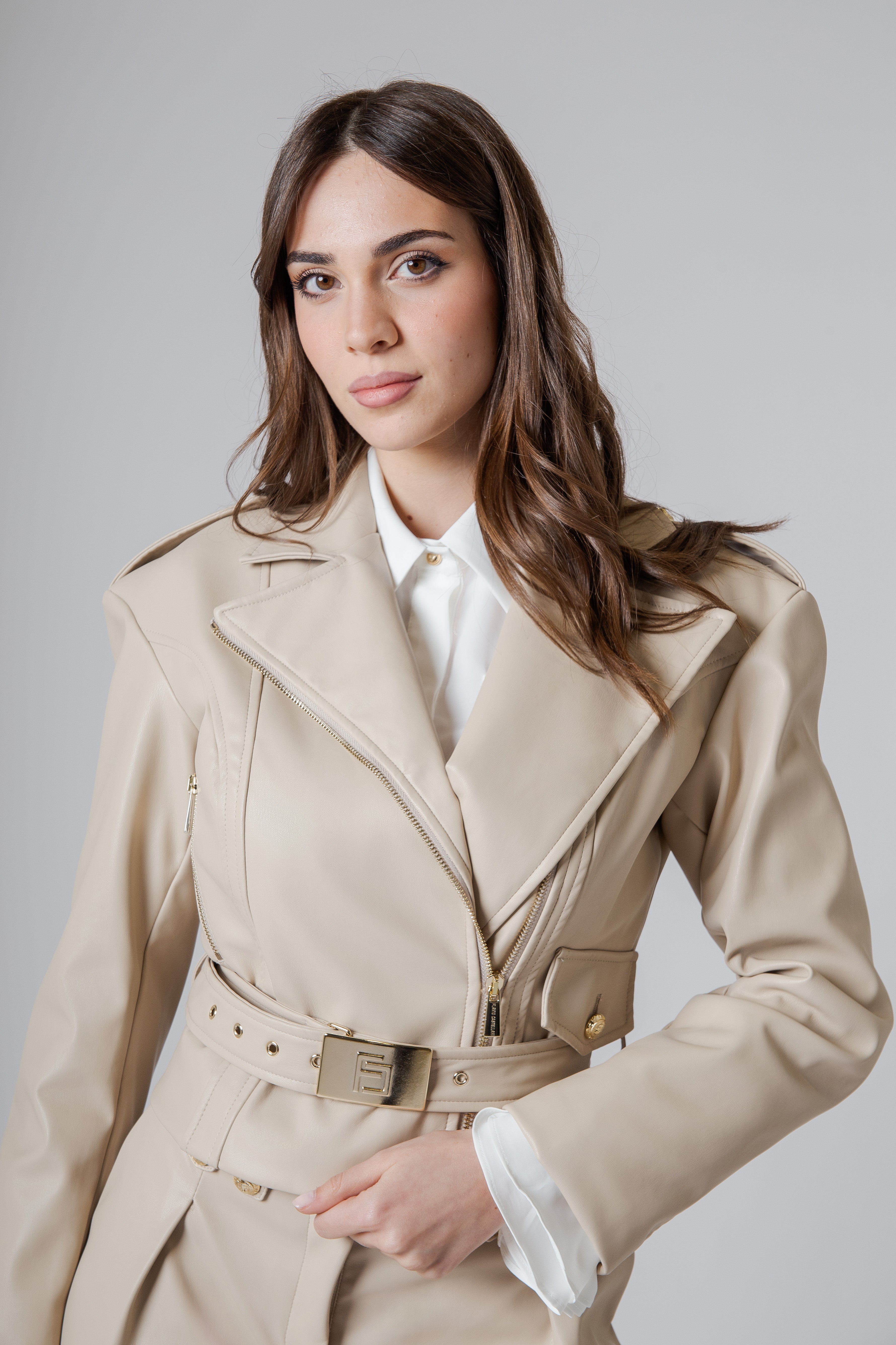A completare il design troviamo la cintura in vita con fibbia oro, un dettaglio tipico dello stile biker che dona struttura alla silhouette. La cintura permette di definire il punto vita con naturalezza, aggiungendo allo stesso tempo un accento deciso e grintoso. La fibbia dorata cattura la luce con eleganza, creando un elemento gioiello che impreziosisce il giubbino.