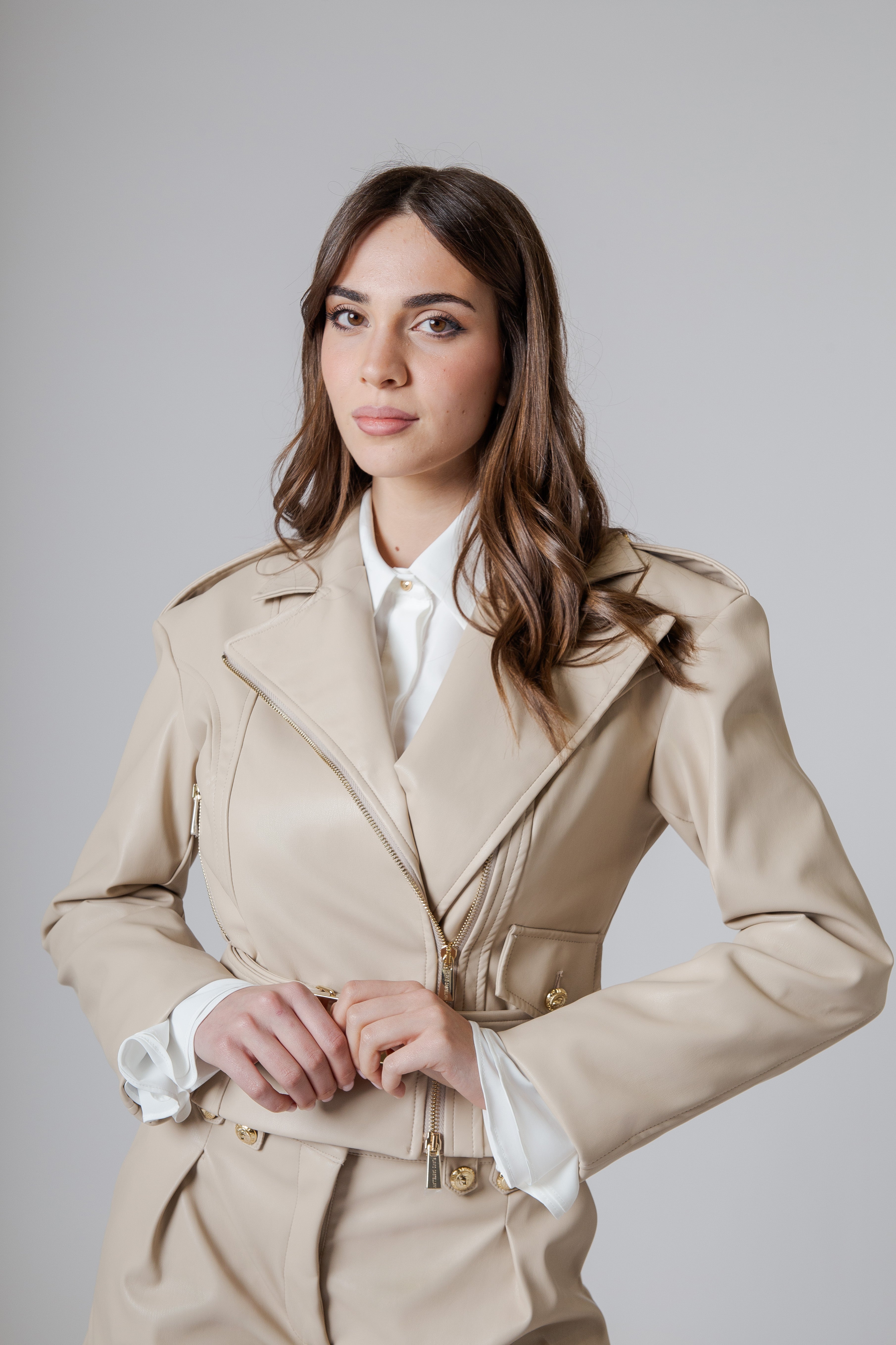 Il risultato è un giubbino biker in simil pelle dal carattere moderno e femminile, dove la grinta dello stile biker incontra l’eleganza dei dettagli dorati. La zip oro e la cintura con fibbia dorata trasformano questo capo iconico in una proposta sofisticata, perfetta per dare personalità e stile a qualsiasi look.