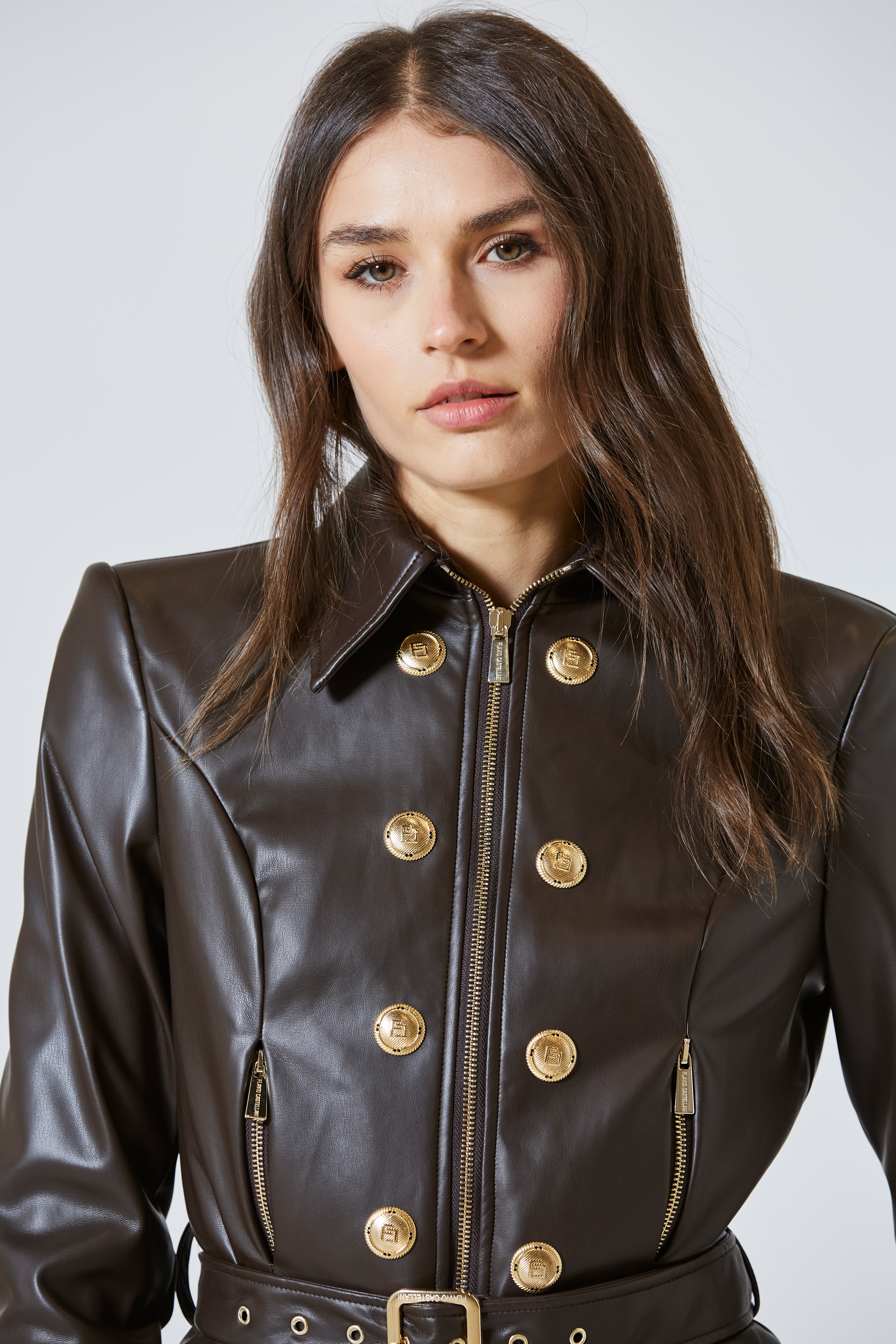Realizzata in una morbida ecopelle dall’effetto setoso e luminoso, avvolge il corpo come una seconda pelle, disegnando linee decise ma fluenti. La struttura richiama la classicità della giacca sartoriale, ma si rinnova in chiave moderna grazie a una zip dorata che corre lungo la parte anteriore, dettaglio prezioso che spezza il rigore con un tocco di audacia.