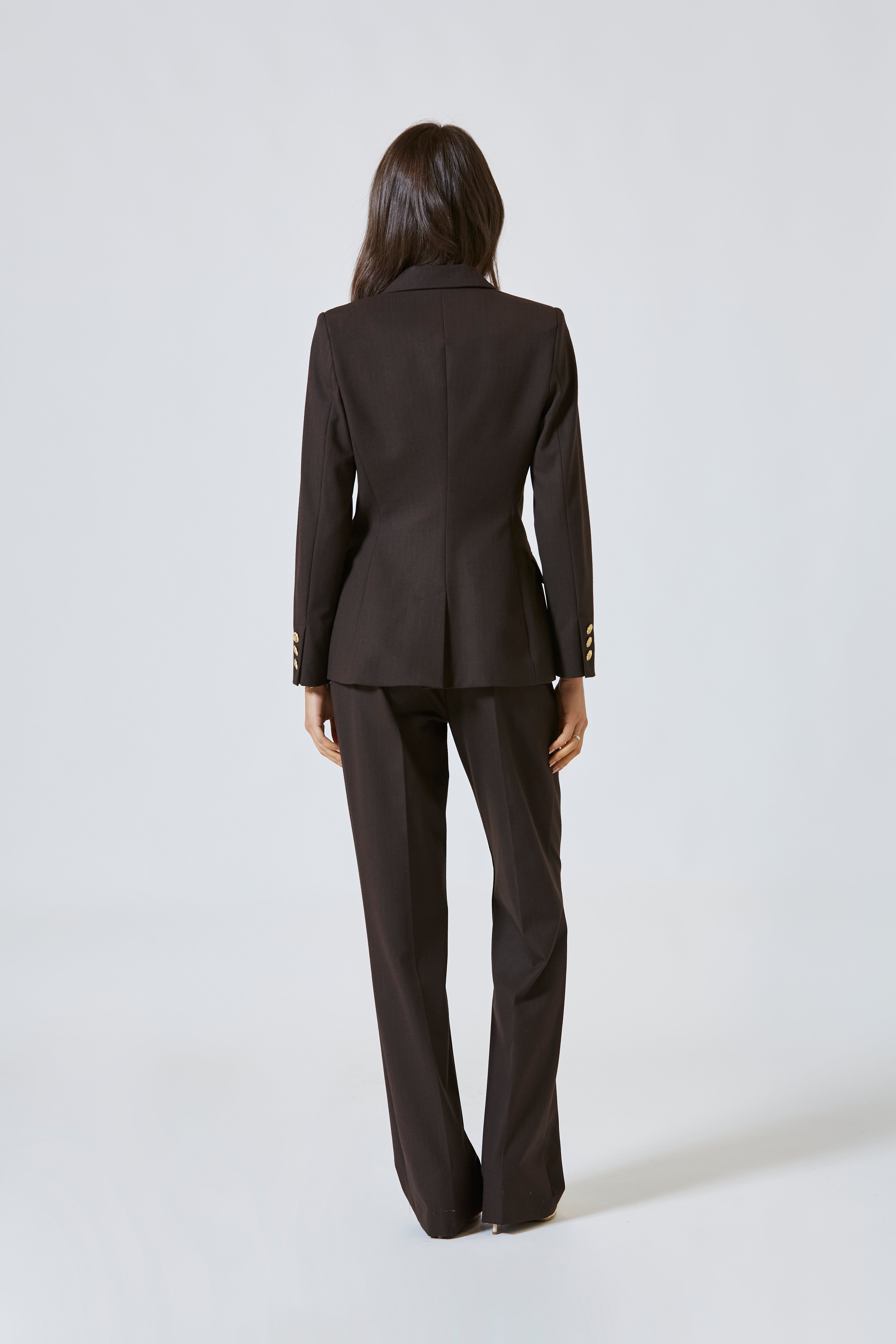 La linea è strutturata, ma fluida. La silhouette accompagna la figura con precisione sartoriale: le spalle sono leggermente marcate, il punto vita appena accennato, l’orlo che scende deciso sui fianchi crea un gioco di volumi elegante e slanciato. Il taglio doppiopetto, con le sue due file di bottoni dorati finemente incisi con il monogramma FC, è una dichiarazione di stile in sé: raffinato, simbolico, senza tempo.