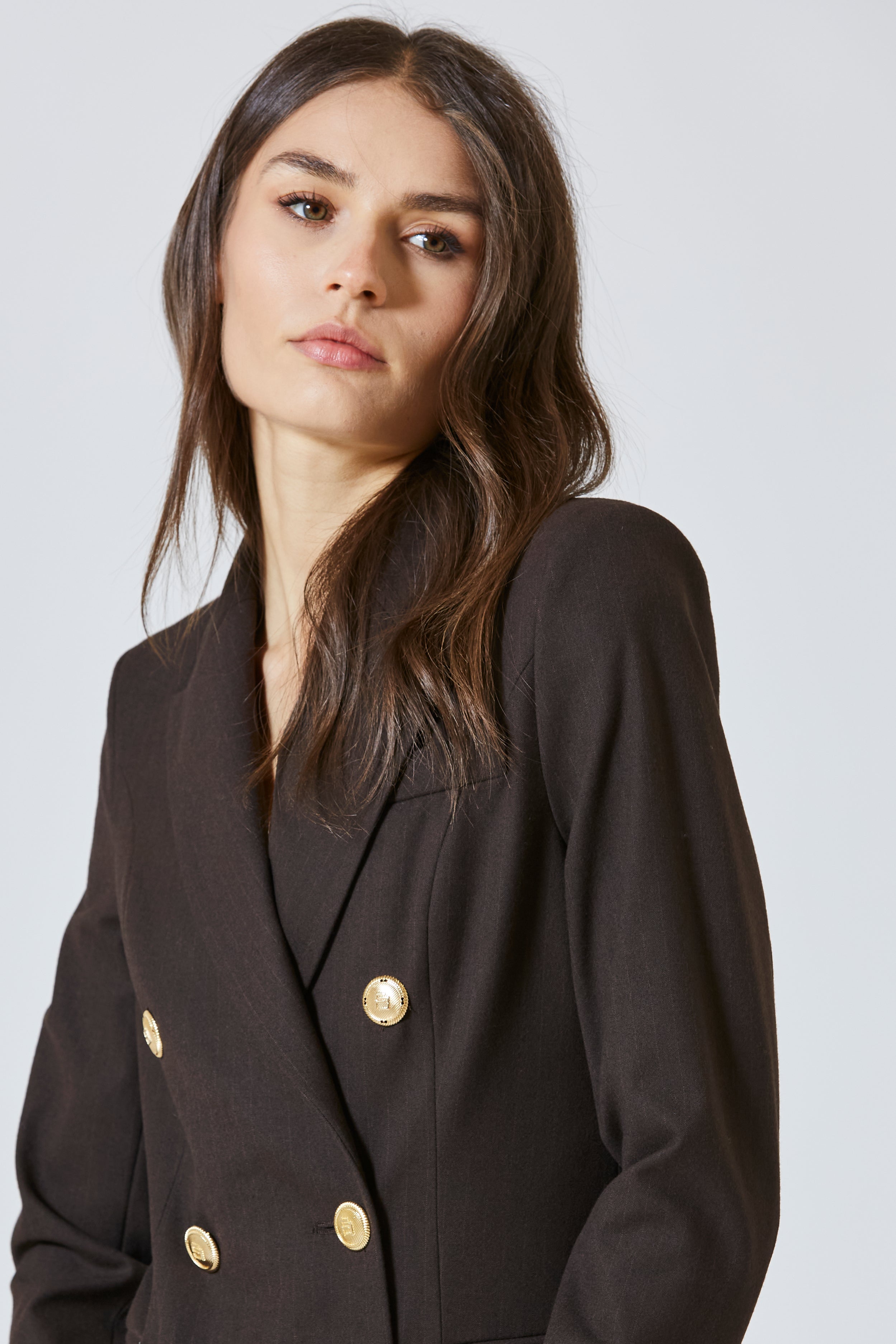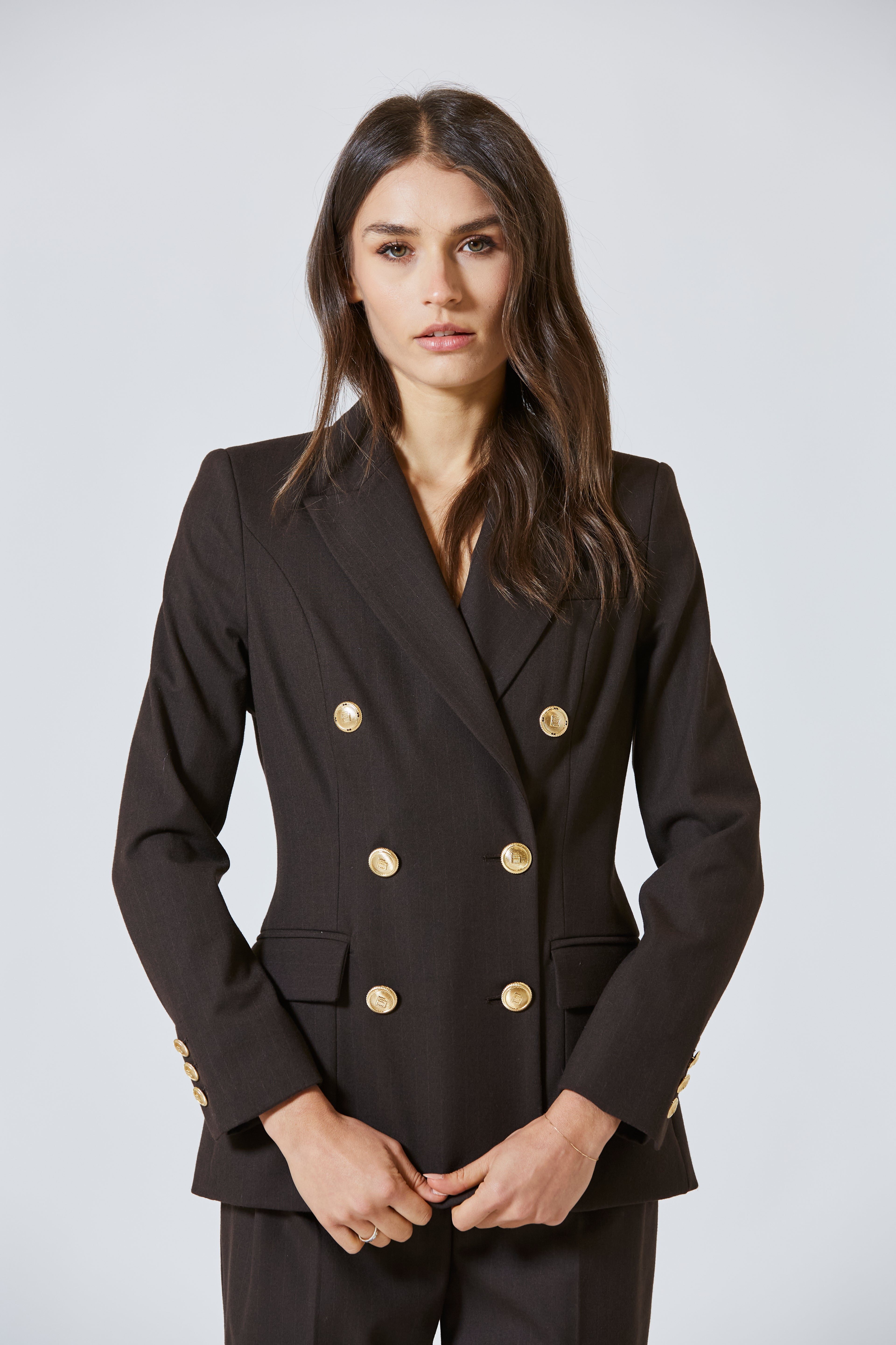 Indossata con il suo pantalone coordinato gessato, la giacca diventa un completo perfetto per riunioni, eventi e occasioni dove lo stile parla prima ancora delle parole. Ma portata su un denim, su una minigonna in pelle o su un abito leggero, rivela tutta la sua versatilità e il suo spirito metropolitano.