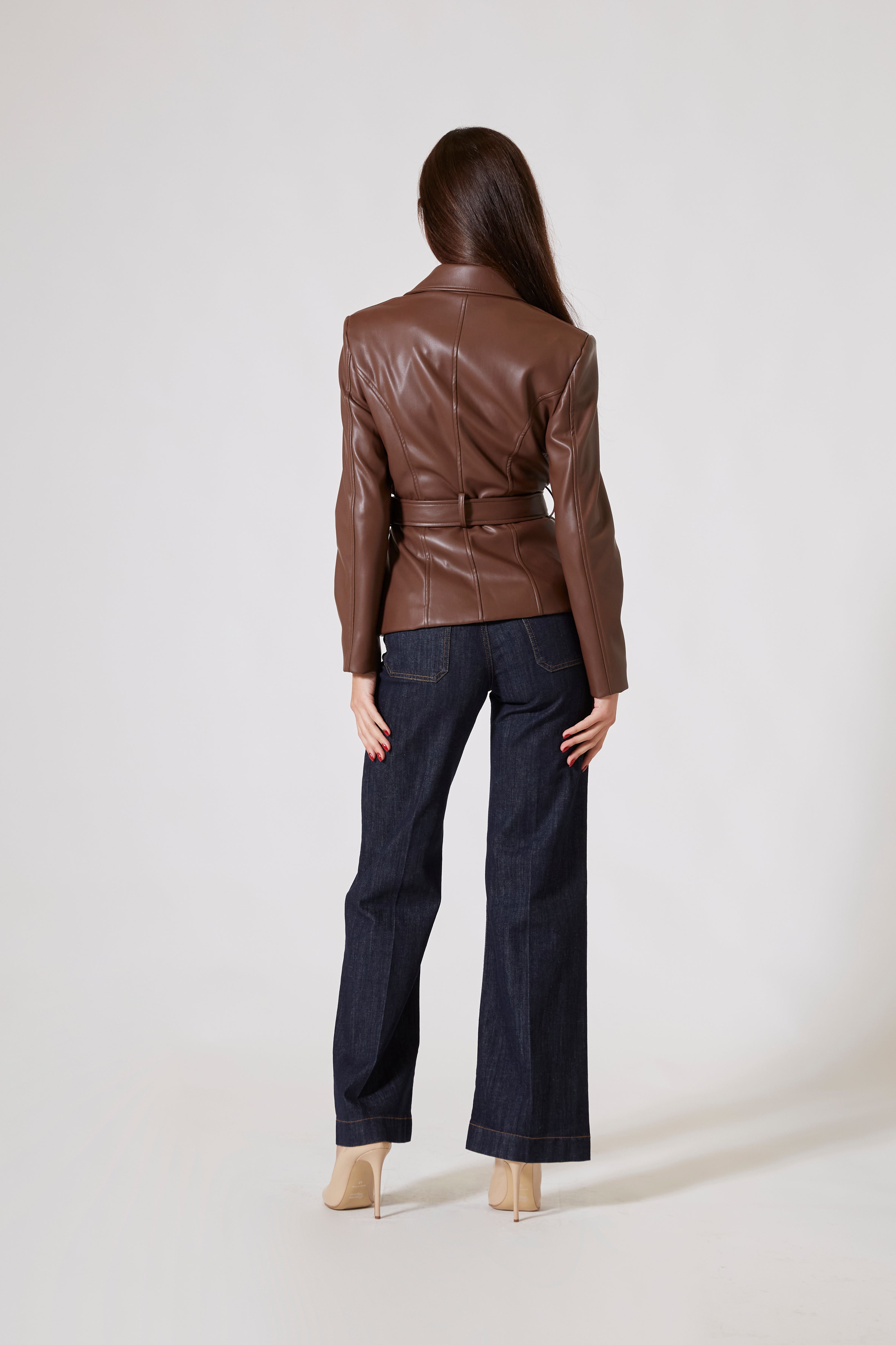 La cintura, con la sua fibbia in oro, avvolge la vita come un gesto di eleganza studiata ma spontanea. È una carezza decisa, un abbraccio che sottolinea la femminilità senza bisogno di parole, disegnando una silhouette che parla di forza e grazia insieme. È il dettaglio che completa il racconto di questo capo, la firma di uno stile consapevole e raffinato.
