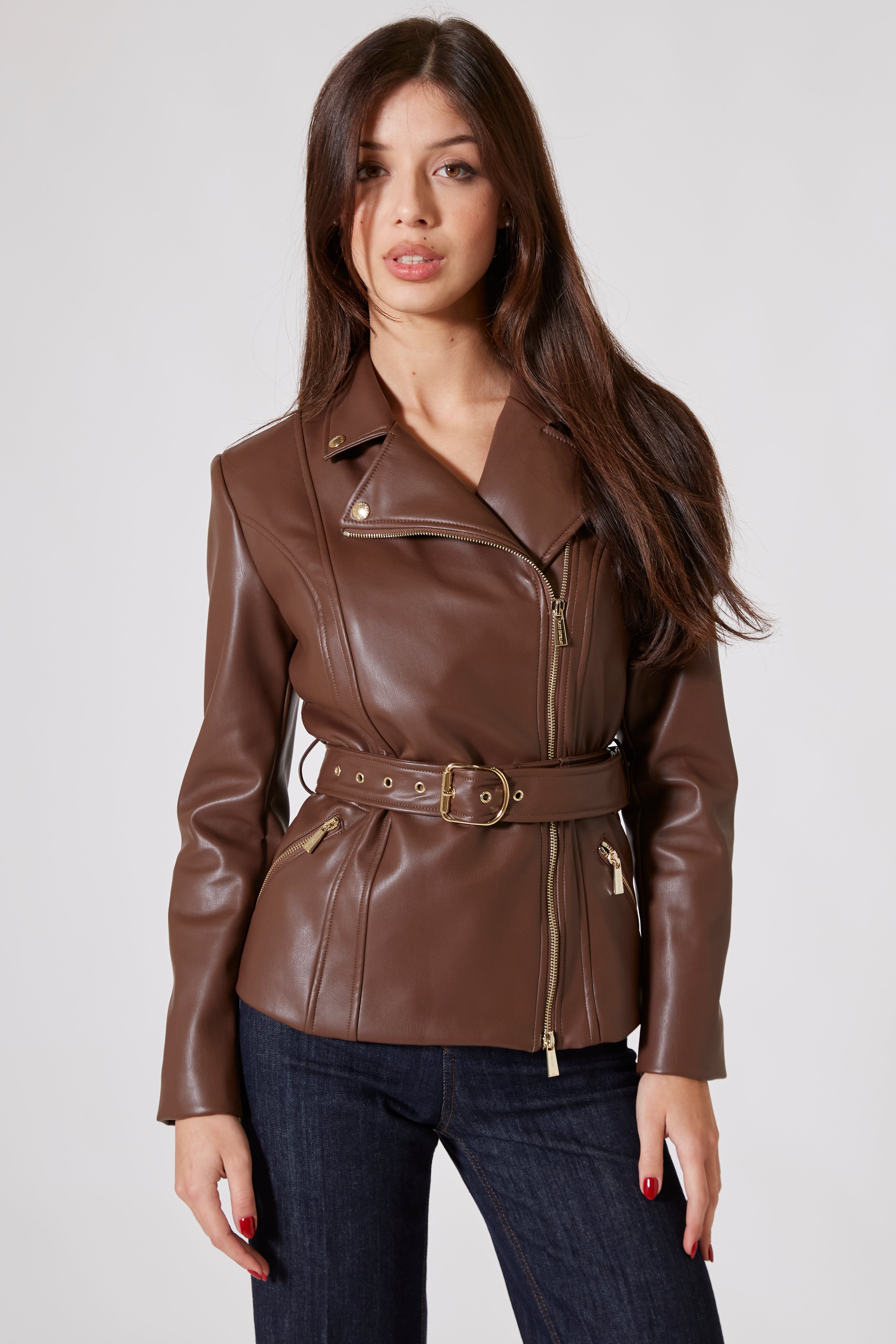 Al centro, la zip dorata si apre come un filo di luce, una linea decisa e preziosa che scolpisce la figura con eleganza e carattere, scandendo ogni movimento con un ritmo che sa di libertà e stile. Non è solo un dettaglio funzionale, ma un elemento che accende l’intero capo, trasformandolo in un piccolo gioiello di modernità.