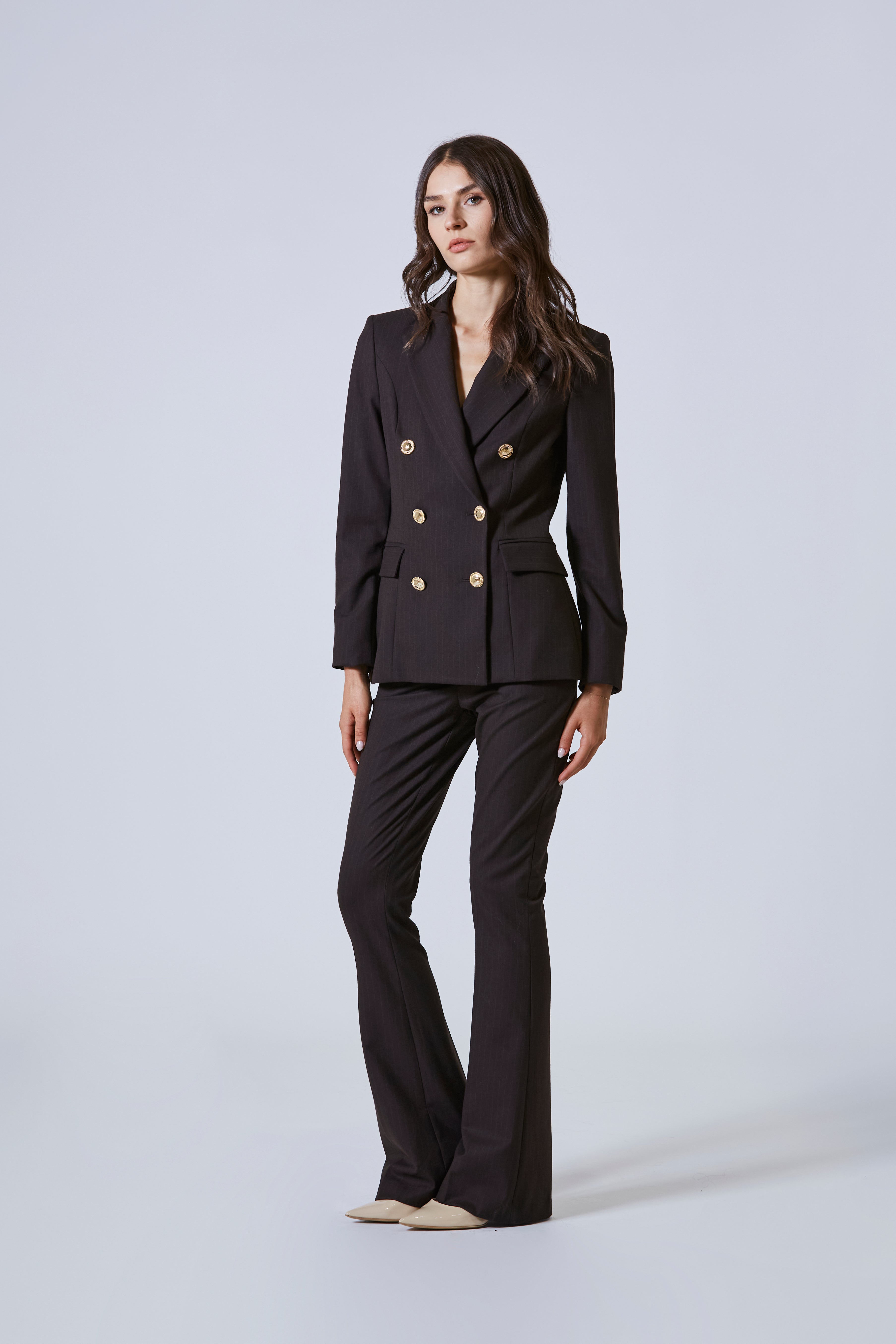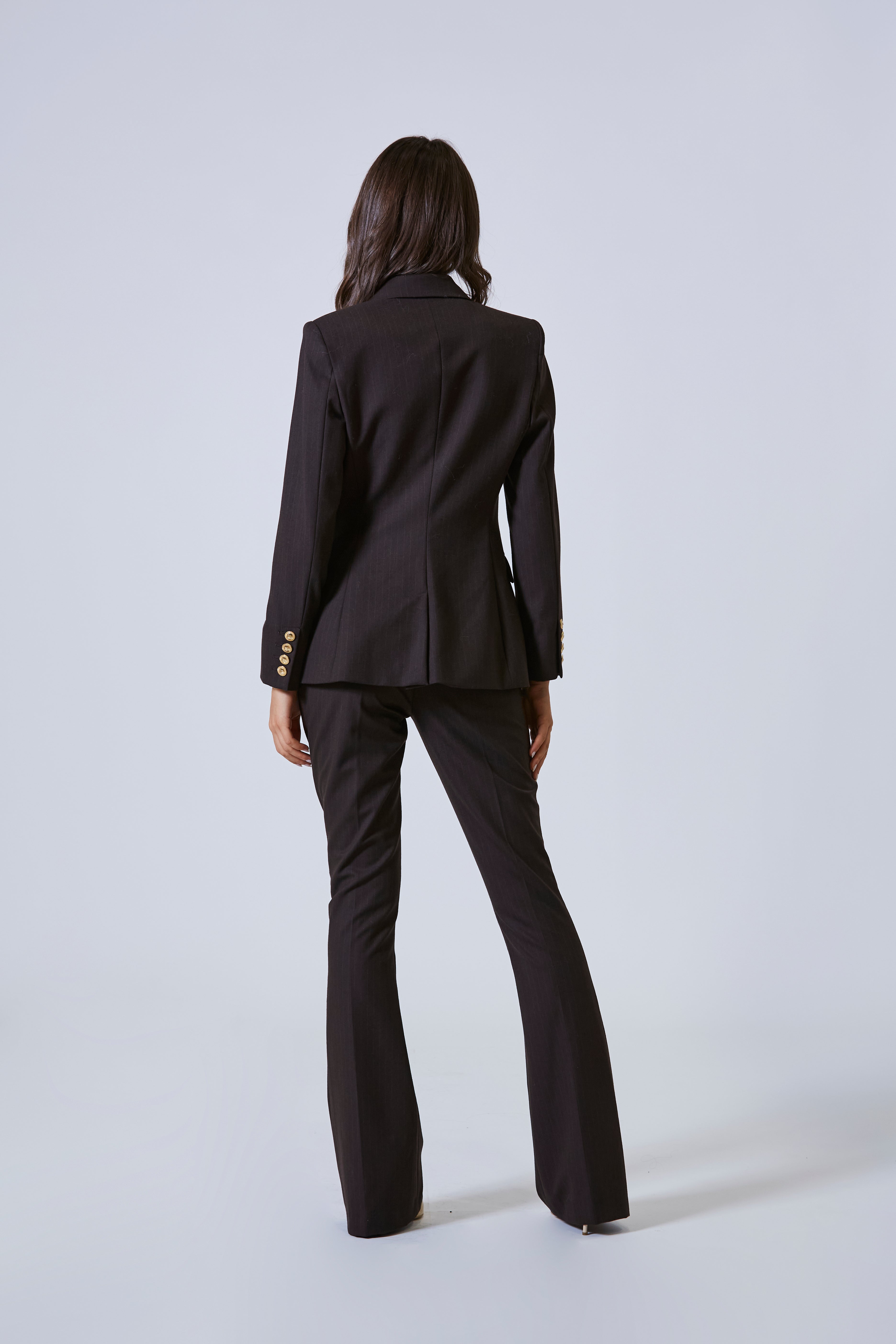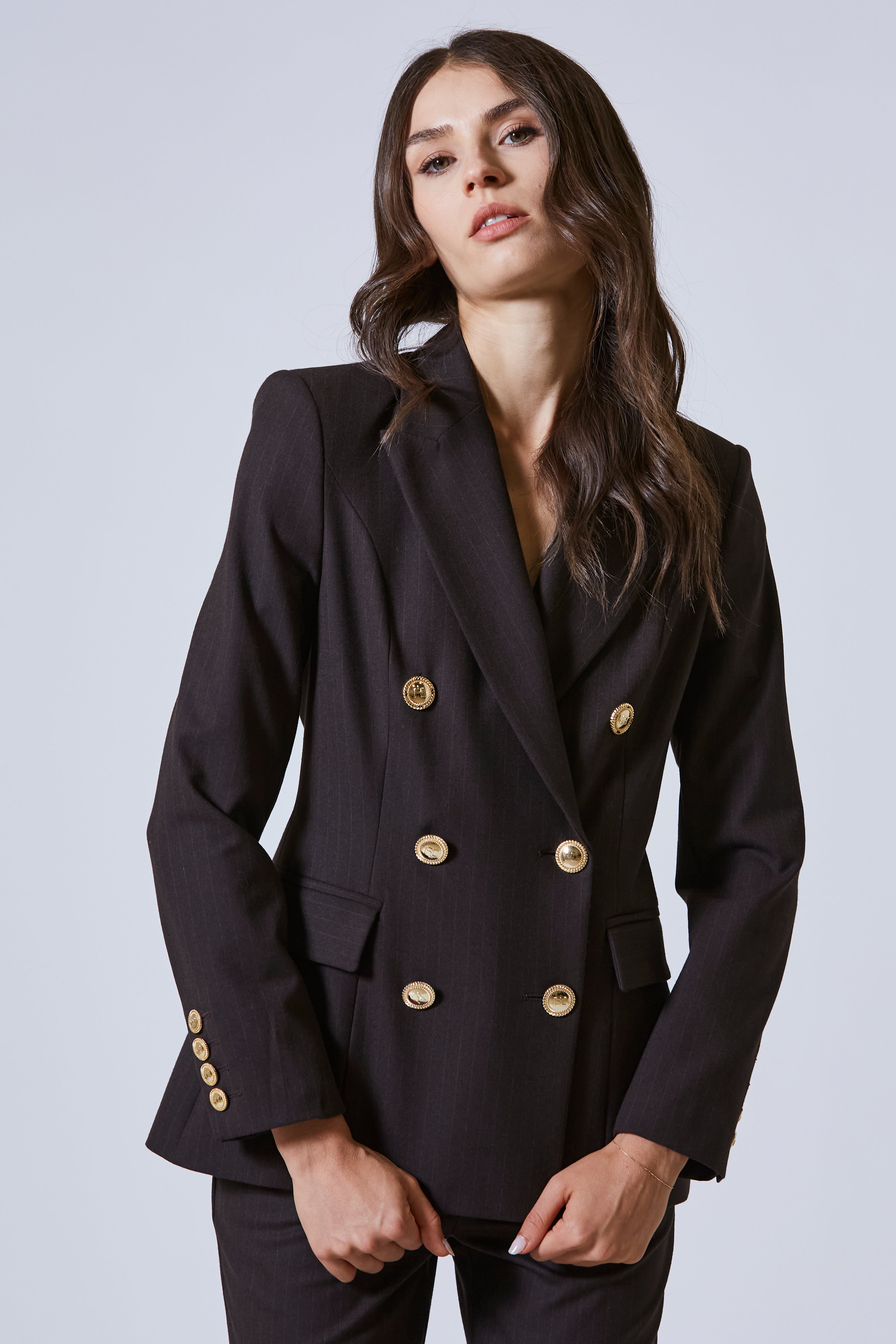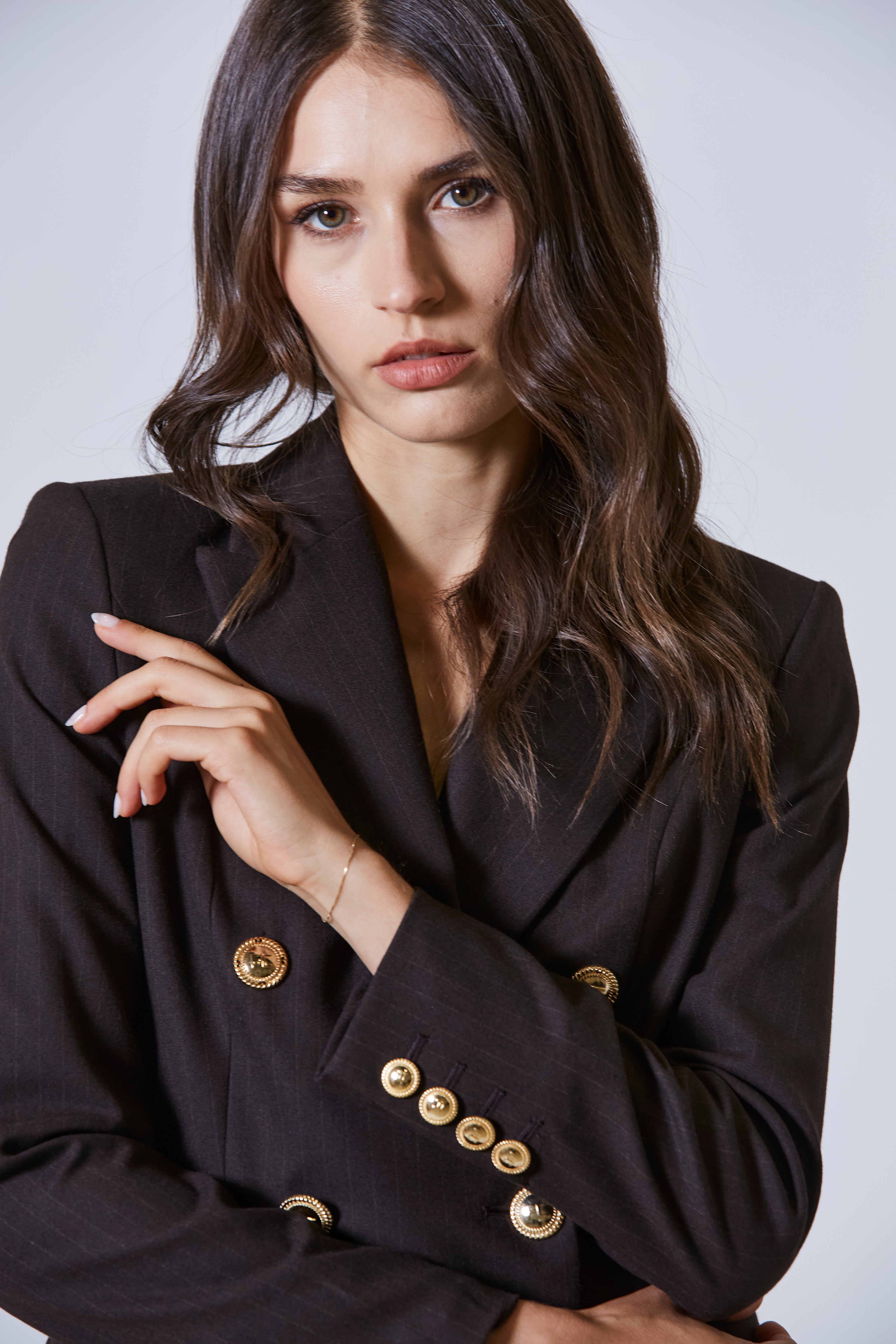 Questa giacca gessata doppio petto, illuminata dai suoi iconici bottoni oro, non è soltanto un elemento del guardaroba: è un’affermazione di stile, decisa e raffinata.