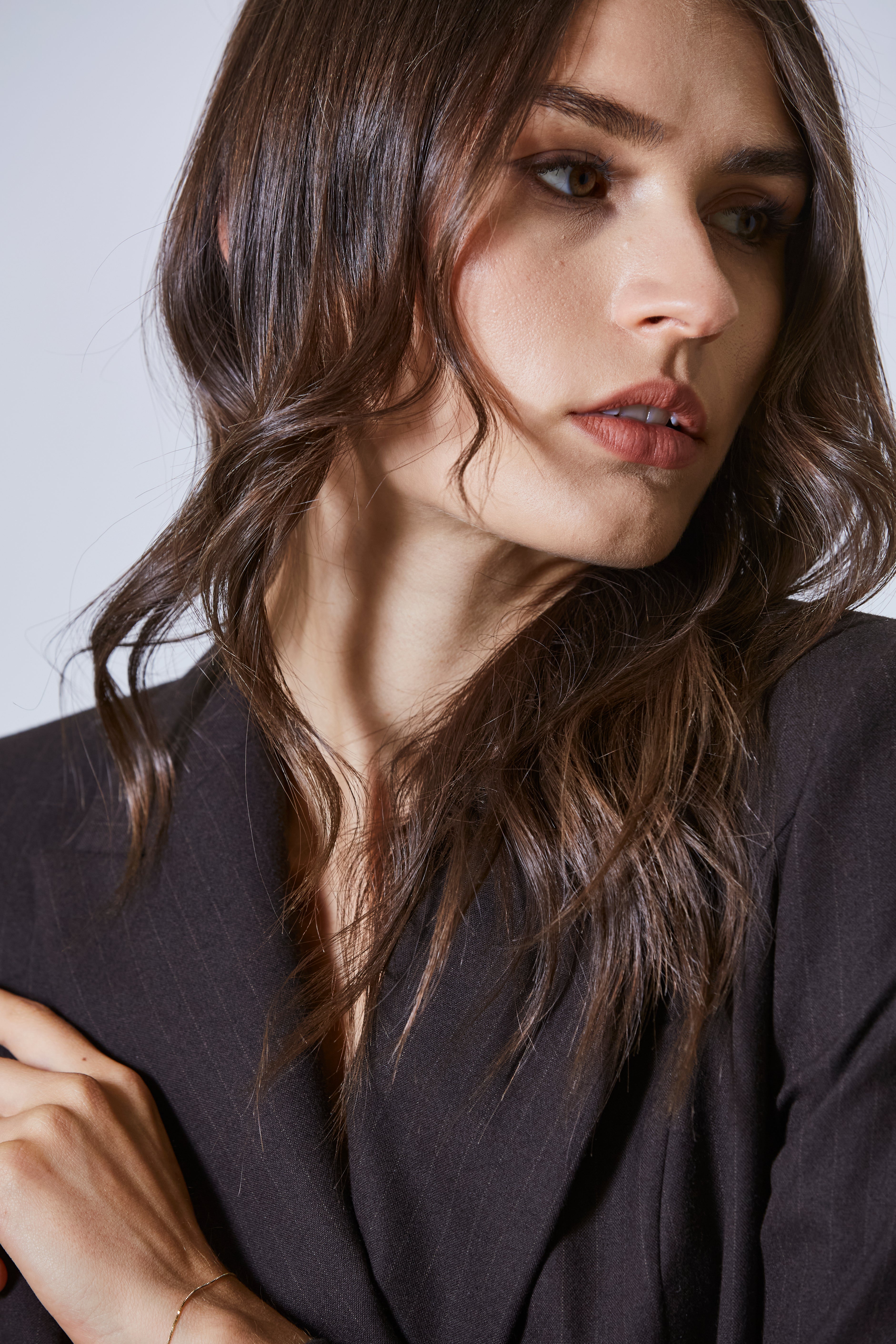 Le linee sottili del gessato, regolari e verticali, scorrono sul tessuto con ritmo elegante, donando slancio alla figura e profondità al capo. Una fantasia intramontabile, che evoca il rigore del mondo maschile ma si lascia trasformare da un taglio che abbraccia il corpo con grazia e decisione.