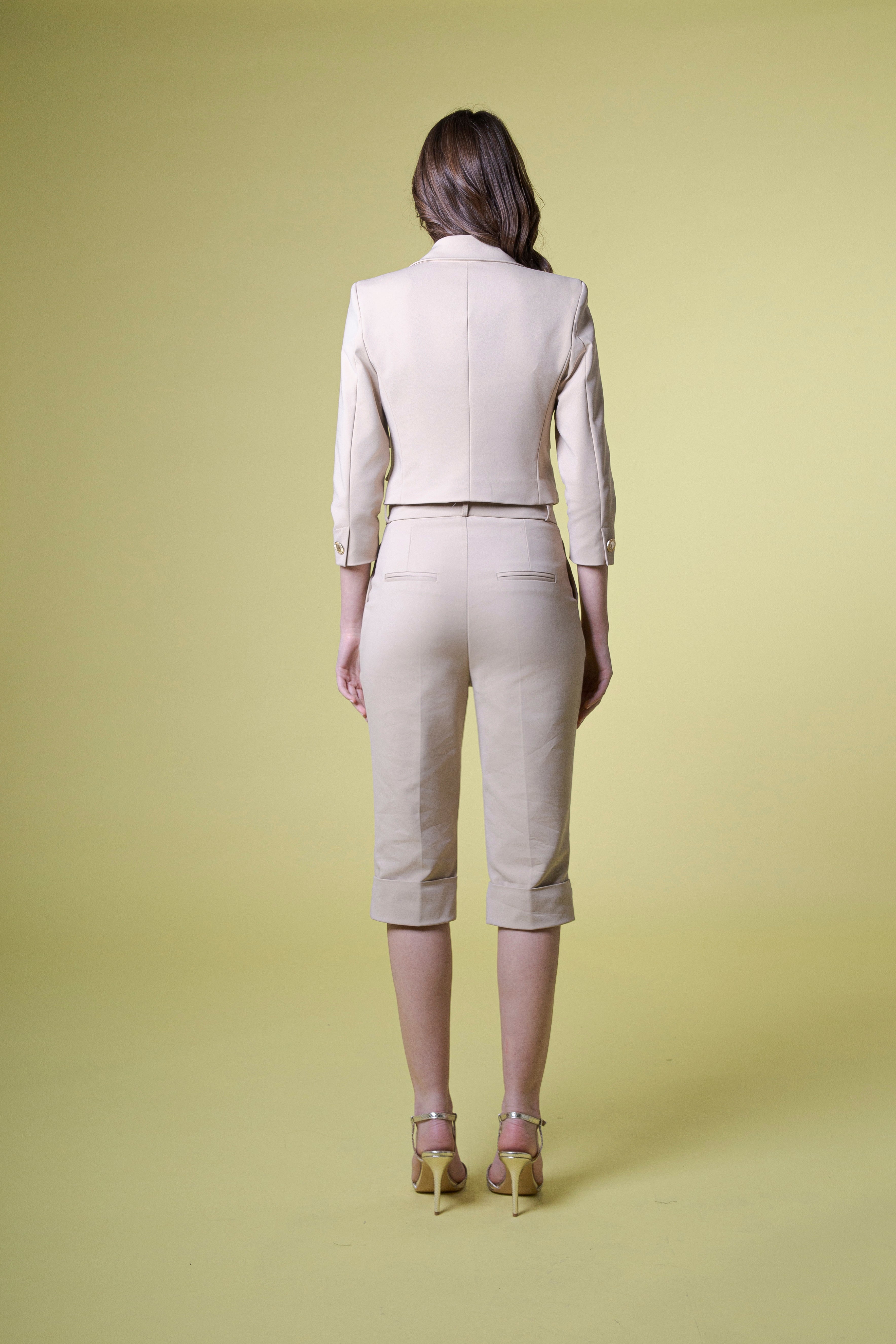 Abbinabile con il bermuda coordinato, questa giacca crop dà vita a un completo sofisticato e moderno. Insieme creano una silhouette armoniosa, giocata su proporzioni studiate e linee essenziali. Il bermuda, con la sua risvolta e le tasche a filetto, dialoga perfettamente con la giacca, dando forma a un look deciso, urbano, incredibilmente chic.