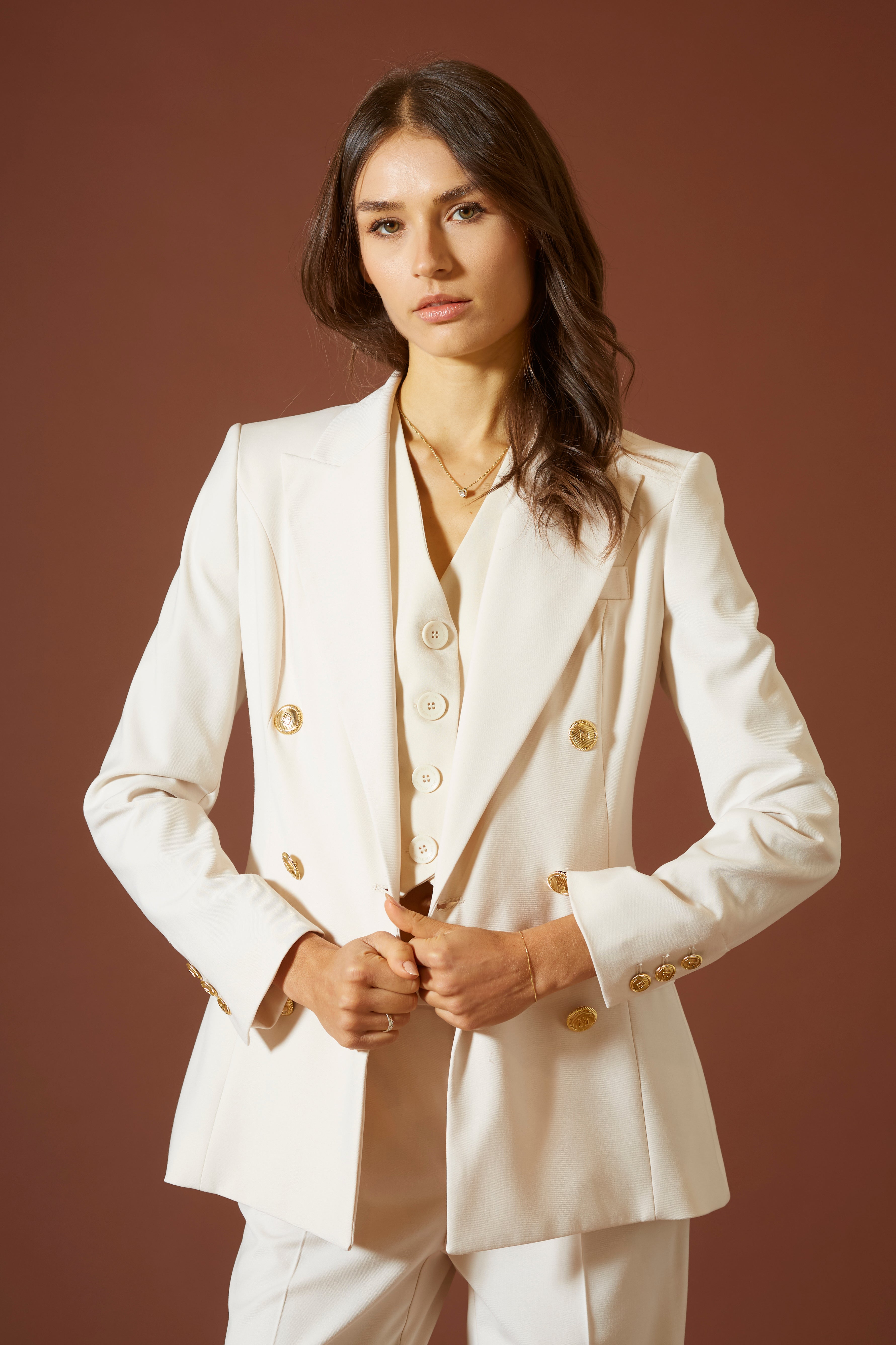 Che fosse abbinata a un pantalone a zampa o a una gonna plissettata, la giacca doppiopetto con bottoni oro FC – Flavio Castellani sapeva sempre raccontare la stessa storia: quella di una donna moderna, elegante senza sforzo, forte nella sua delicatezza.