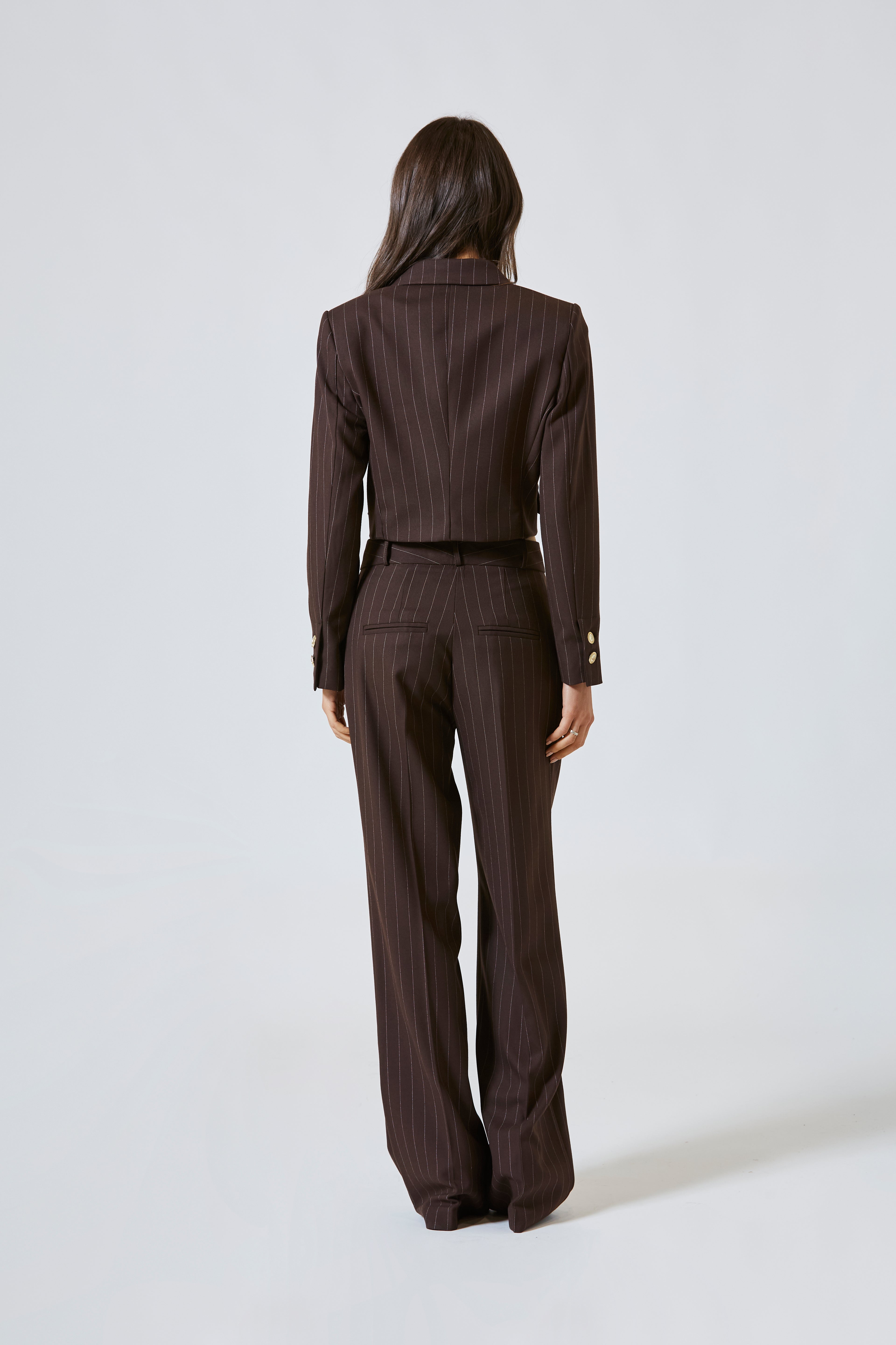 La giacca corta crop doppiopetto gessata firmata Flavio Castellani è un concentrato di eleganza contemporanea e spirito sartoriale, un capo che unisce la precisione del taglio italiano alla forza di una femminilità moderna e consapevole.