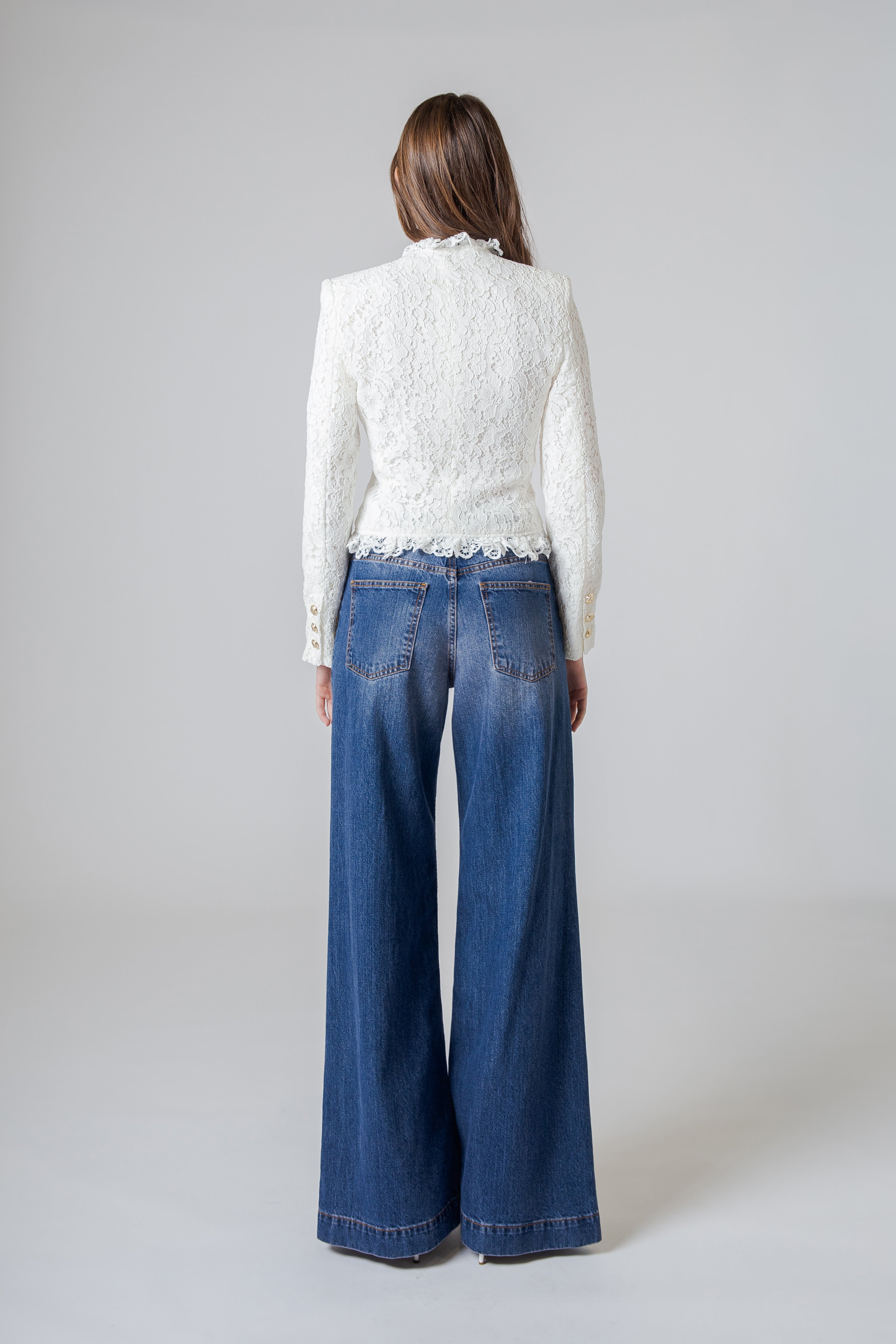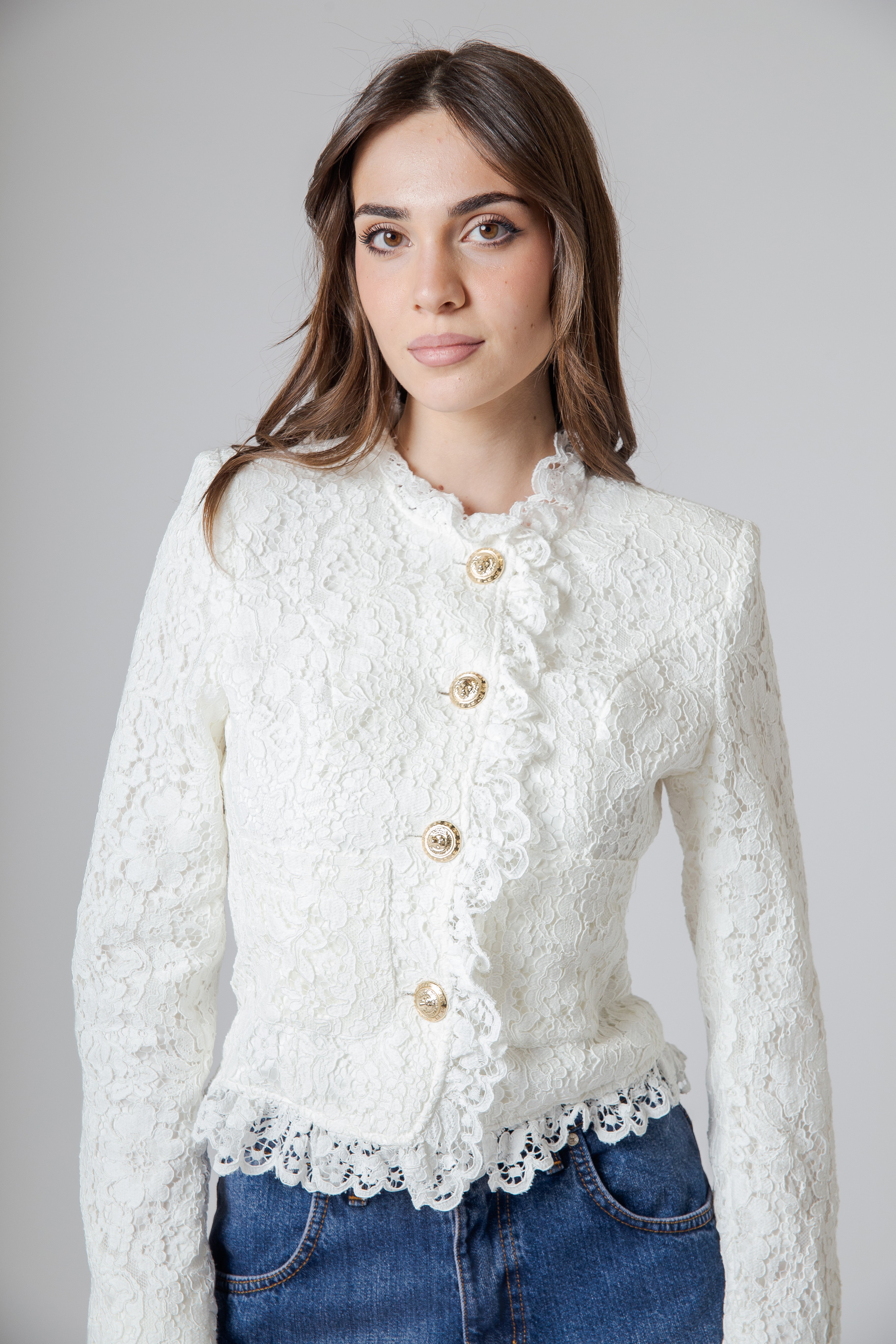 A completare il design troviamo i bottoni oro personalizzati Flavio Castellani, piccoli dettagli luminosi che catturano la luce con discrezione. Il loro riflesso dorato crea un elegante contrasto con la delicatezza del pizzo, trasformando la chiusura della giacca in un vero accento gioiello. Sono elementi che non solo impreziosiscono il capo, ma ne sottolineano anche l’identità e lo stile.
