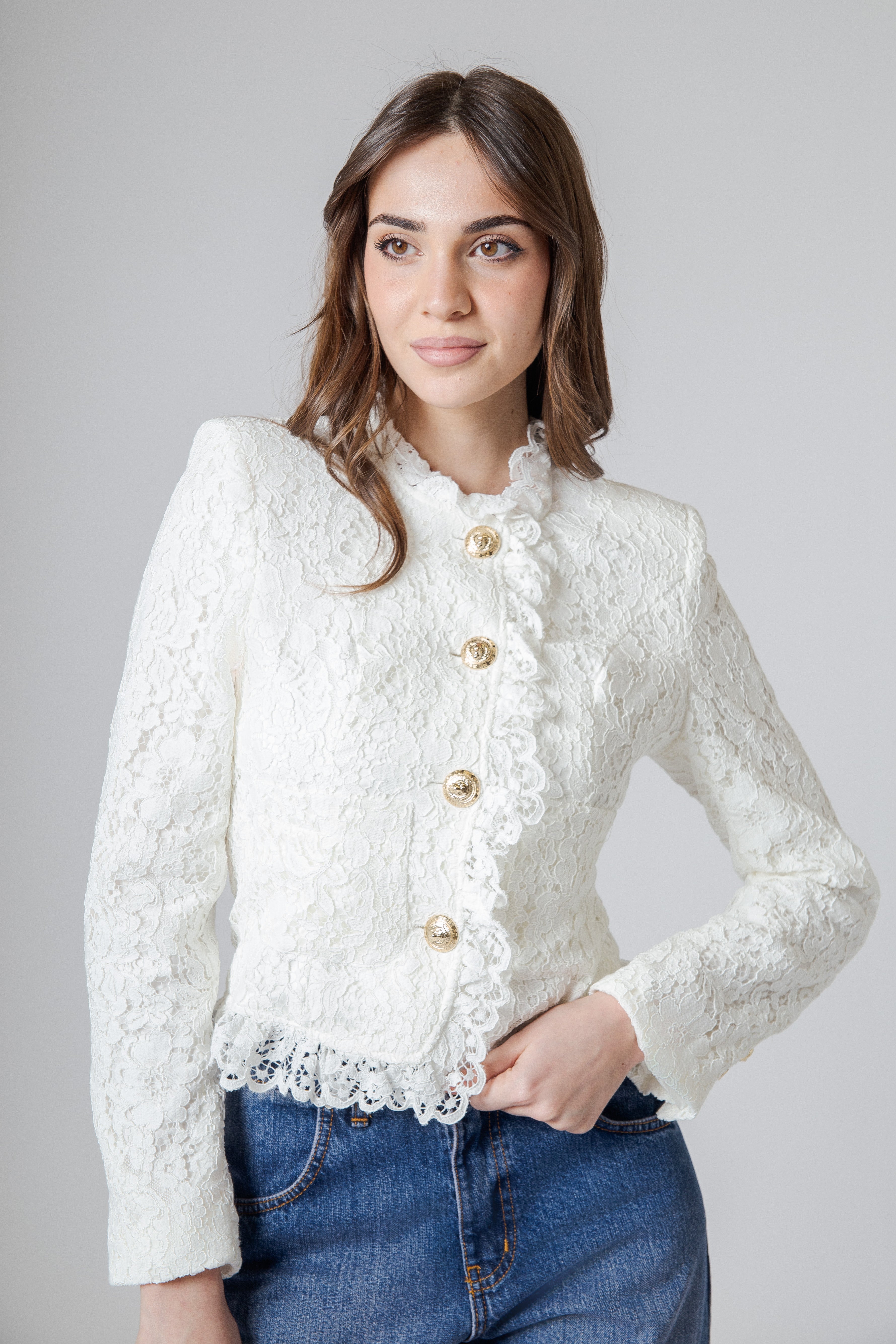 C’è qualcosa di delicato e poetico in una giacca di pizzo: una leggerezza che sembra quasi sospesa, come se il tessuto fosse stato pensato per accarezzare la silhouette con grazia. Questa giacca corta in pizzo nasce proprio da questa idea di femminilità elegante e luminosa, dove ogni dettaglio racconta una storia fatta di raffinatezza e movimento.
