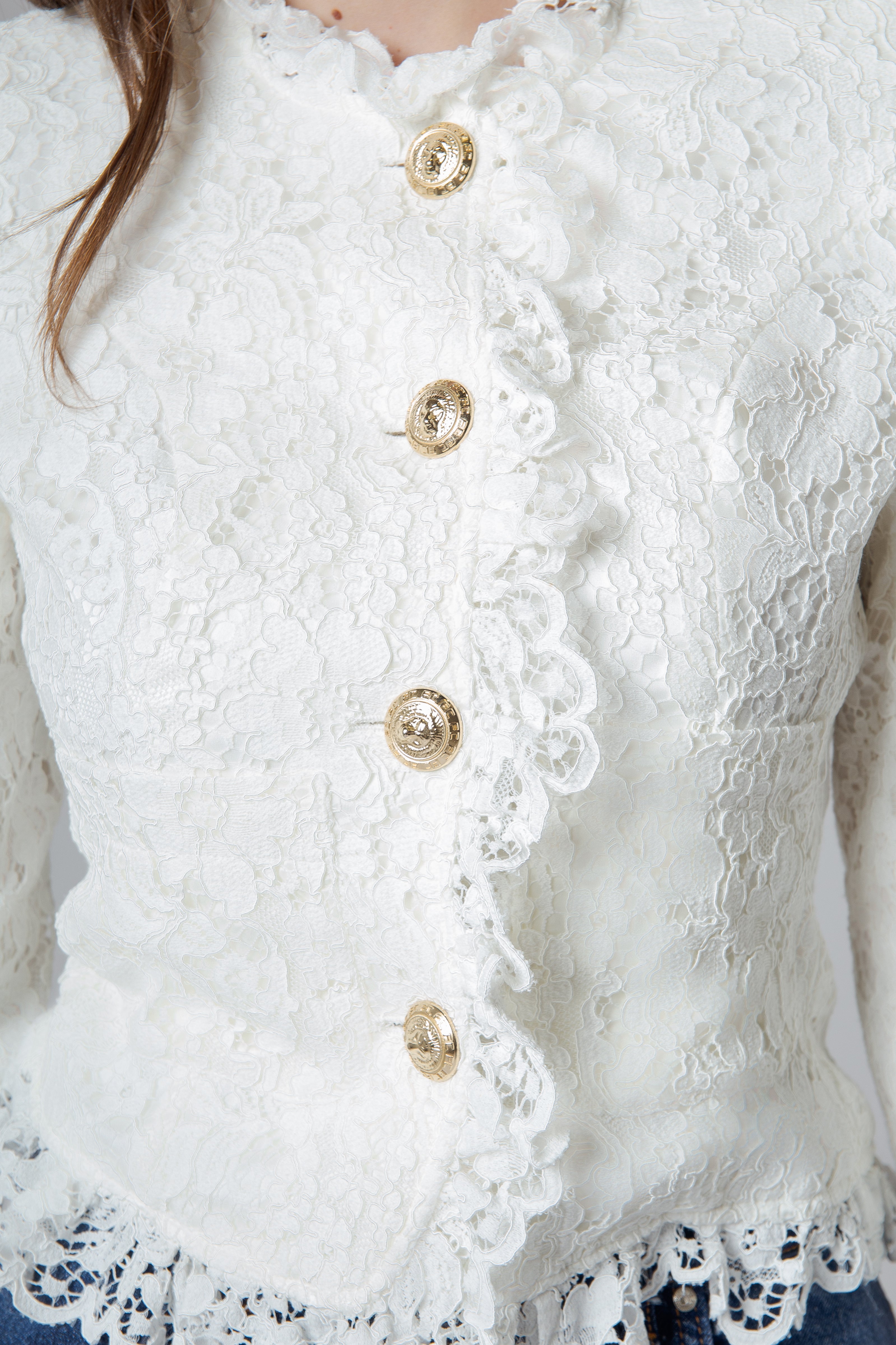 Il risultato è una giacca corta in pizzo con profili di rouches lungo il collo e la vita, impreziosita da bottoni oro personalizzati Flavio Castellani: un capo romantico, elegante e luminoso, dove la leggerezza del pizzo e la grazia dei dettagli si incontrano per creare una femminilità raffinata e senza tempo.