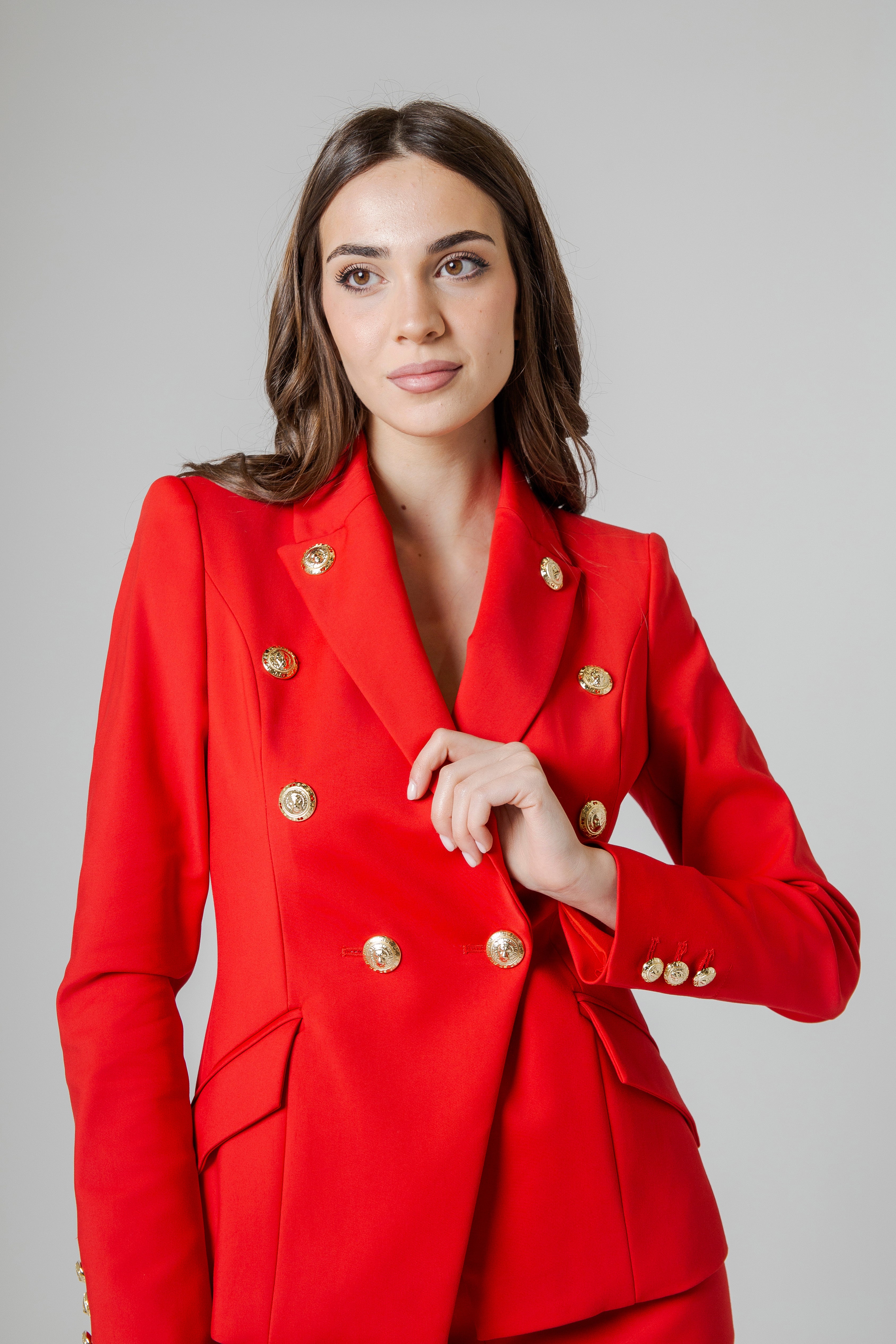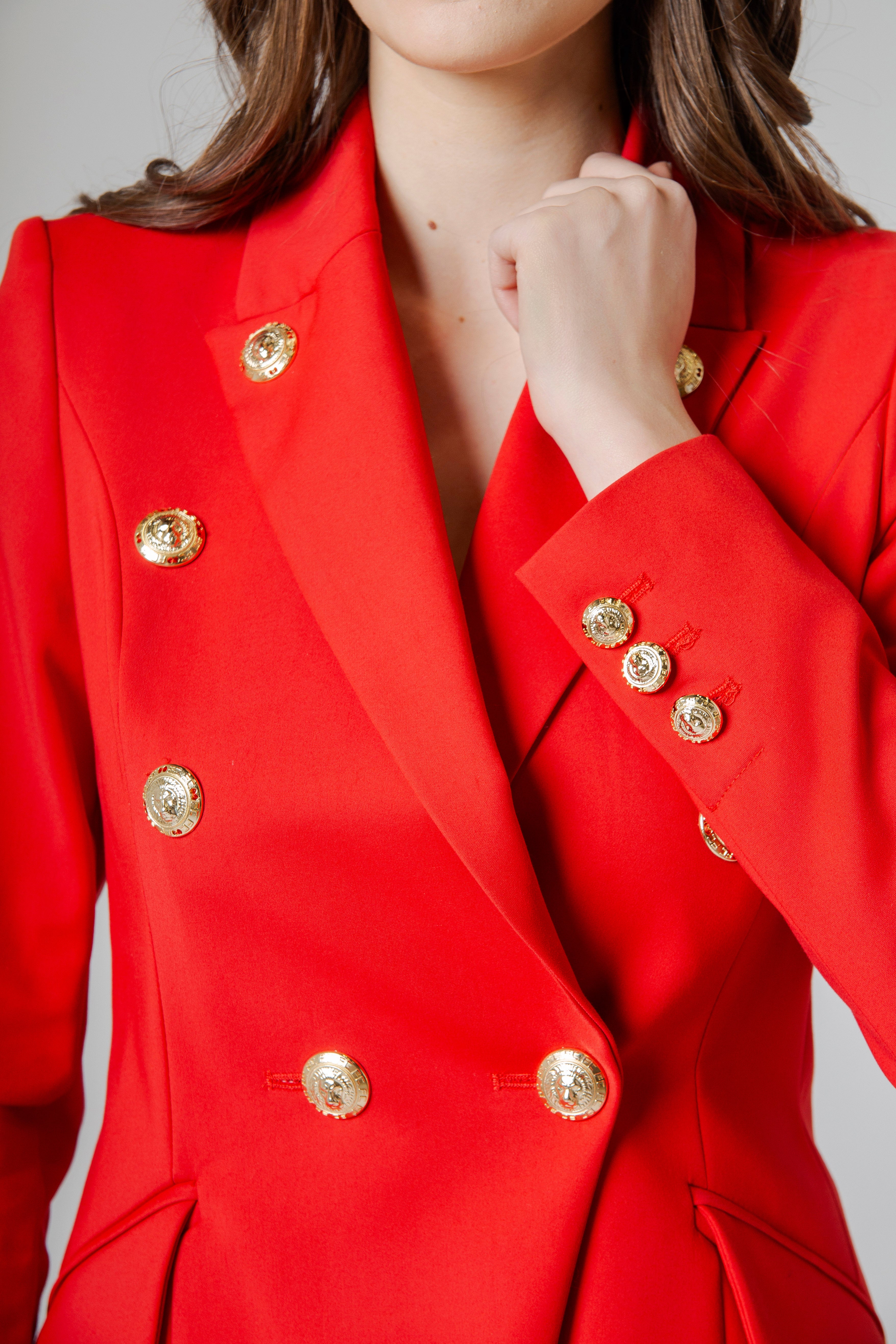 Il design doppiopetto conferisce autorevolezza e presenza scenica, richiamando la tradizione classica del tailoring, reinterpretata con uno sguardo attuale e audace. Sul davanti, i bottoni oro personalizzati FC Flavio Catellani brillano come gioielli sartoriali: dettagli iconici che catturano la luce e raccontano un’identità forte, esclusiva, fatta di ricercatezza e carattere. Ogni bottone diventa un simbolo, un segno distintivo che impreziosisce la giacca senza mai appesantirla.