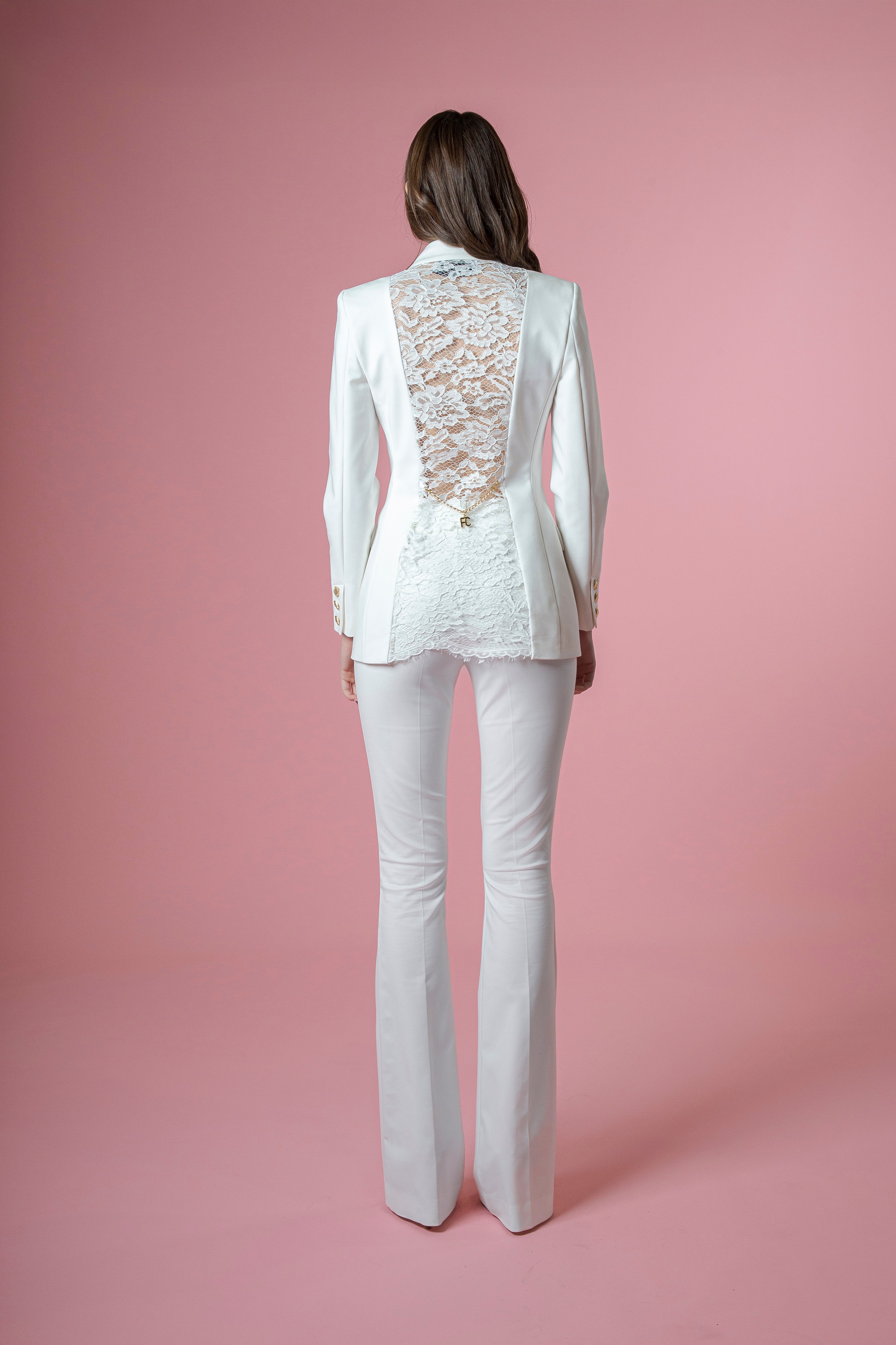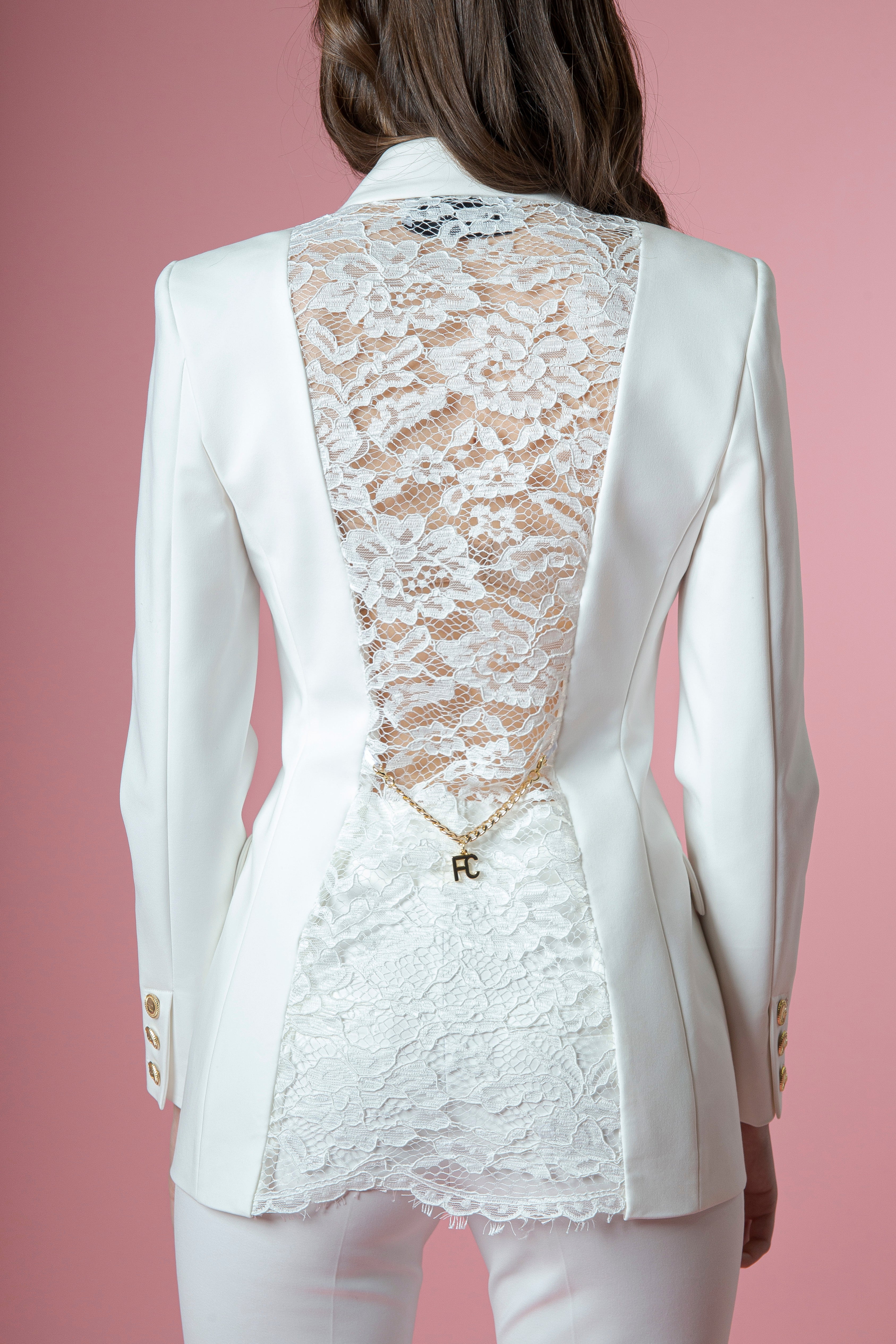 Ma è sul retro che la giacca rivela la sua anima più affascinante: lungo tutta la schiena corre un raffinato inserto in pizzo, delicato e sensuale, che crea un contrasto magnetico con la struttura sartoriale del davanti. Il pizzo lascia intravedere, suggerisce, alleggerisce la linea, trasformando la giacca in un capo di forte impatto scenico.