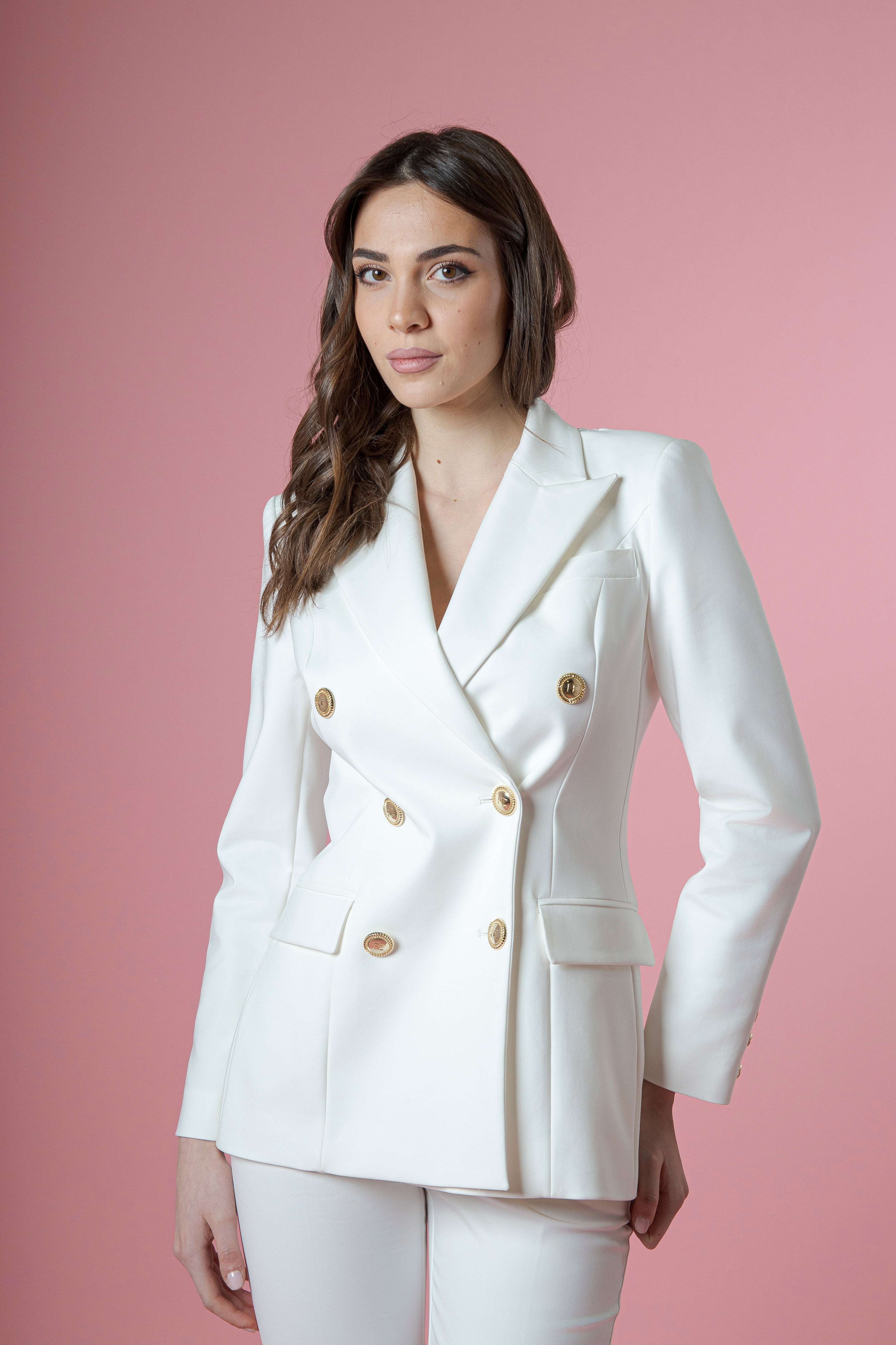 A impreziosire ulteriormente il retro, l’applicazione gioiello oro FC, un dettaglio luminoso e ricercato che cattura lo sguardo e firma il capo come una vera creazione couture. Un elemento prezioso che rende la giacca unica, esclusiva, pensata per chi ama distinguersi con eleganza audace.