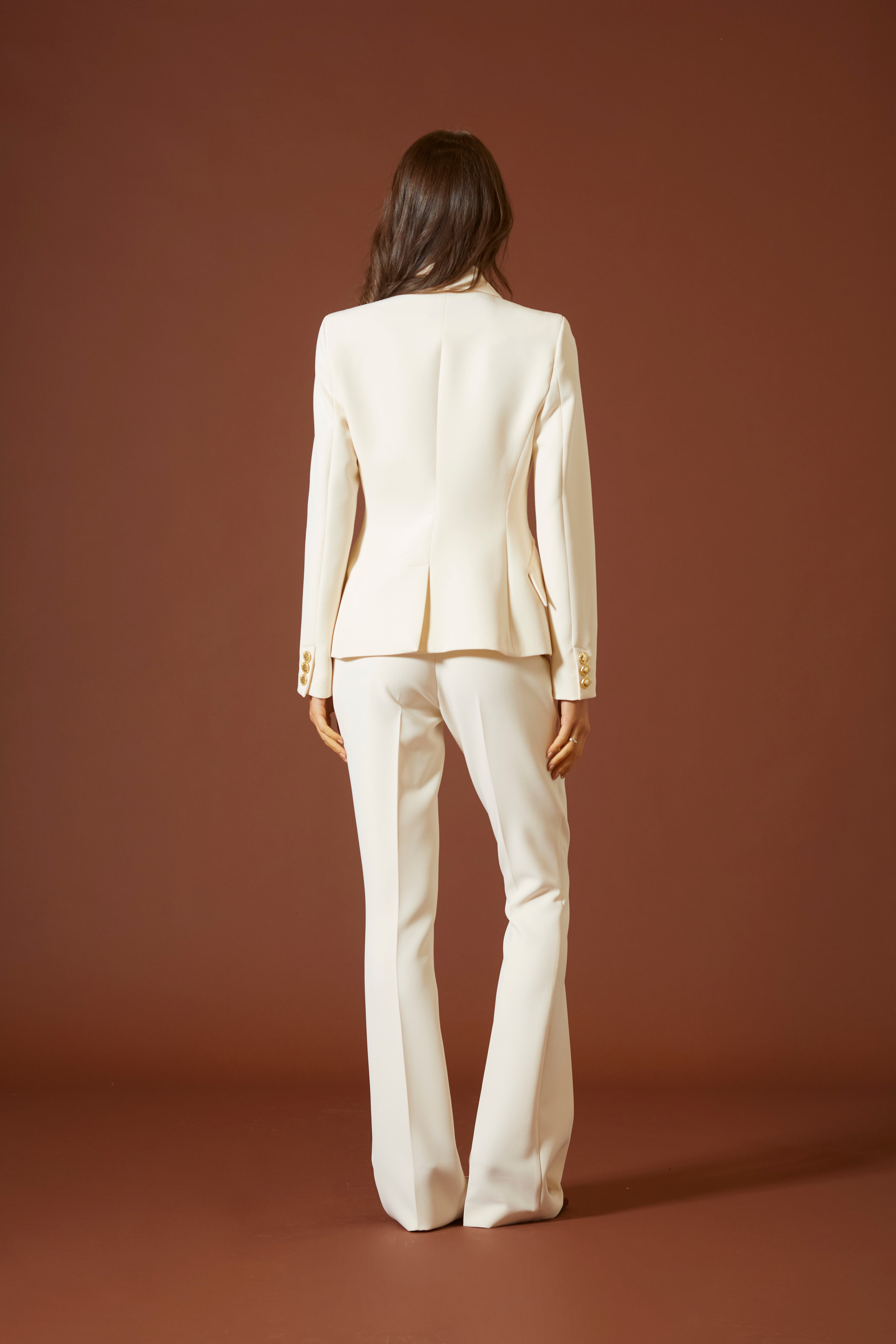 Il taglio della giacca, pulito e deciso, valorizzava le spalle e stringeva leggermente in vita, disegnando una figura armoniosa, elegante e determinata. Il tessuto — compatto, avvolgente, di qualità sartoriale — conservava quella struttura perfetta che permette al capo di mantenere la sua forma, pur adattandosi al corpo con naturalezza.