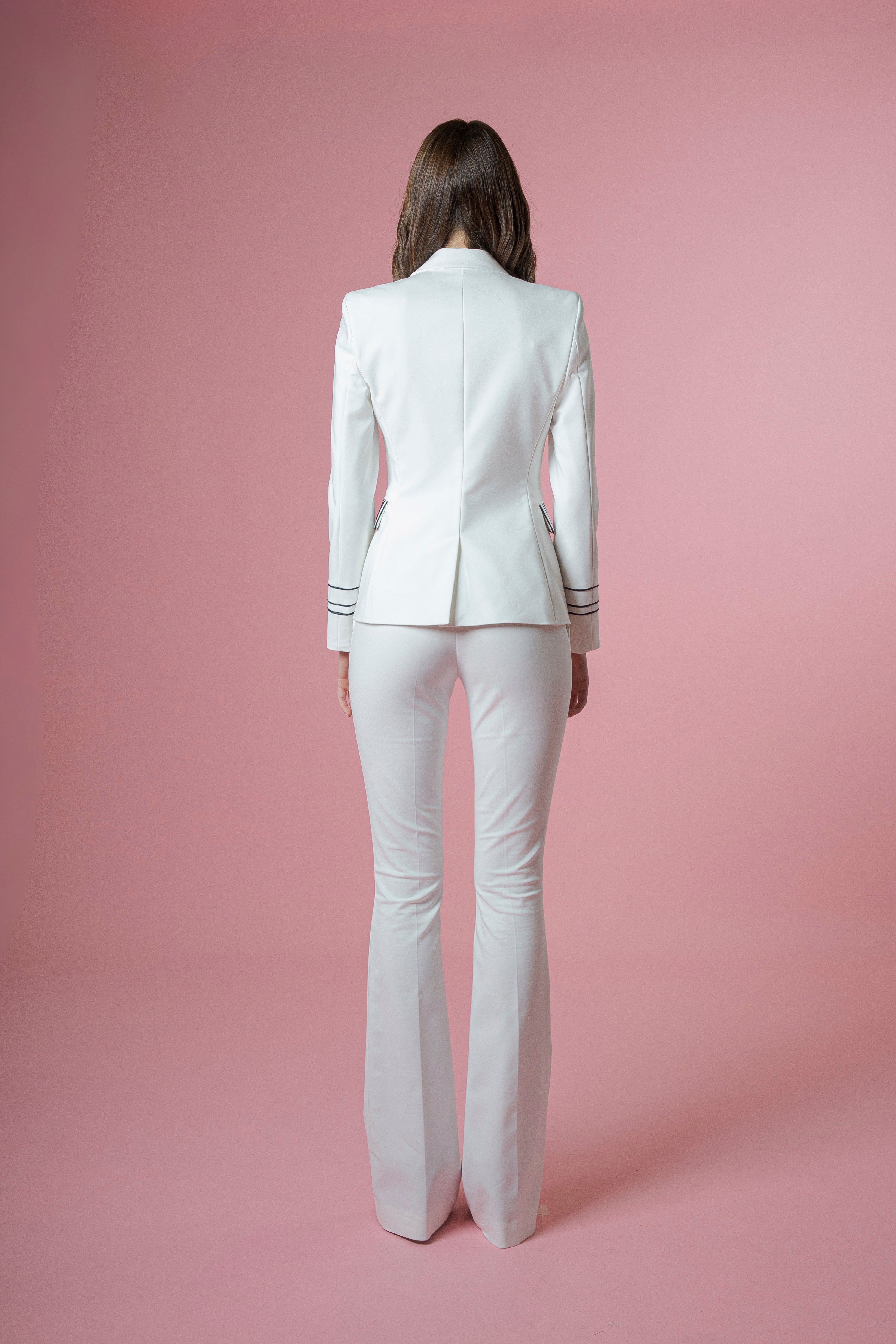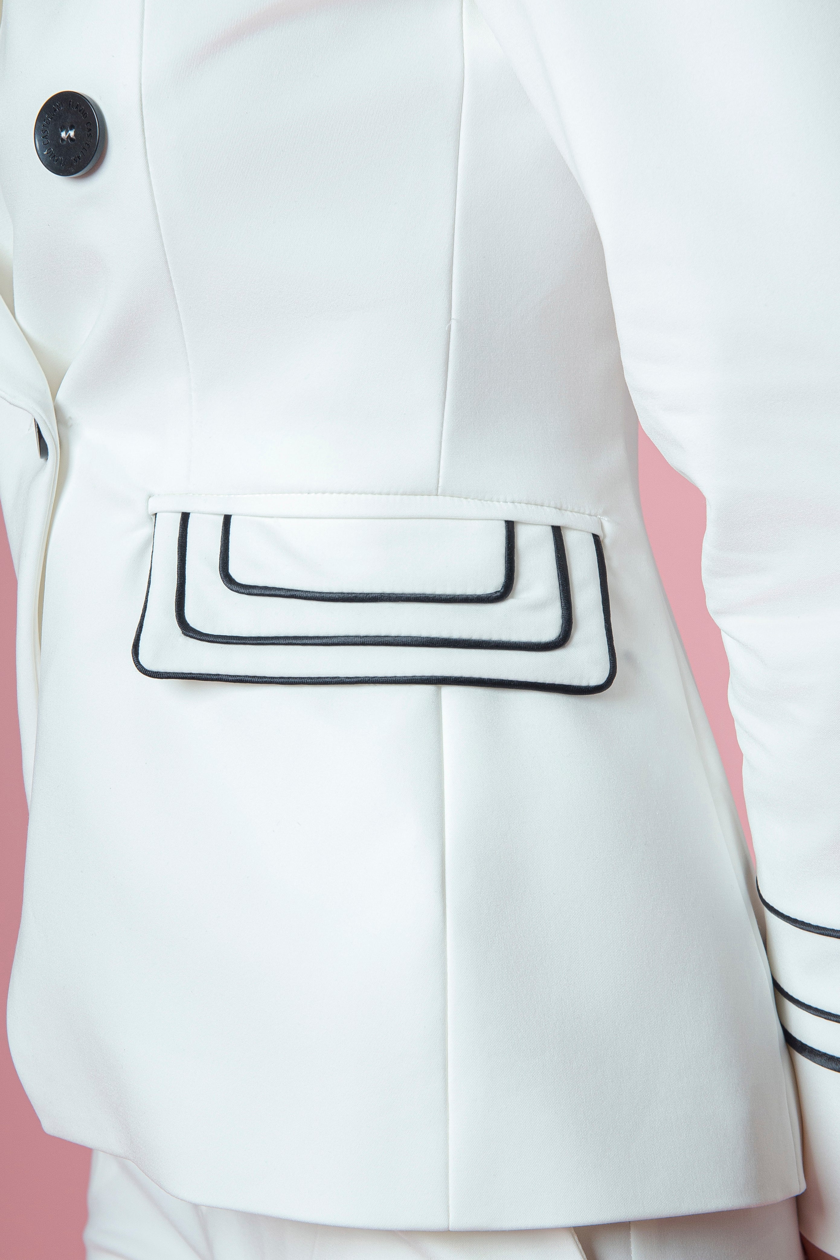 Il contrasto cromatico non è mai eccessivo: è calibrato, elegante, studiato per dare profondità e personalità alla giacca senza comprometterne la raffinatezza. È una giacca che parla di stile consapevole, di una donna che sceglie il dettaglio come forma di espressione.