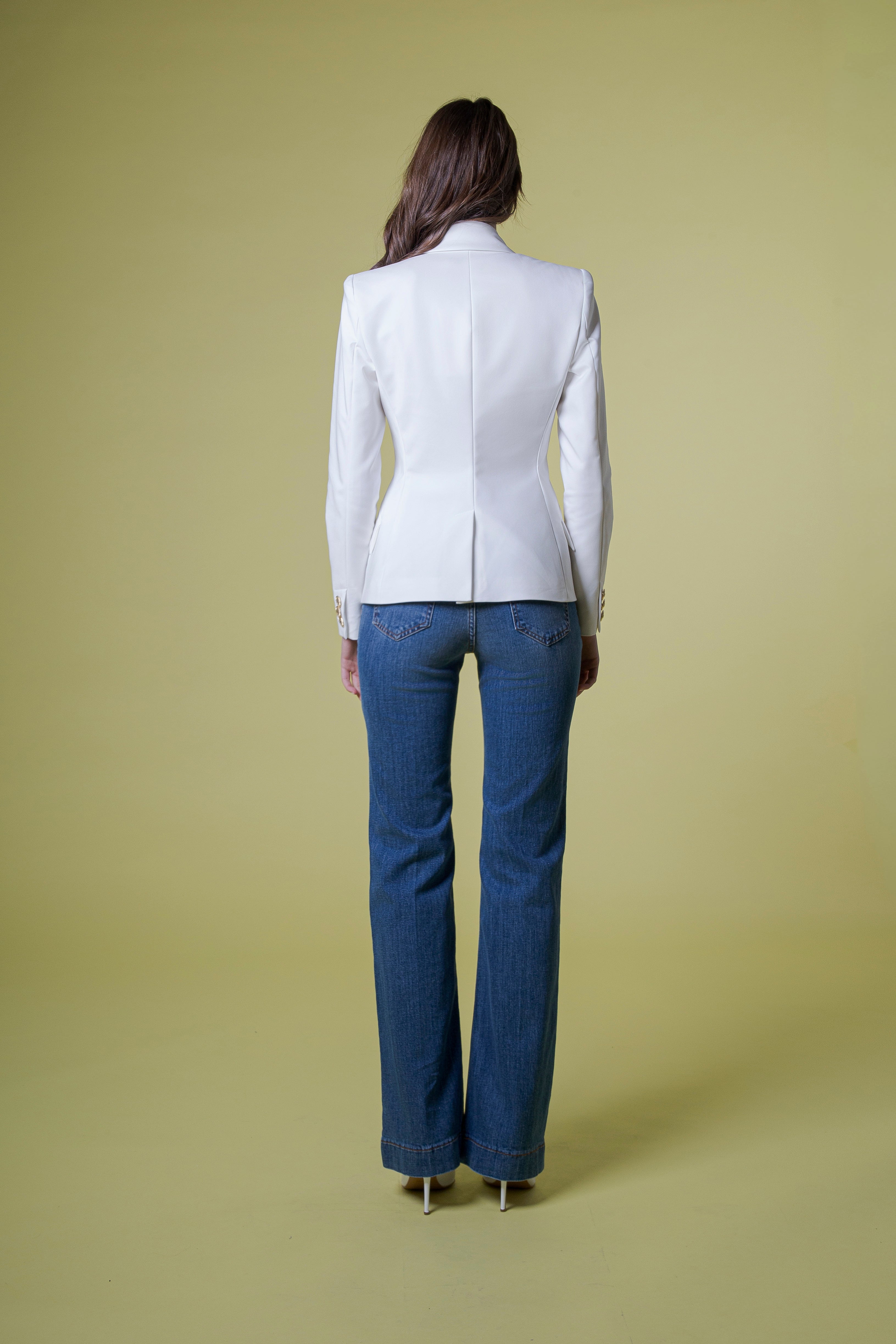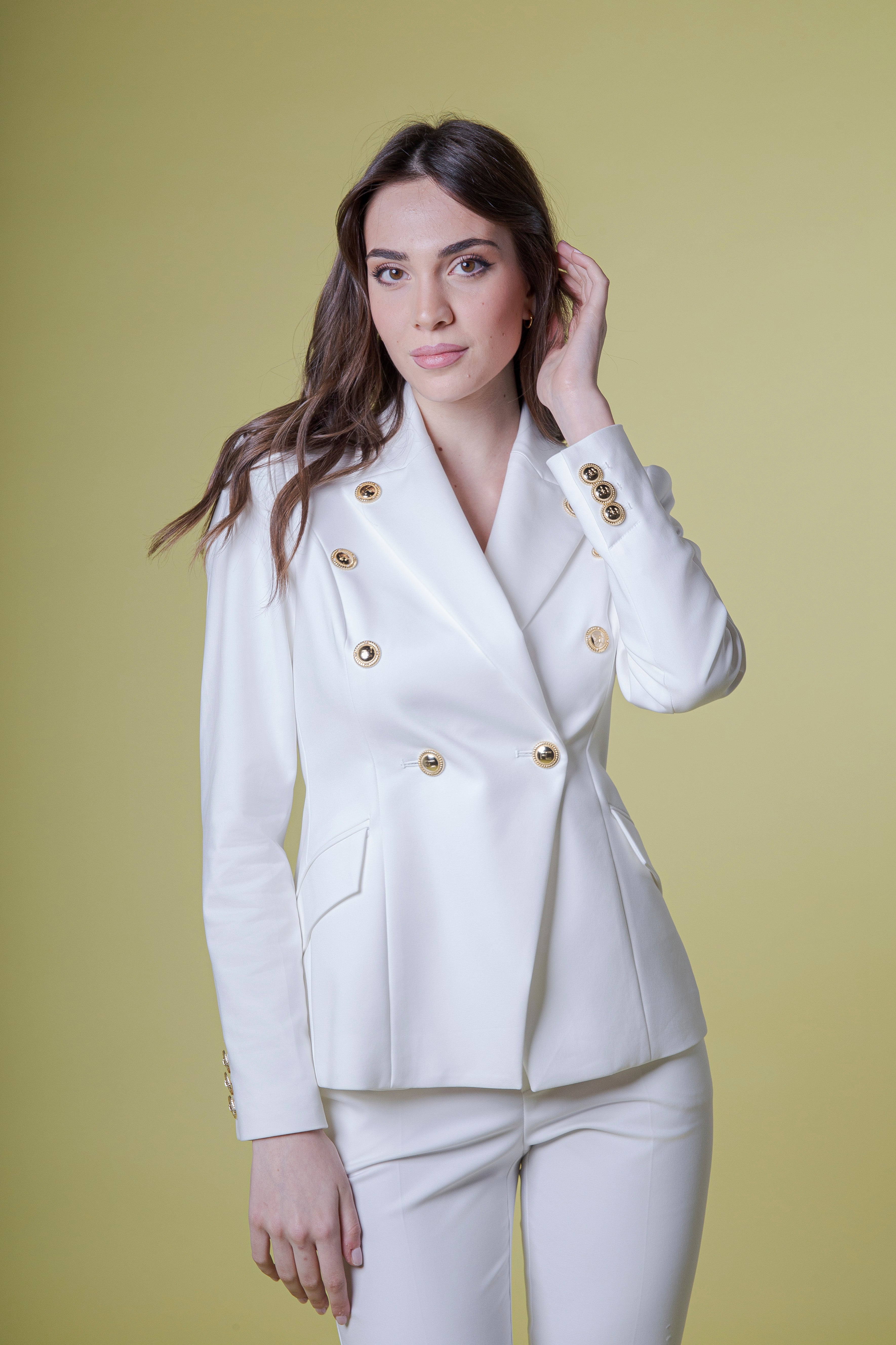 Il design doppiopetto conferisce autorevolezza e presenza scenica, richiamando la tradizione classica del tailoring, reinterpretata con uno sguardo attuale e audace. Sul davanti, i bottoni oro personalizzati FC Flavio Catellani brillano come gioielli sartoriali: dettagli iconici che catturano la luce e raccontano un’identità forte, esclusiva, fatta di ricercatezza e carattere. Ogni bottone diventa un simbolo, un segno distintivo che impreziosisce la giacca senza mai appesantirla.