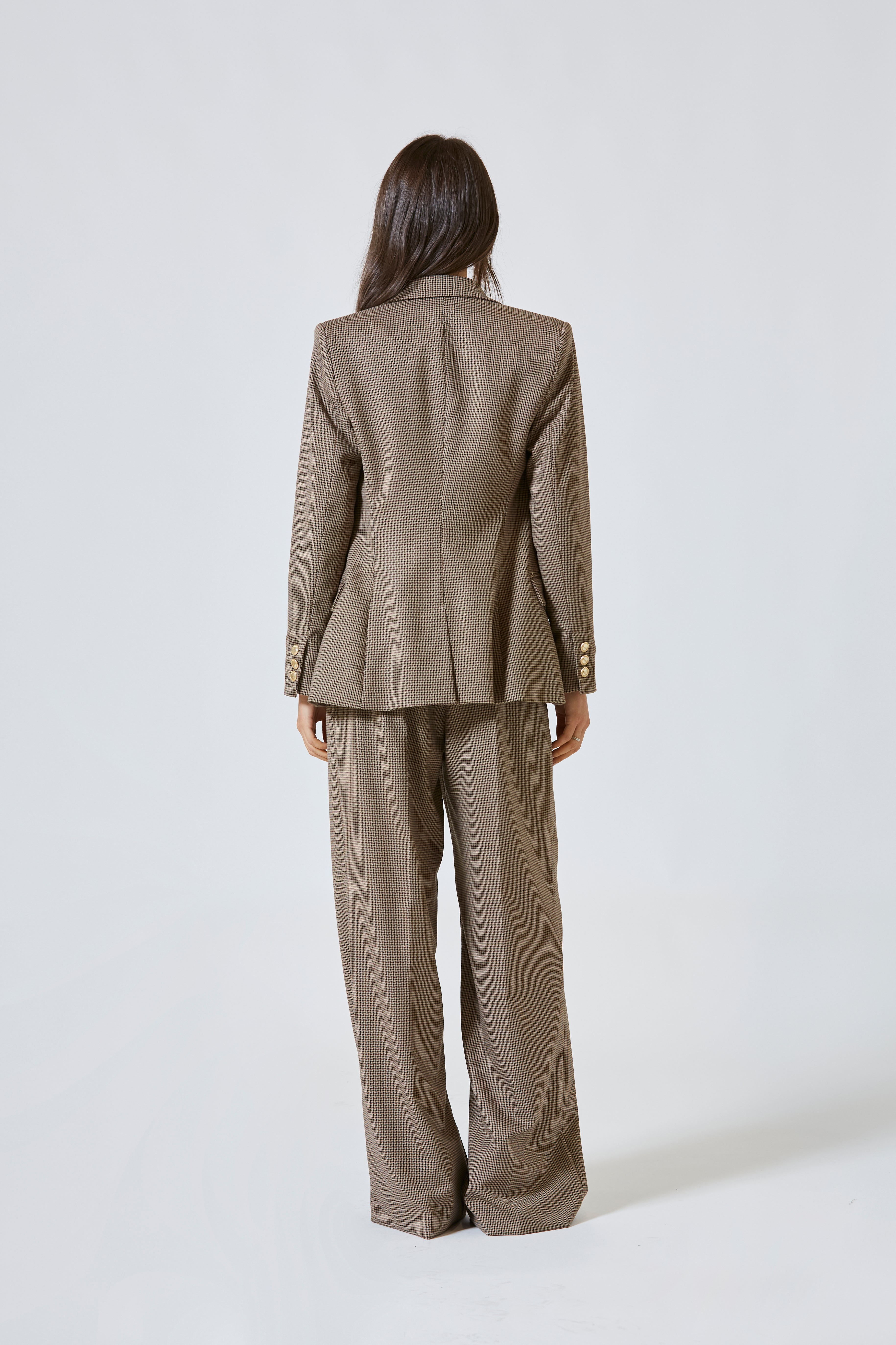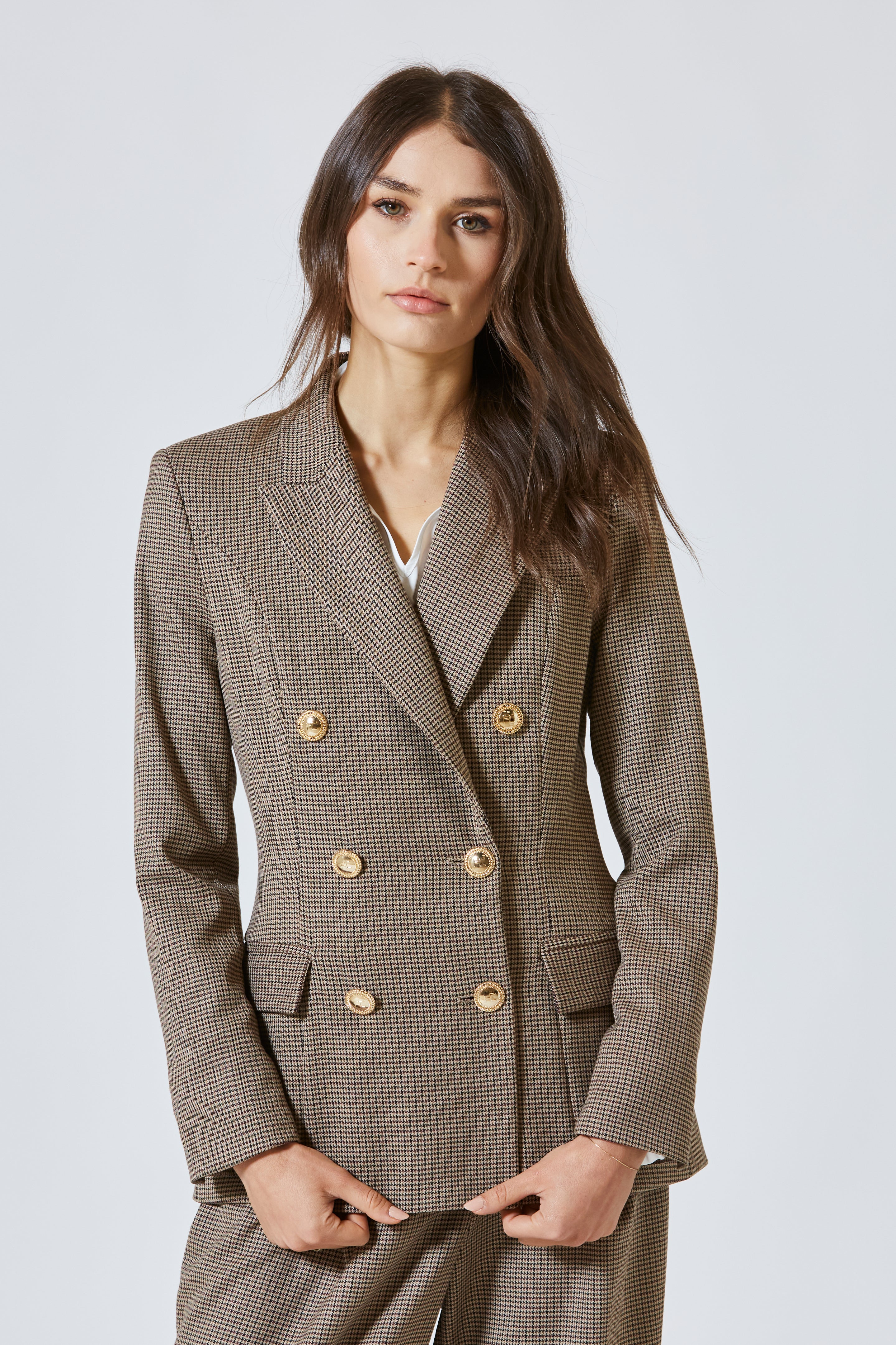 I bottoni dorati illuminano il davanti con discreta preziosità, diventando dettagli iconici che esaltano il carattere deciso della giacca. La linea doppiopetto valorizza la silhouette, scolpendo spalle e vita con armonia, mentre la vestibilità studiata regala un comfort sorprendente, perfetto per la donna moderna che ama eleganza e praticità insieme.