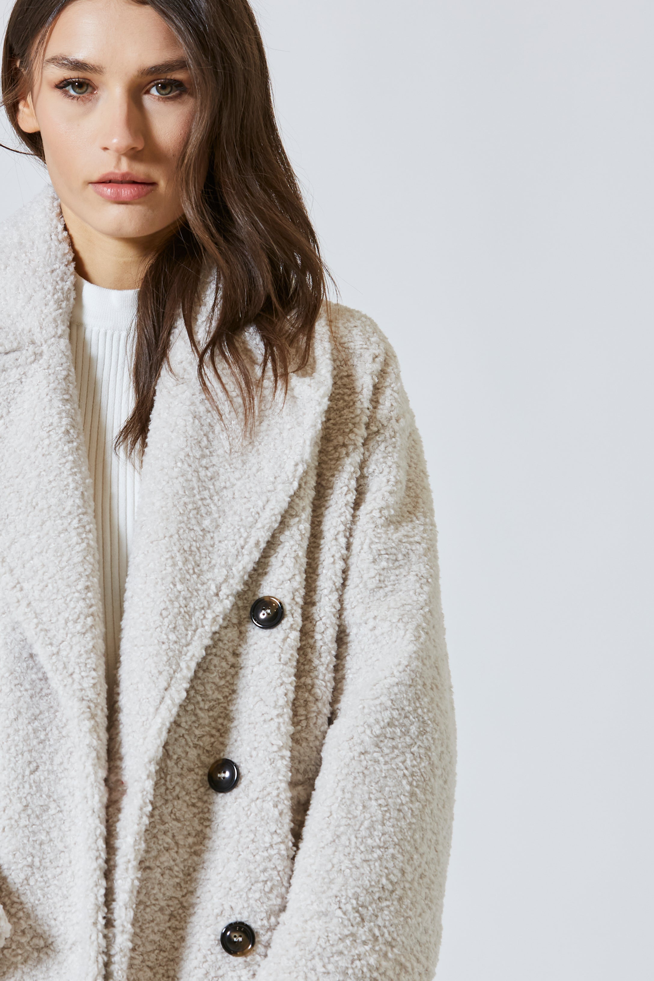 Ma è l’ecopelliccia riccia il cuore emotivo del cappotto: morbida, folta, avvolgente, compare spesso a incorniciare il collo ampio, oppure come inserto su maniche e bordi, regalando al capo un aspetto caldo, lussuoso e accogliente. La pelliccia, rigorosamente eco, è realizzata con materiali di alta qualità, dall’aspetto autentico e sofisticato, capace di trasformare ogni gesto — anche il più semplice — in un momento di stile.
