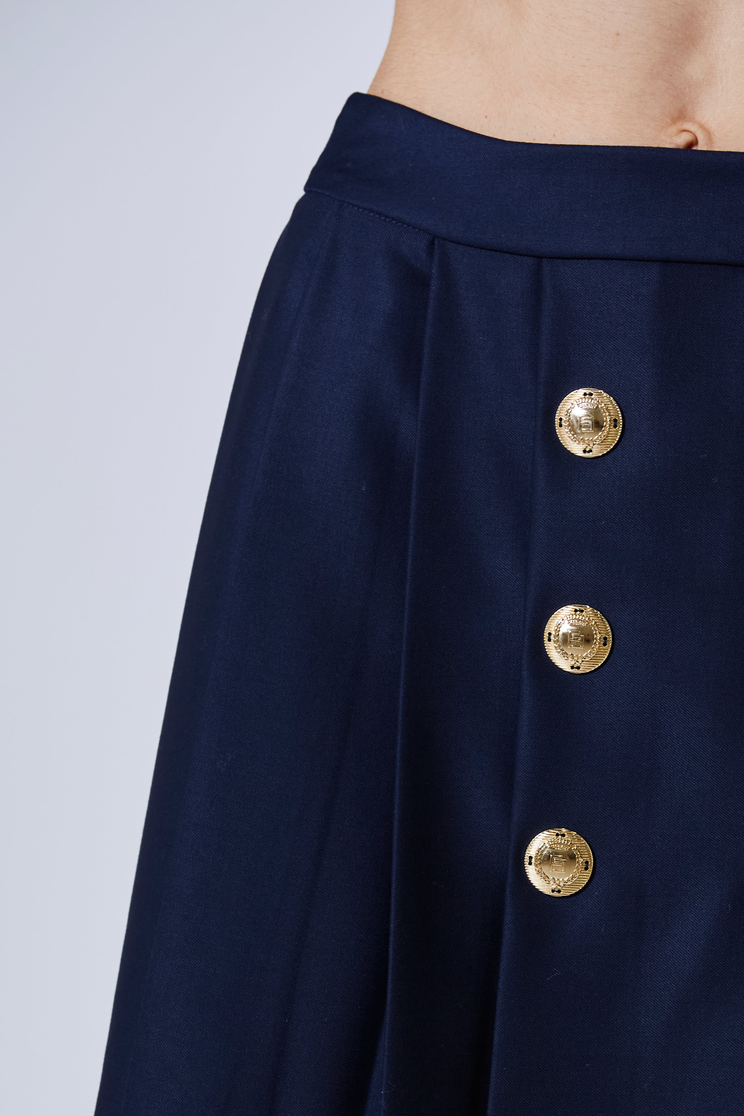 Sul davanti, a scandire il taglio come una marcatura di stile, corre un doppio petto di bottoni oro, firmati Flavio Castellani.