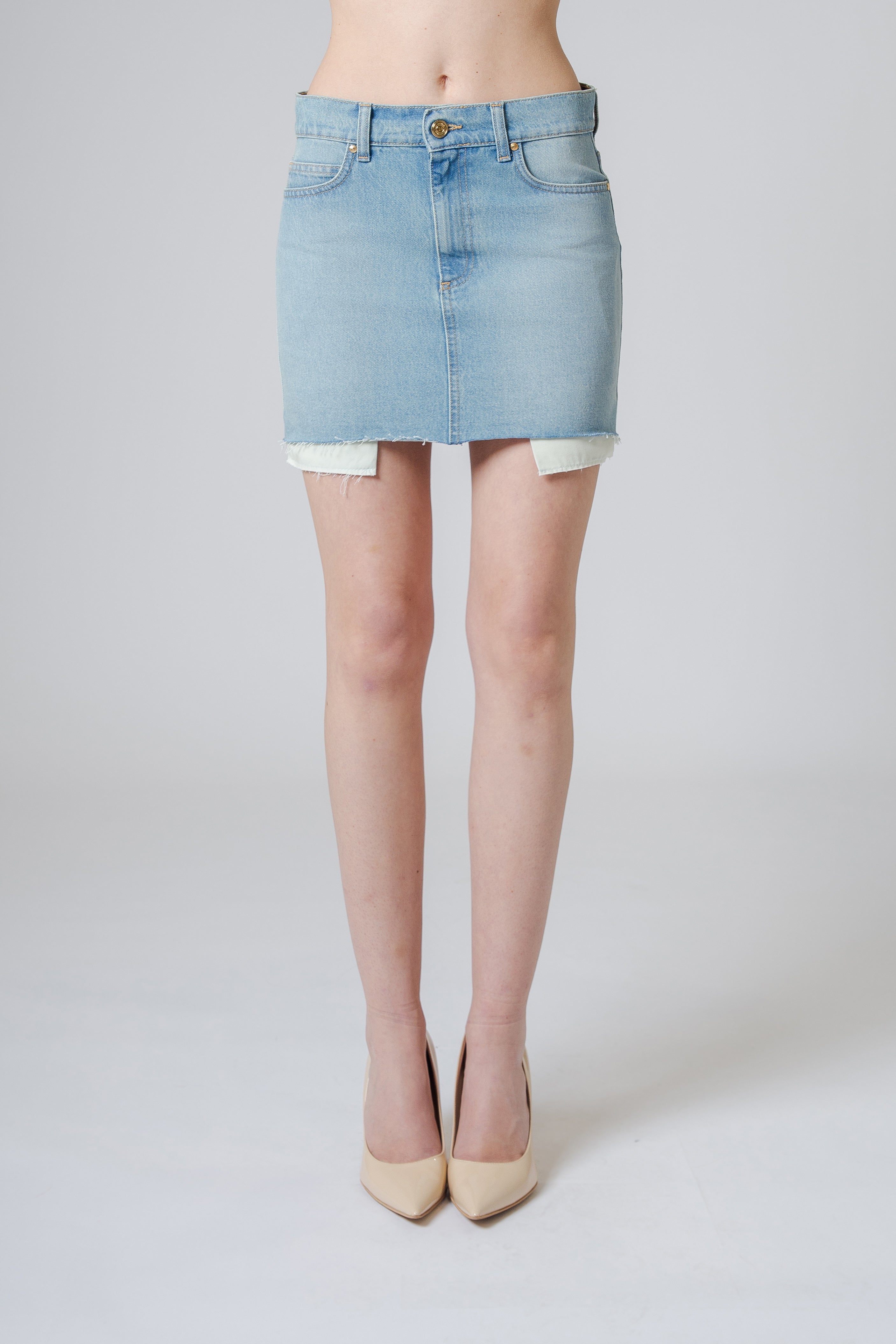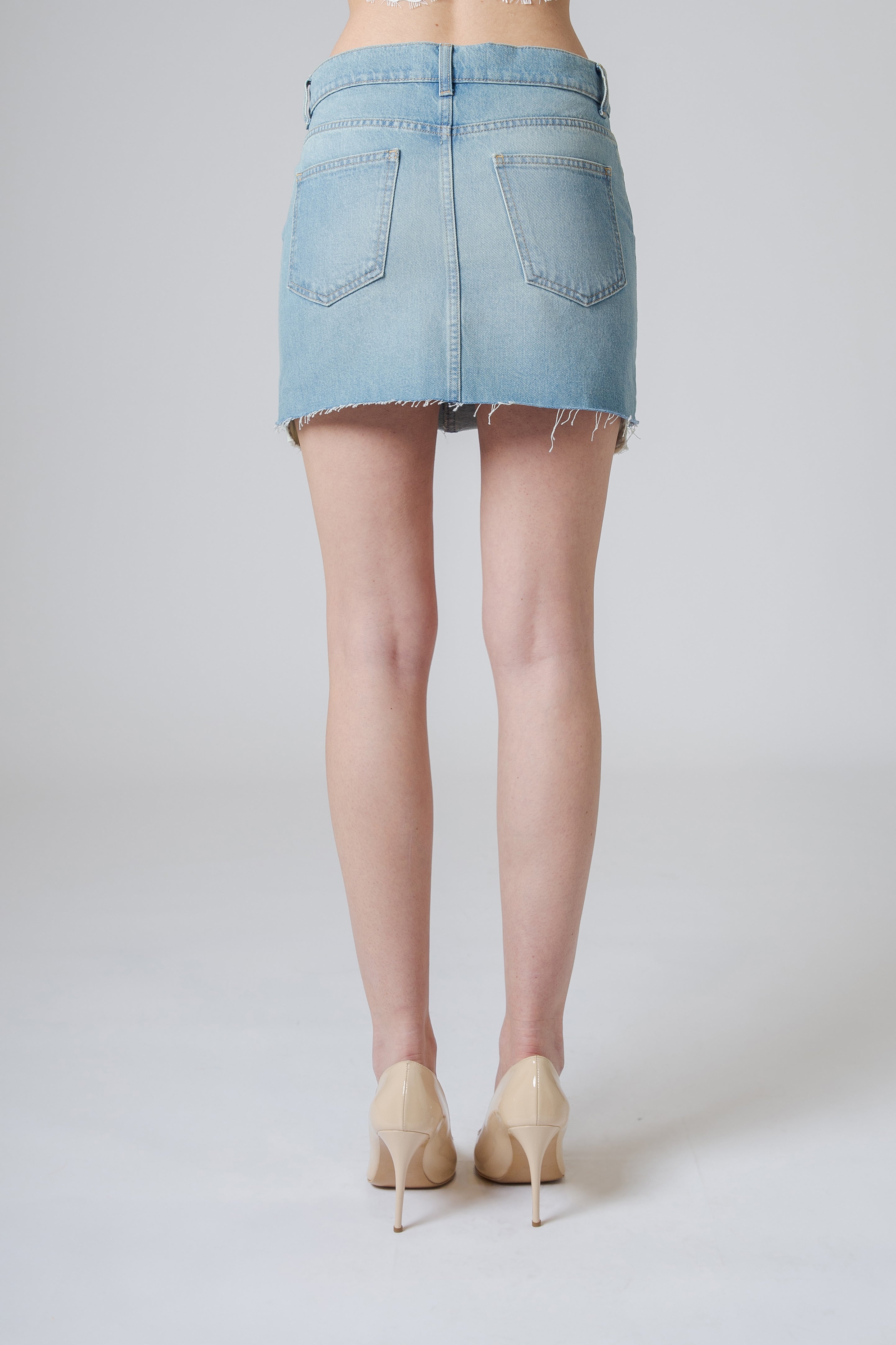 Uno dei dettagli più distintivi è il taglio vivo sul fondo, che introduce un elemento leggermente grintoso e moderno. Il bordo non rifinito crea un contrasto interessante con la struttura ordinata della gonna, aggiungendo un tocco casual che esalta l’anima denim del capo.