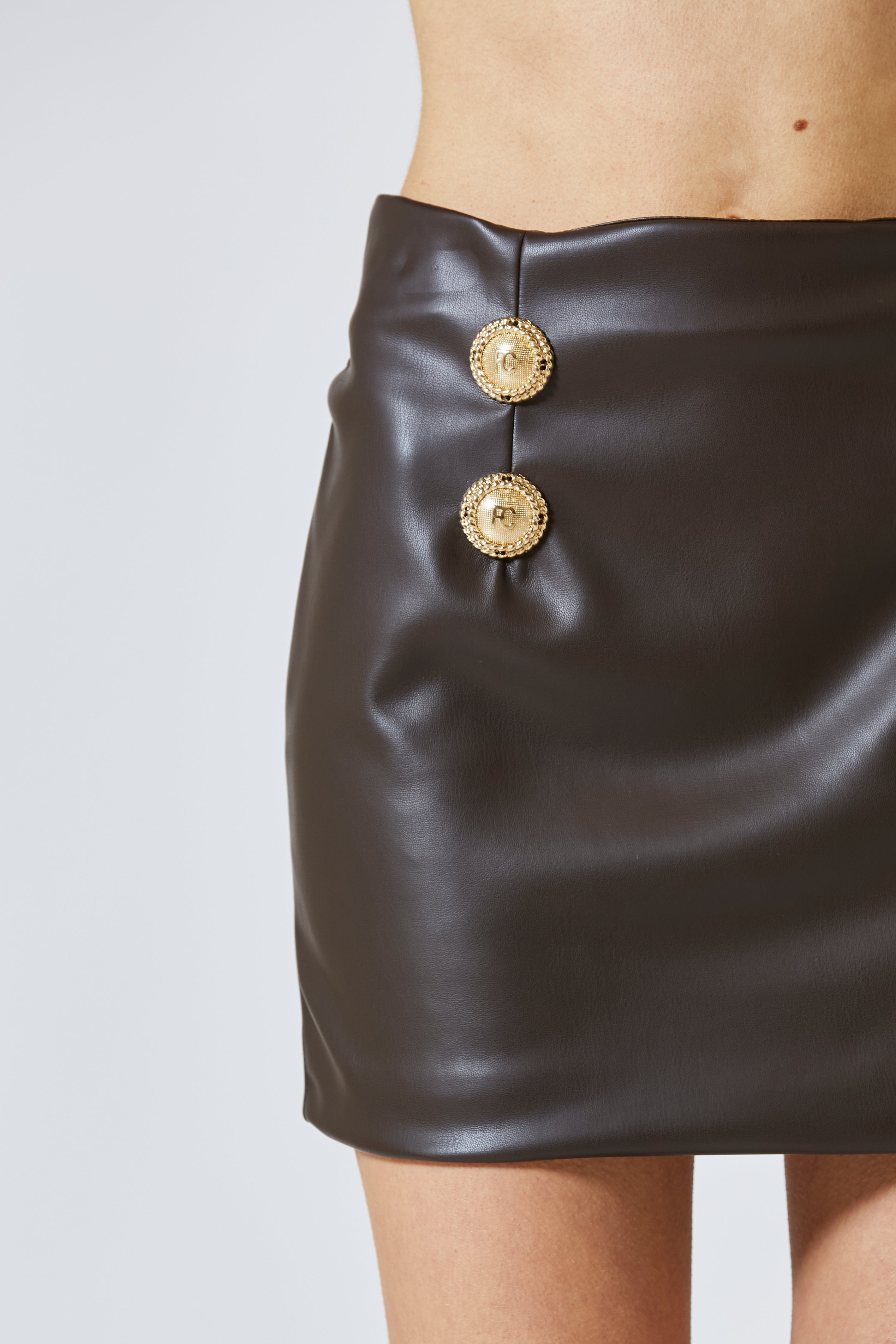 Realizzata in una ecopelle lucida, profonda, avvolgente, la gonna disegna il corpo con precisione sartoriale, seguendo la curva dei fianchi e fermandosi appena sopra le cosce, come un frammento di carattere ritagliato nel tessuto. Non scivola, non ondeggia: sta ferma, decisa, come se conoscesse già il proprio effetto.