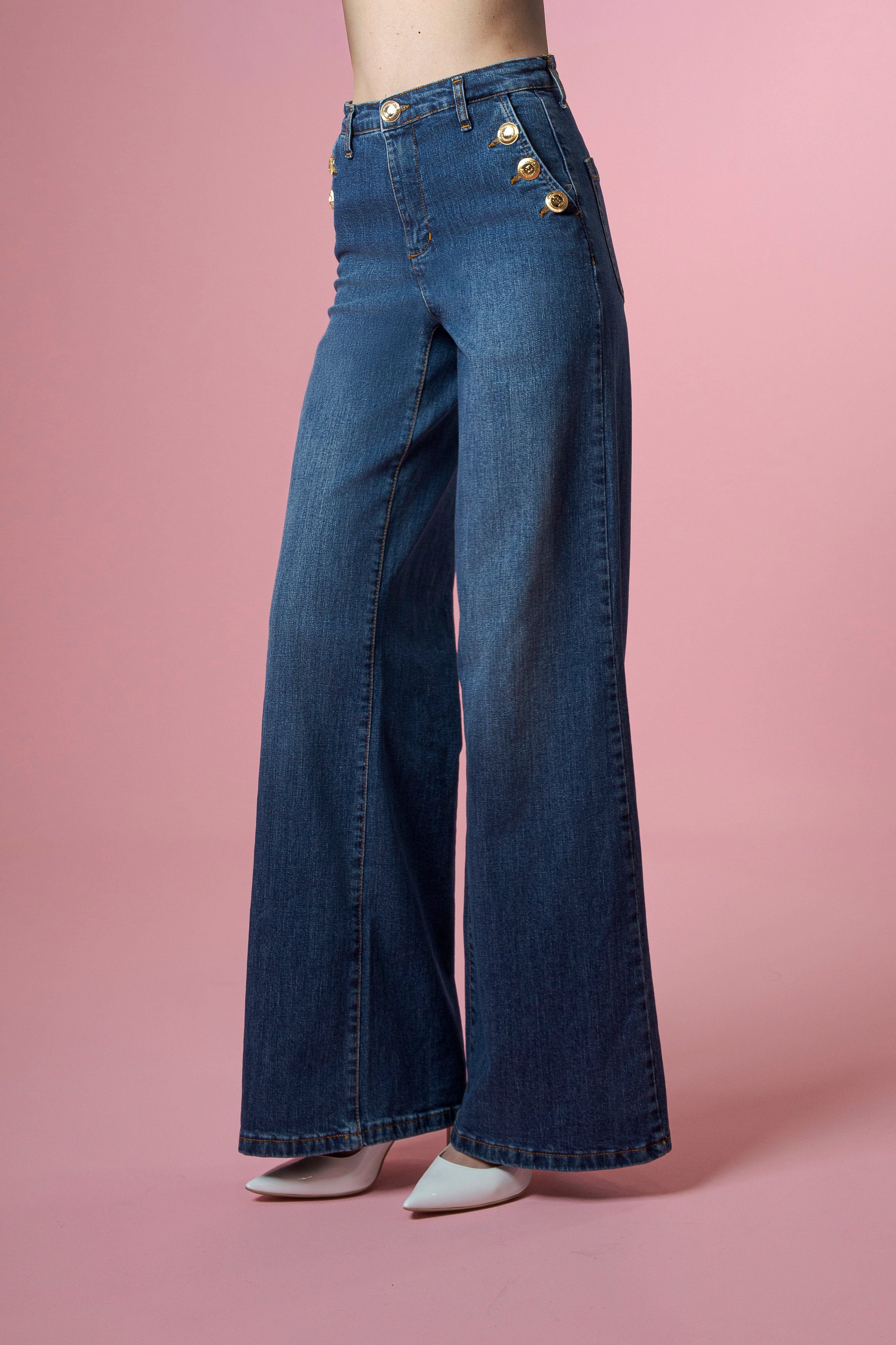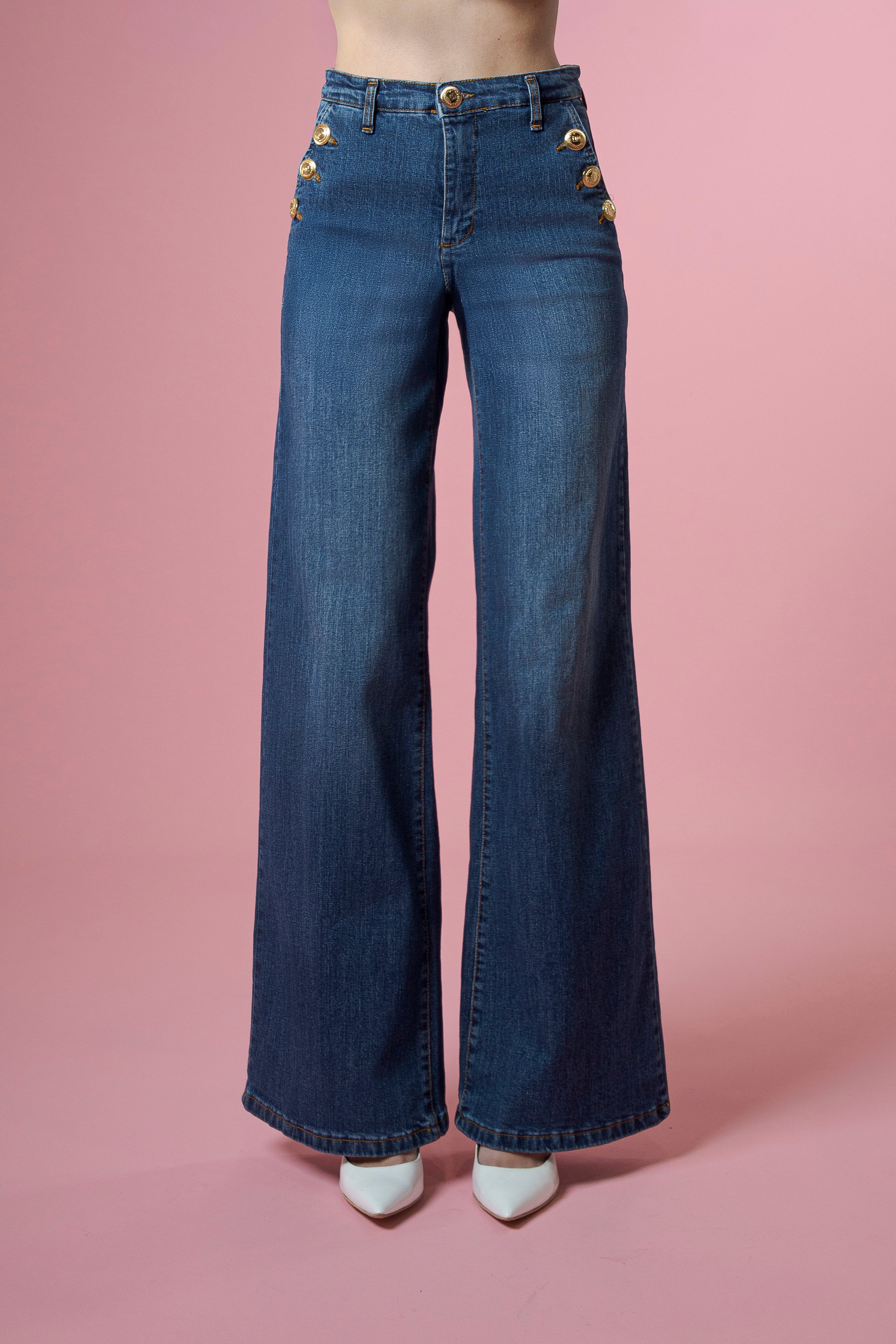 Le tasche anteriori diventano il punto focale del design, impreziosite da bottoni oro personalizzati Flavio Castellani, veri accenti di luce che illuminano il capo e ne sottolineano l’identità esclusiva. Il contrasto tra la matericità del jeans e la brillantezza dell’oro crea un equilibrio raffinato, trasformando un capo iconico del guardaroba in una dichiarazione di stile ricercata.
