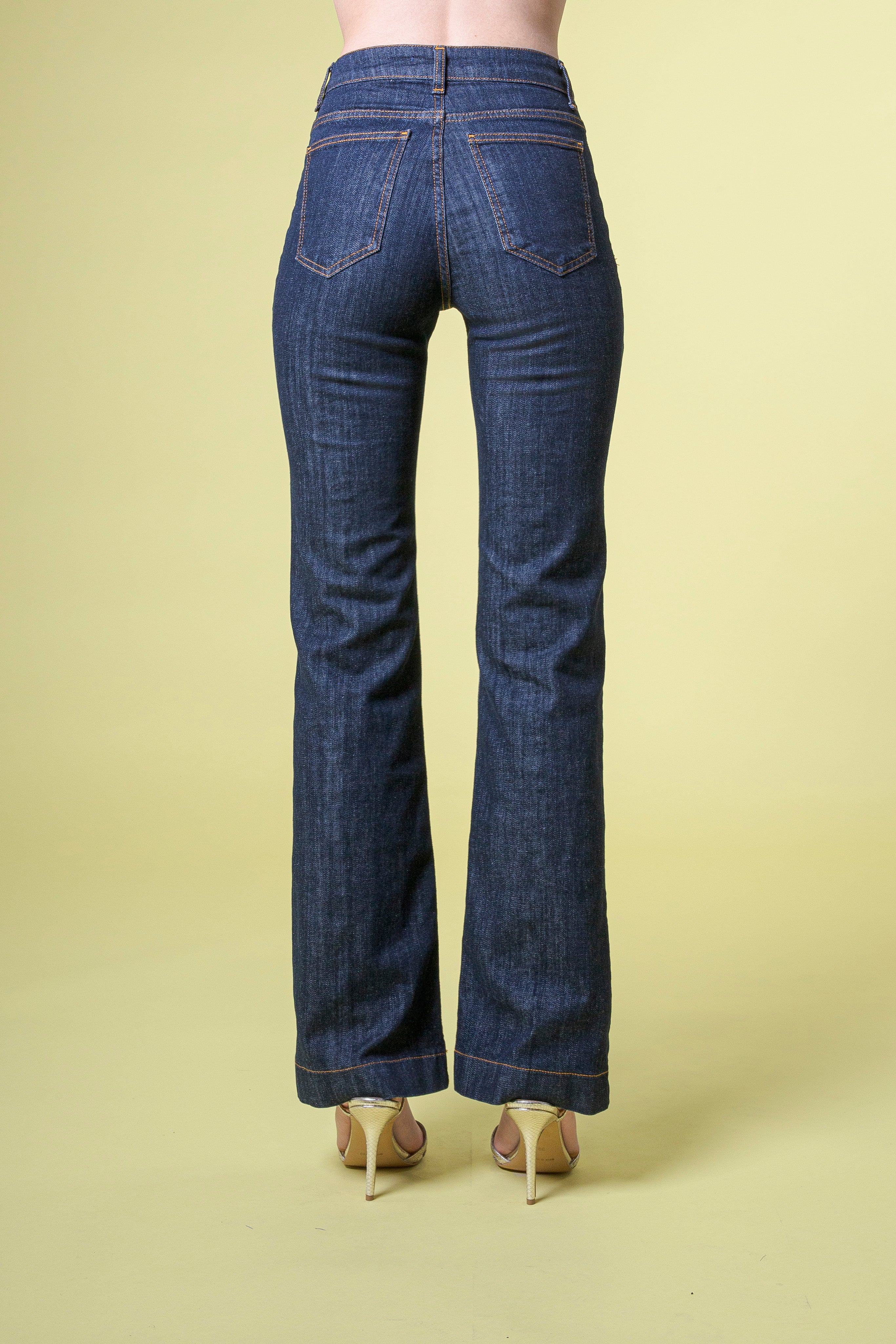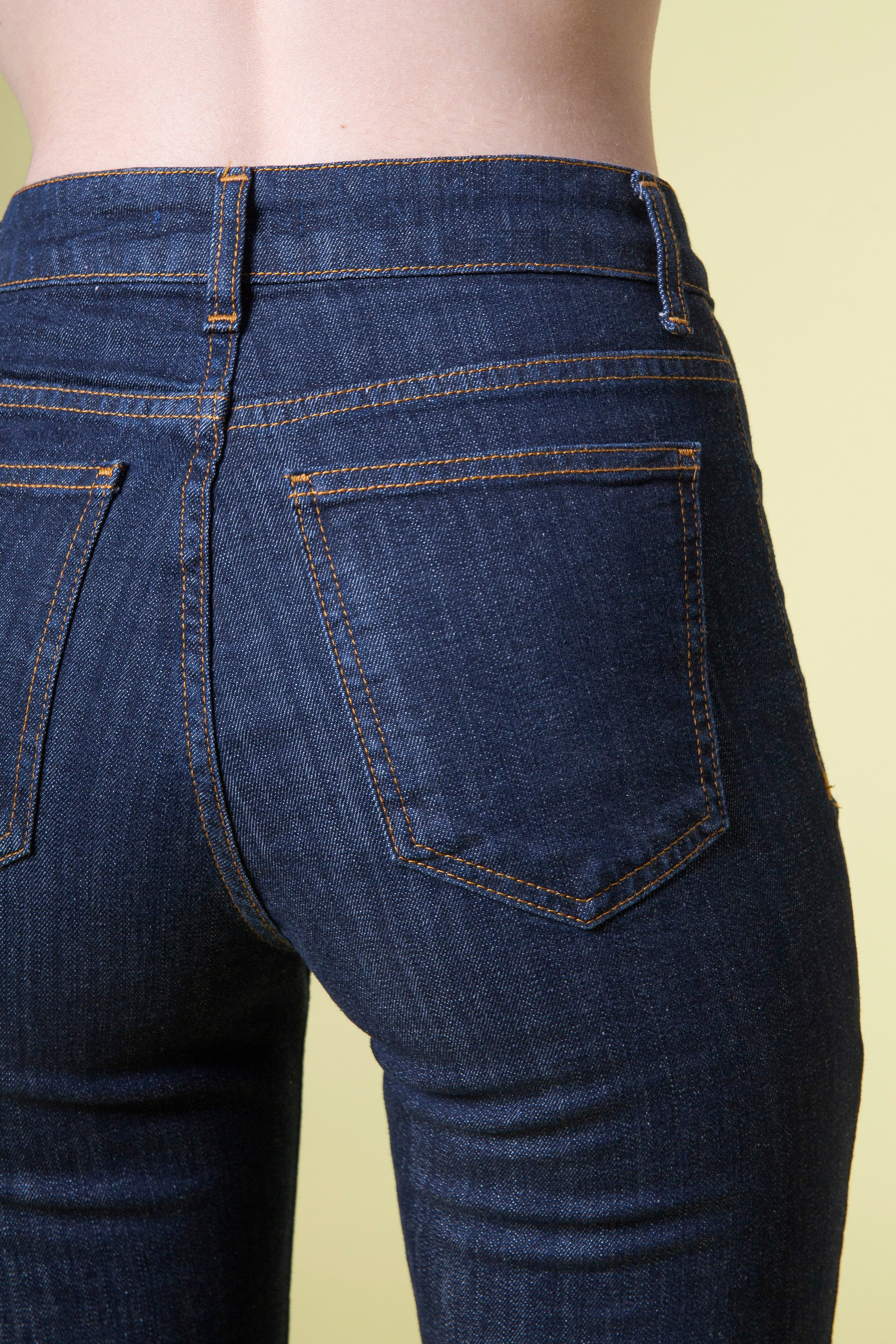 A impreziosire il capo, i bottoni oro firmati FC Flavio Castellani sulla vita: piccoli dettagli di lusso che catturano la luce e conferiscono un senso di raffinatezza immediata. Non sono solo chiusure funzionali, ma punti di luce che parlano di stile consapevole e attenzione ai particolari. Il loro riflesso dorato contro il denim scuro crea un contrasto elegante e sorprendente.