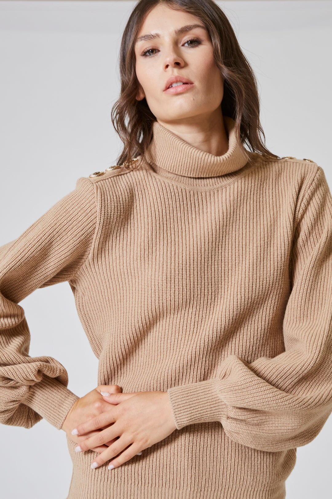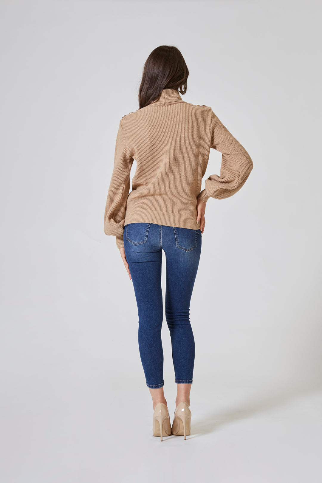 Il collo alto, ampio e morbido, si sollevava con grazia intorno al viso, come una carezza invernale — discreta ma presente. Non era rigido, non imponeva struttura: si adattava, seguiva, proteggeva.