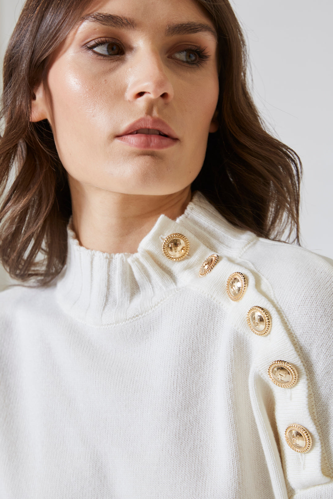 Sulla spalla sinistra, come un dettaglio inatteso ma assolutamente necessario, si posavano i bottoni dorati. Allineati con grazia, brillavano con una luce discreta ma decisa. Non rompevano l’equilibrio del capo: lo completavano. Erano il punto esatto in cui la semplicità si faceva stile, in cui l’essenzialità si caricava di senso.