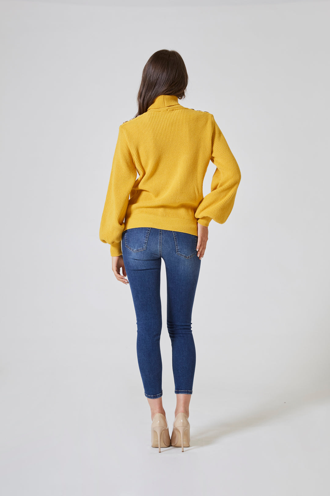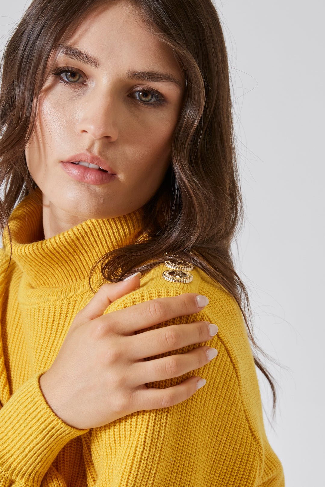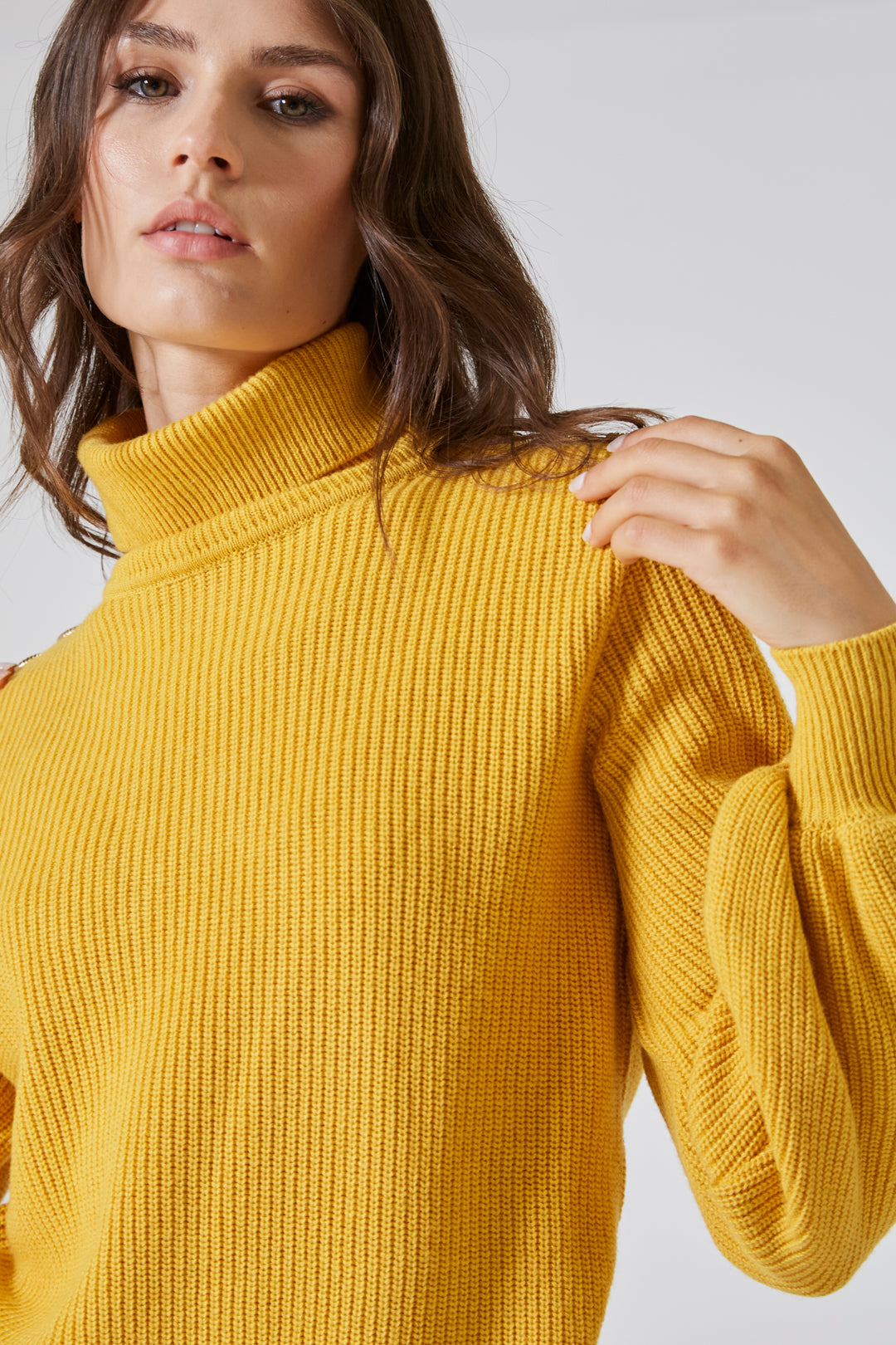 Il collo alto, ampio e morbido, si sollevava con grazia intorno al viso, come una carezza invernale — discreta ma presente. Non era rigido, non imponeva struttura: si adattava, seguiva, proteggeva.