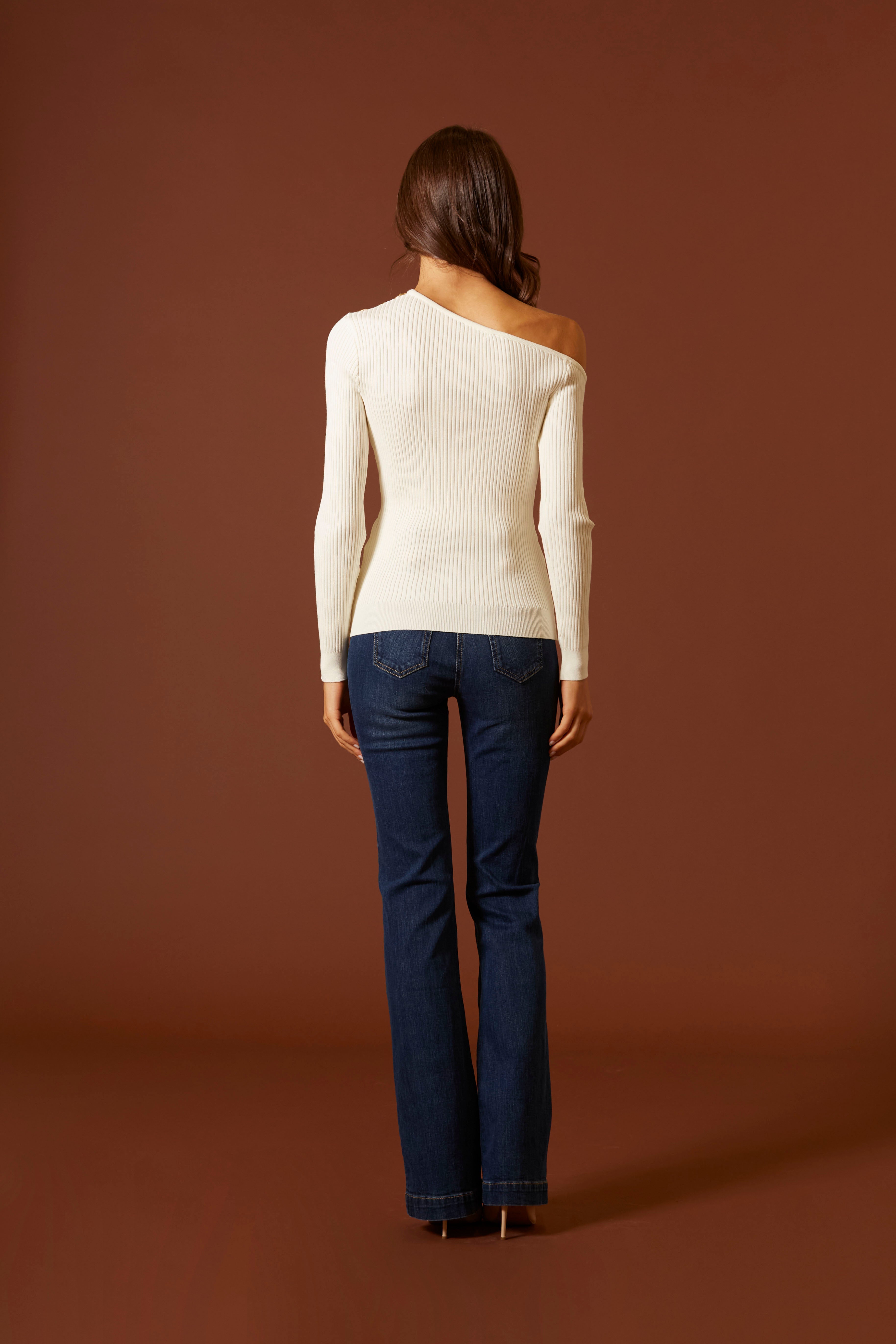 Tutto era perfettamente bilanciato. La costina verticale creava movimento, slancio, ritmo. Era una maglia, sì — ma sembrava scritta, più che cucita. Un discorso sottile tra la pelle e lo sguardo.