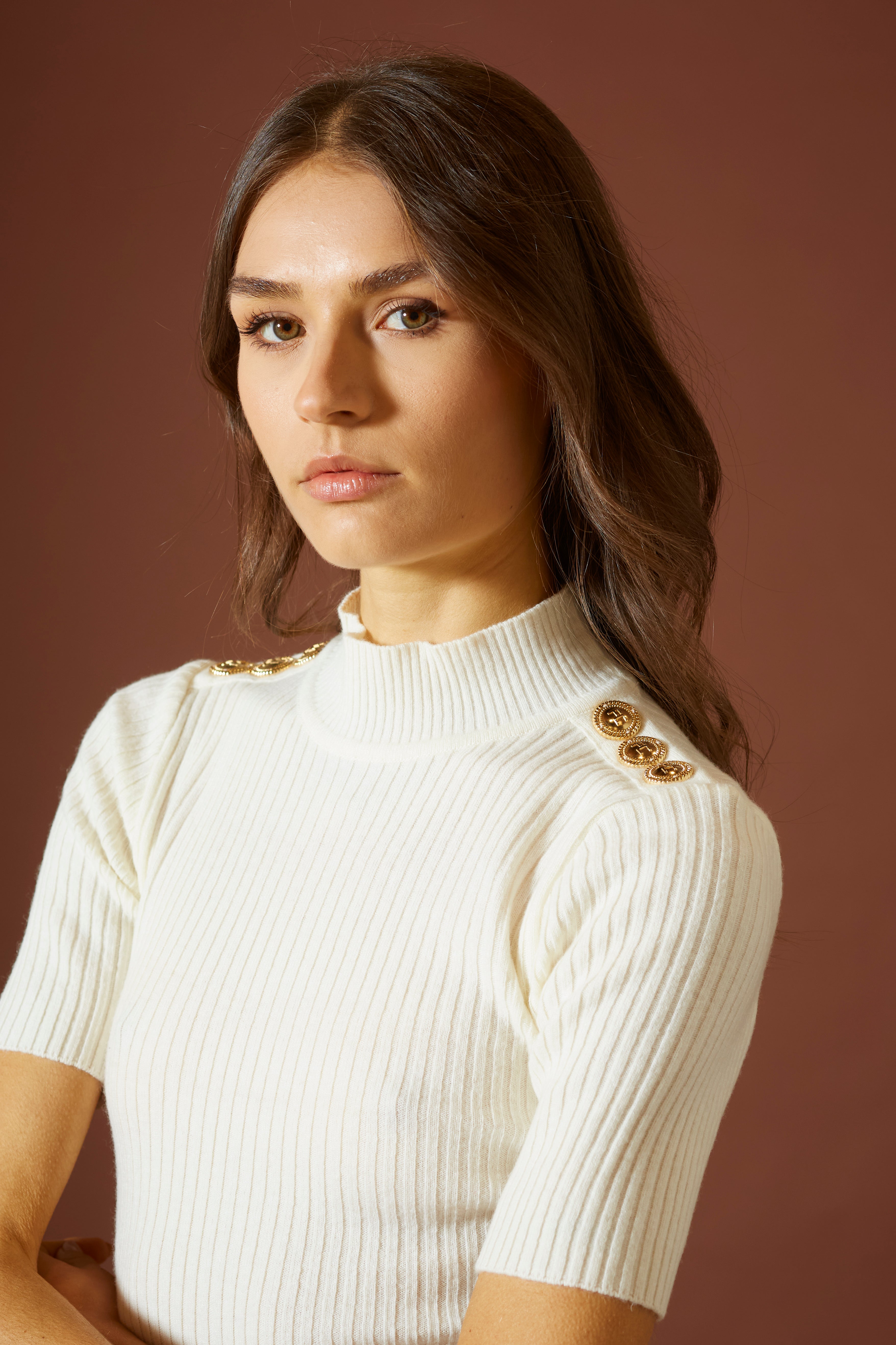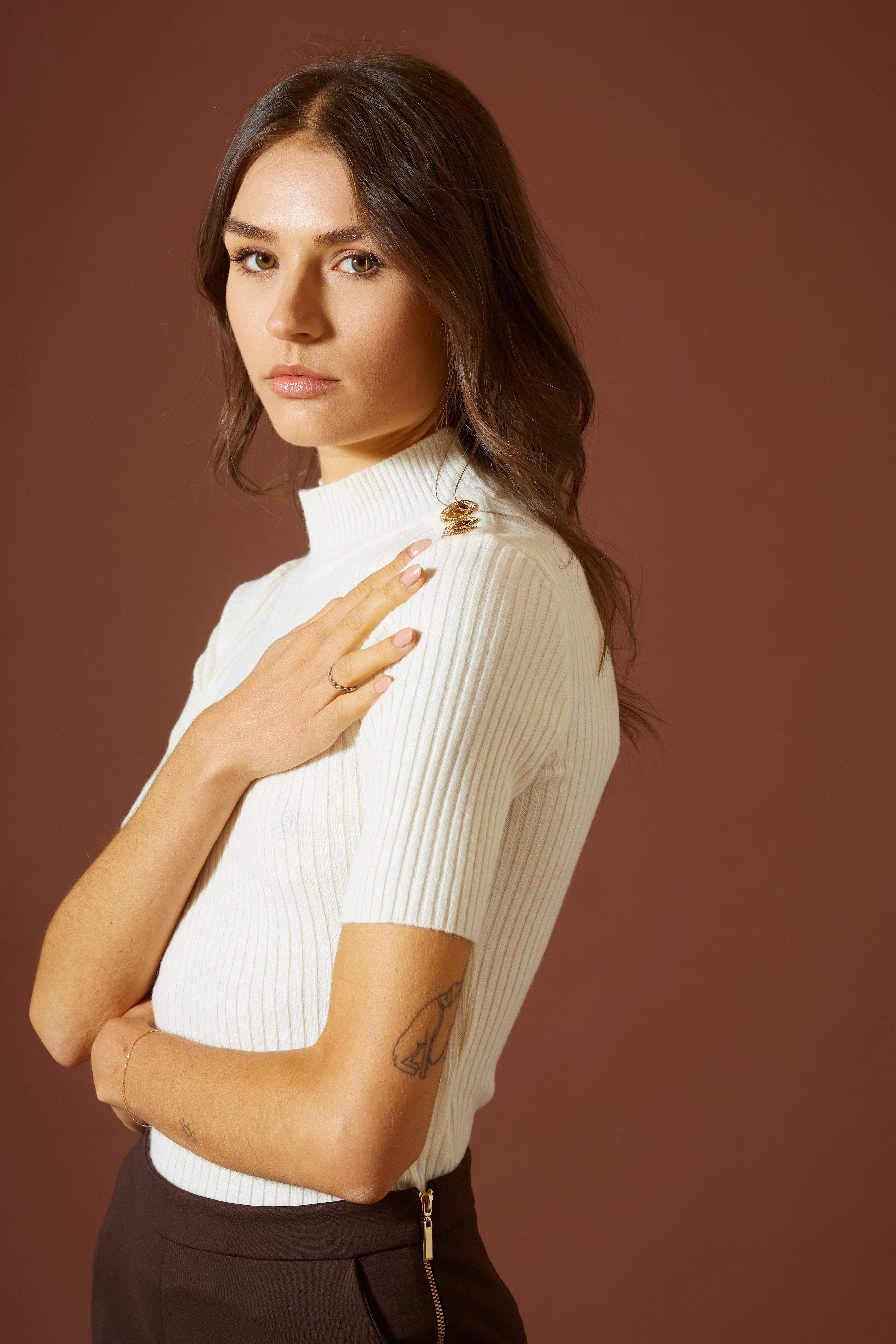 Il girocollo classico, pulito e raffinato, incorniciava il viso con semplicità perfetta, mentre le maniche corte donavano un’aria fresca e contemporanea, rendendo la maglia ideale sia per i look più quotidiani che per quelli più ricercati.