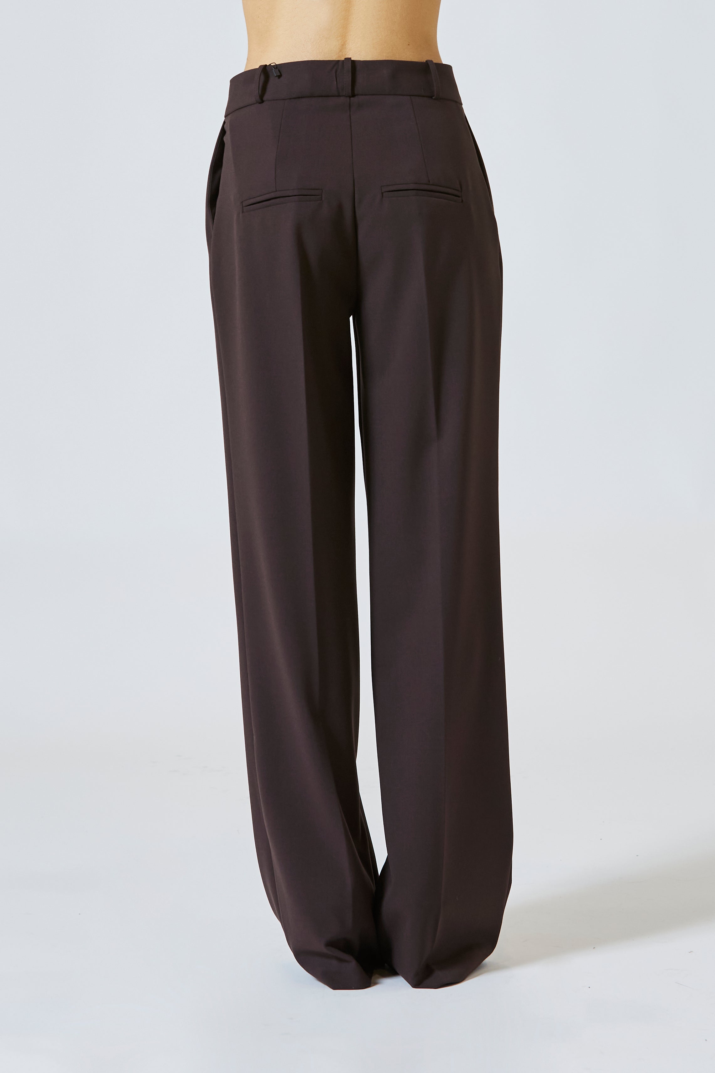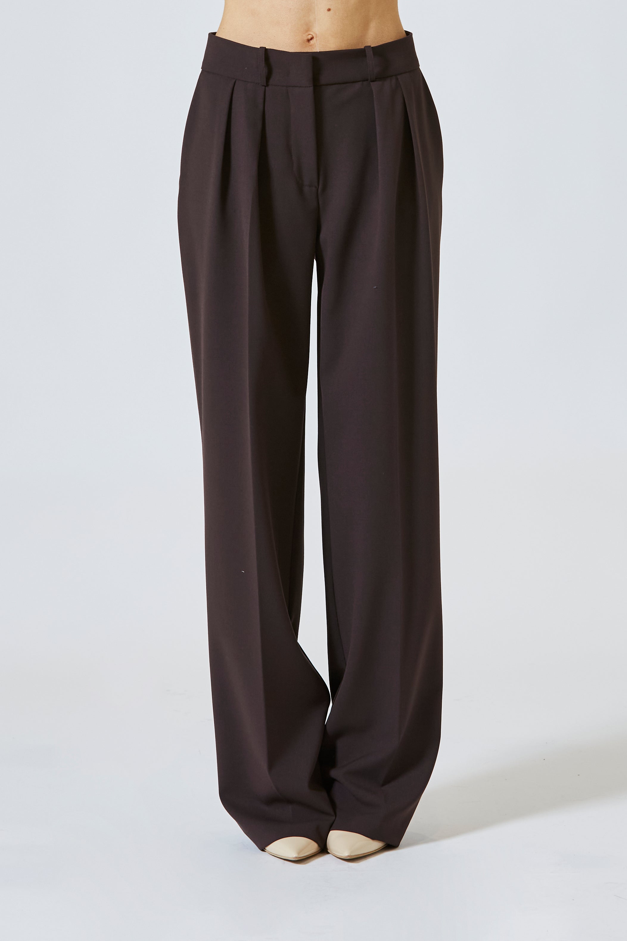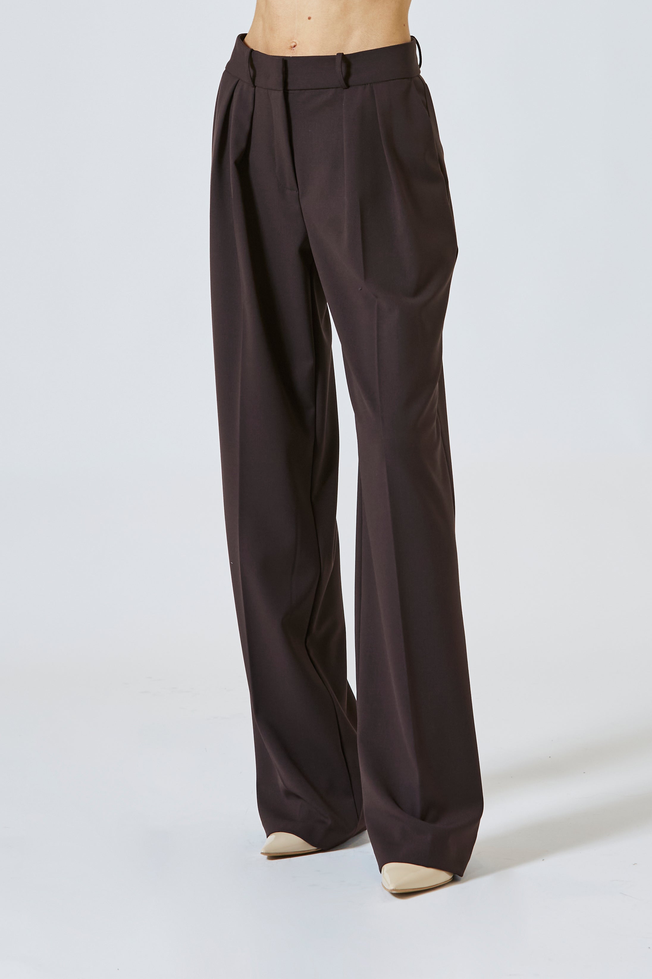 È un pantalone che non segue le mode effimere, ma si allinea al tempo con grazia, scegliendo la via della struttura morbida e della compostezza elegante. La gamba ampia si apre fin dal bacino, scendendo fluida e diritta fino al pavimento, creando una silhouette allungata, slanciata, quasi architettonica. Ma c’è morbidezza in questa geometria: non c’è nulla di rigido, solo un’intelligenza del taglio che accompagna il movimento con naturalezza, come se il tessuto conoscesse il corpo che lo indossa.