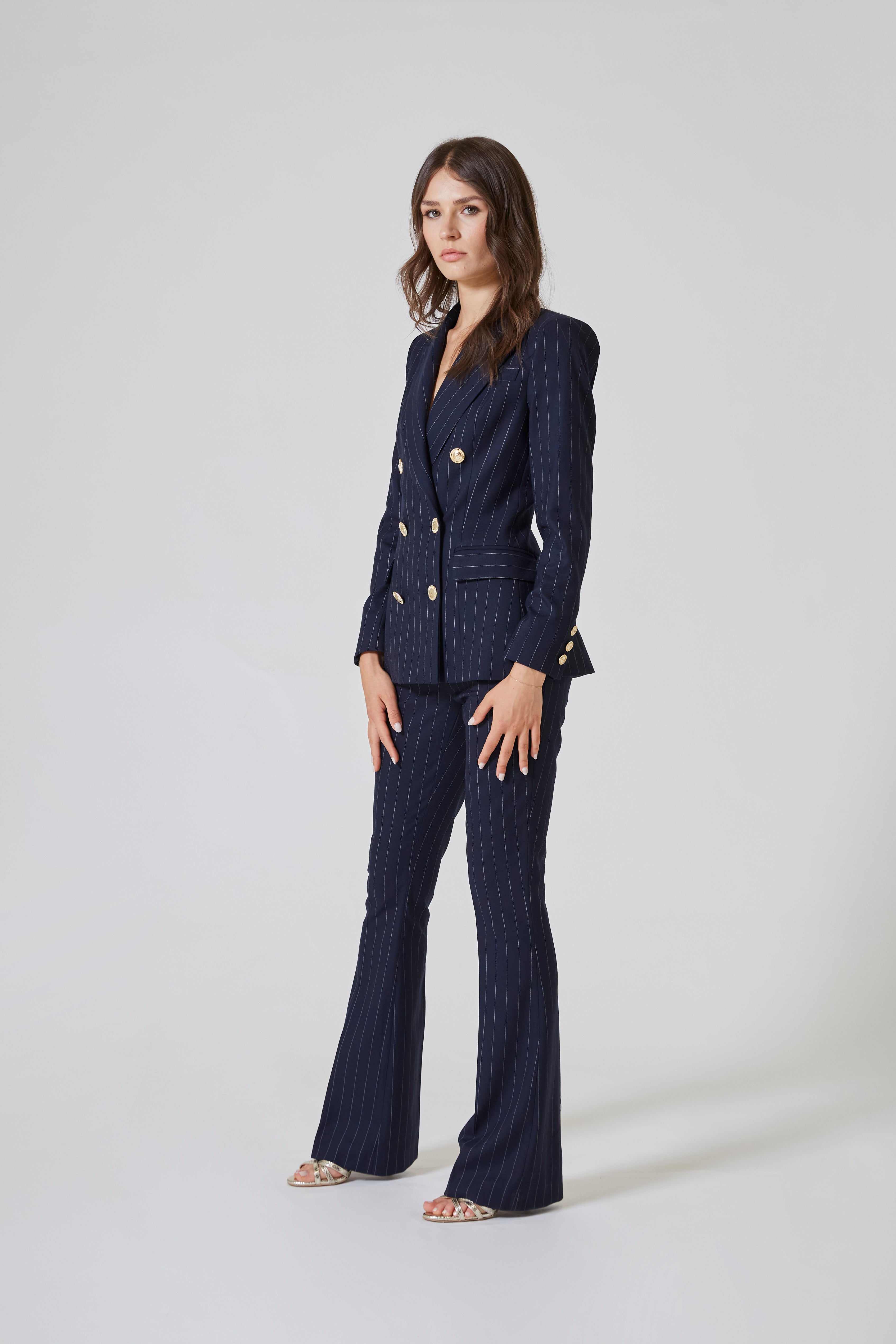 Abbinato alla giacca doppiopetto della stessa linea, il pantalone completa un completo che ha il sapore dell’alta moda e la forza del quotidiano. Ma anche da solo, è un protagonista: con una camicia in seta, con un top minimale, con un blazer destrutturato, racconta sempre una storia diversa, ma con la stessa identità forte.