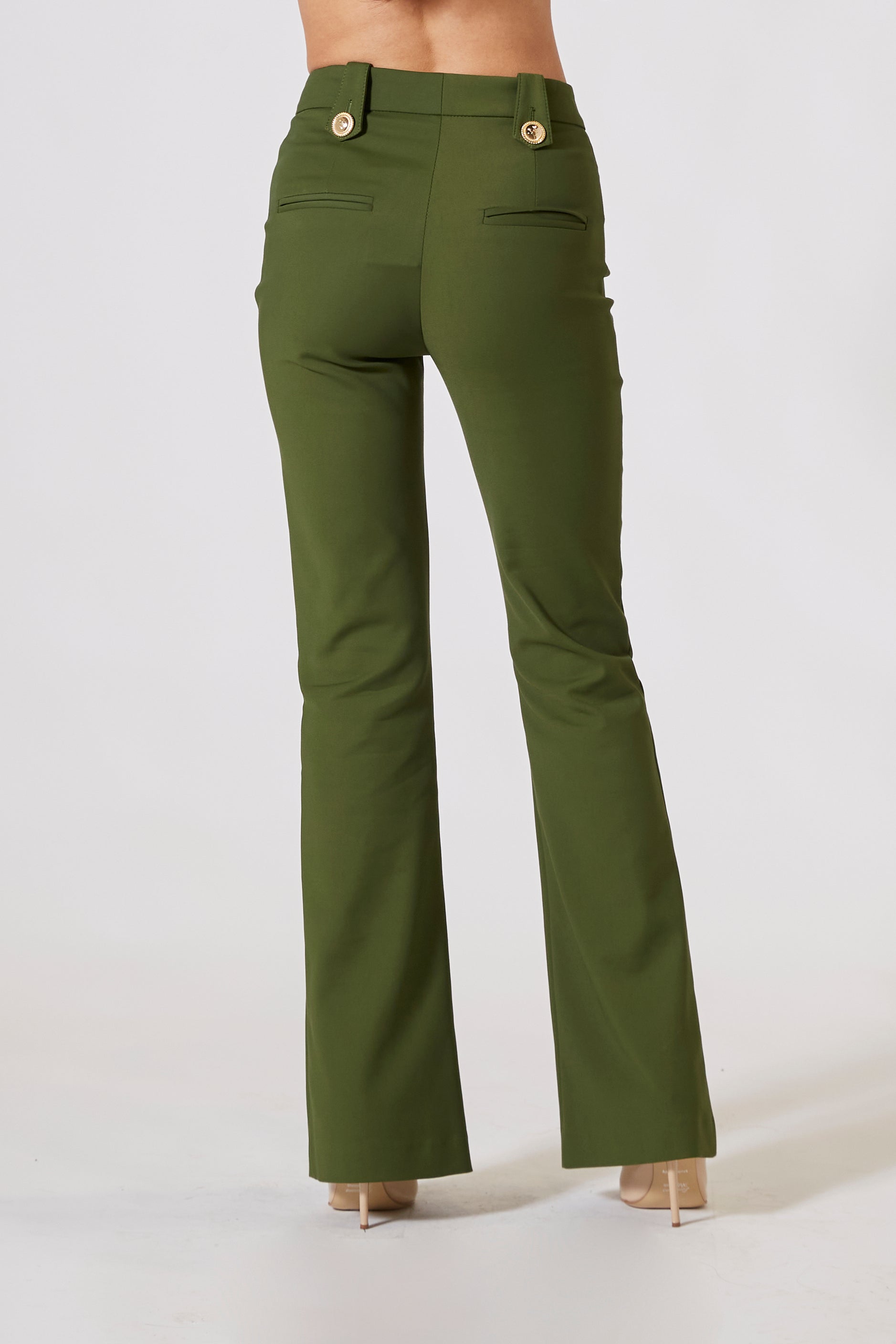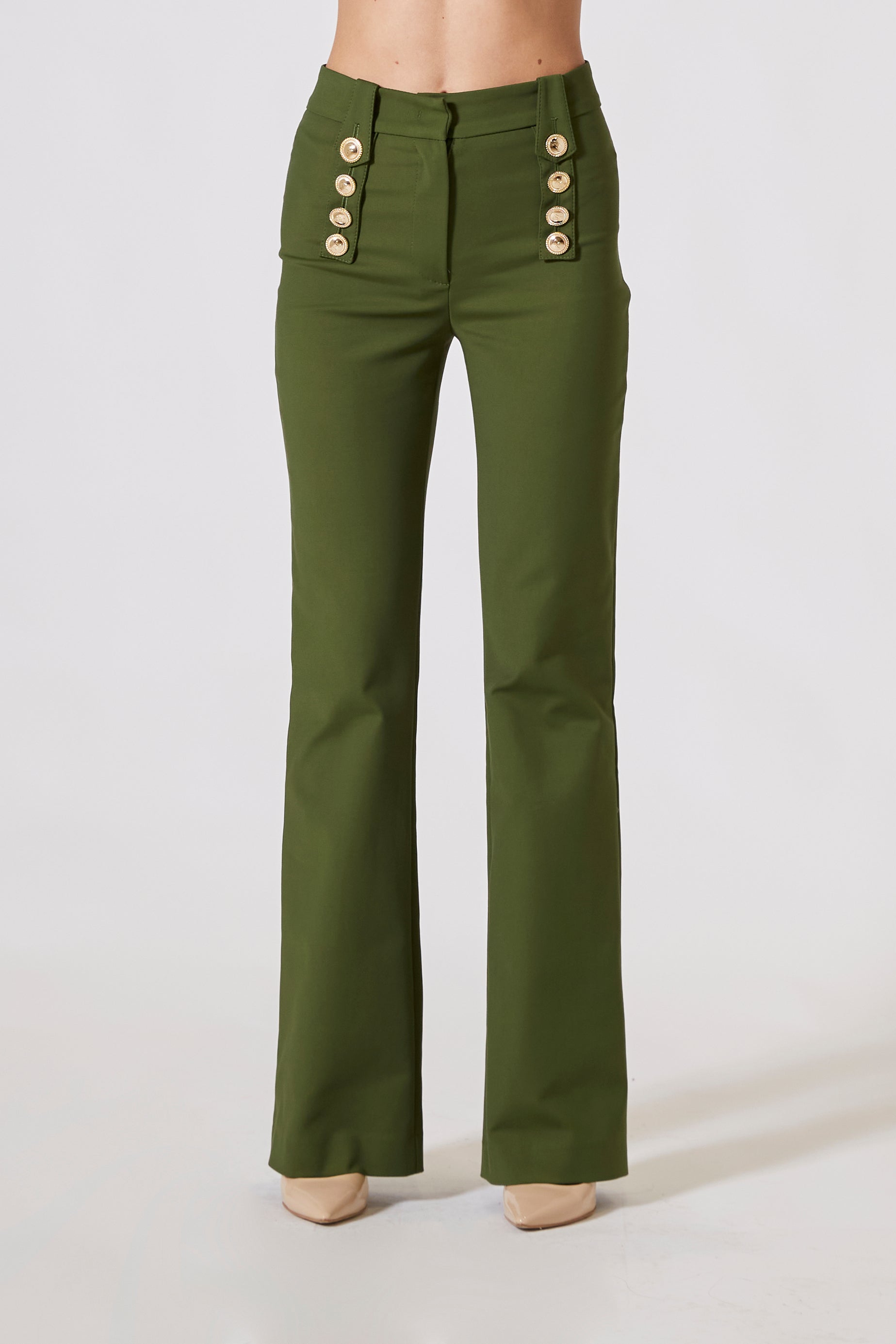 Dietro, le tasche a filetto raccontano di una sartorialità che non teme il tempo, mentre i due bottoni oro sui passanti completano il racconto con una carezza dorata, quasi un richiamo nascosto per chi sa osservare oltre la superficie.