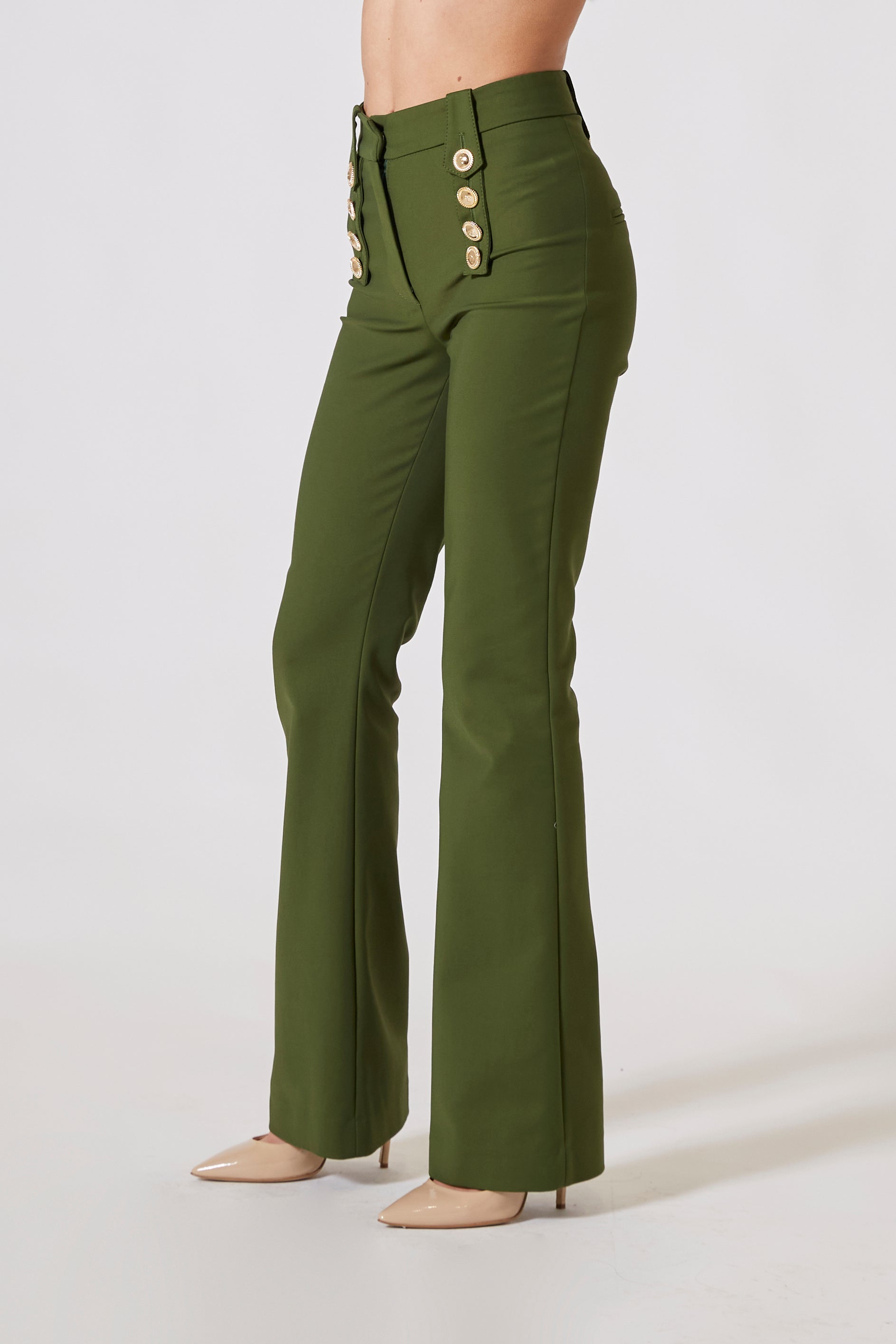 La linea ampia disegna una silhouette morbida e decisa, che scivola lungo le gambe come un respiro leggero, accarezzando il corpo e muovendosi con esso in una danza silenziosa. Sulle due estremità della vita, una fila ordinata di bottoni oro marchiati FC, sigillo prezioso di Flavio Castellani, punteggia il tessuto come piccole monete di luce, creando un equilibrio perfetto tra sobrietà e lusso discreto.
