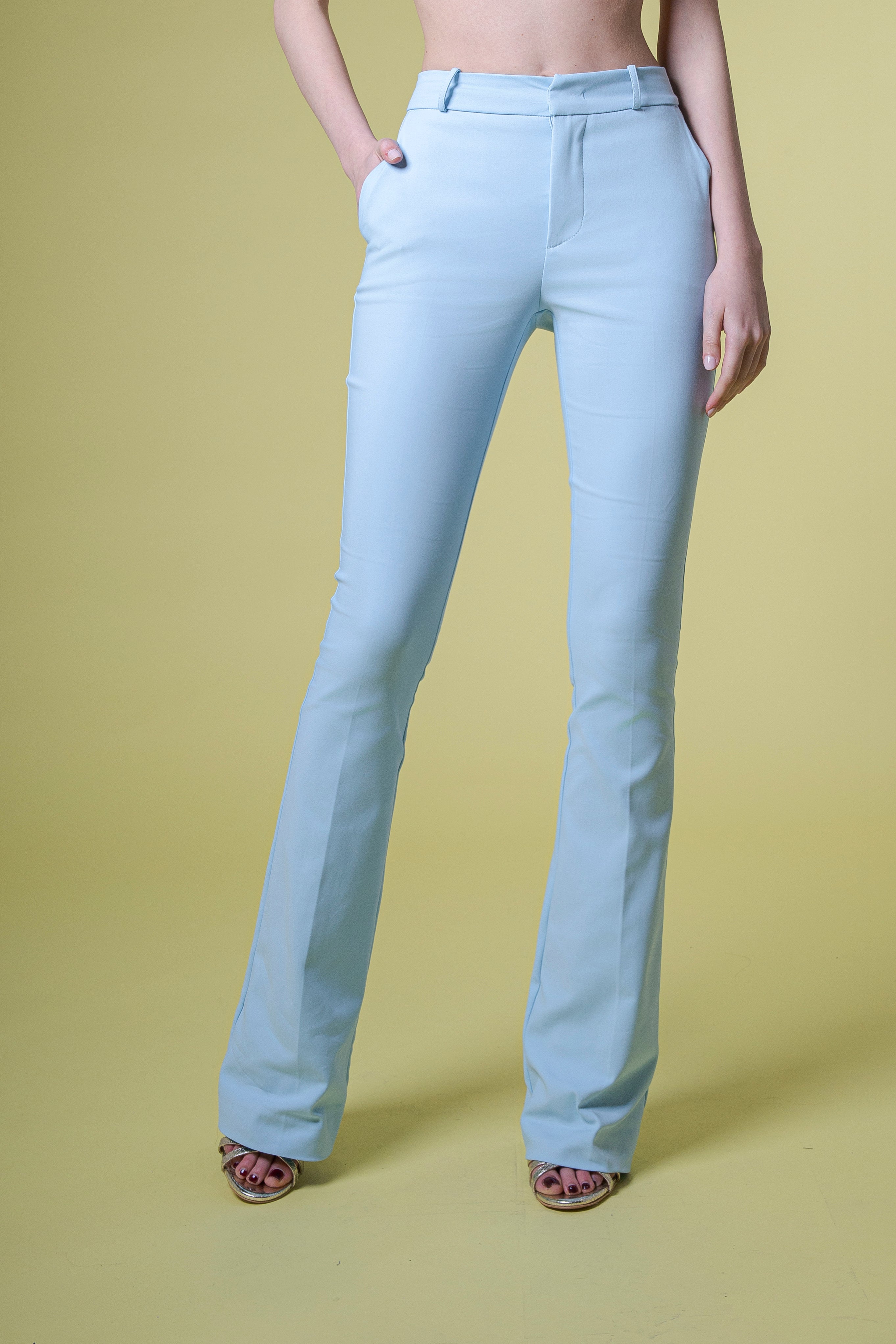 Il pantalone flare a zampetta in tessuto, Made in Italy, è un capo che unisce tradizione sartoriale e femminilità contemporanea, pensato per valorizzare la figura con naturale eleganza.