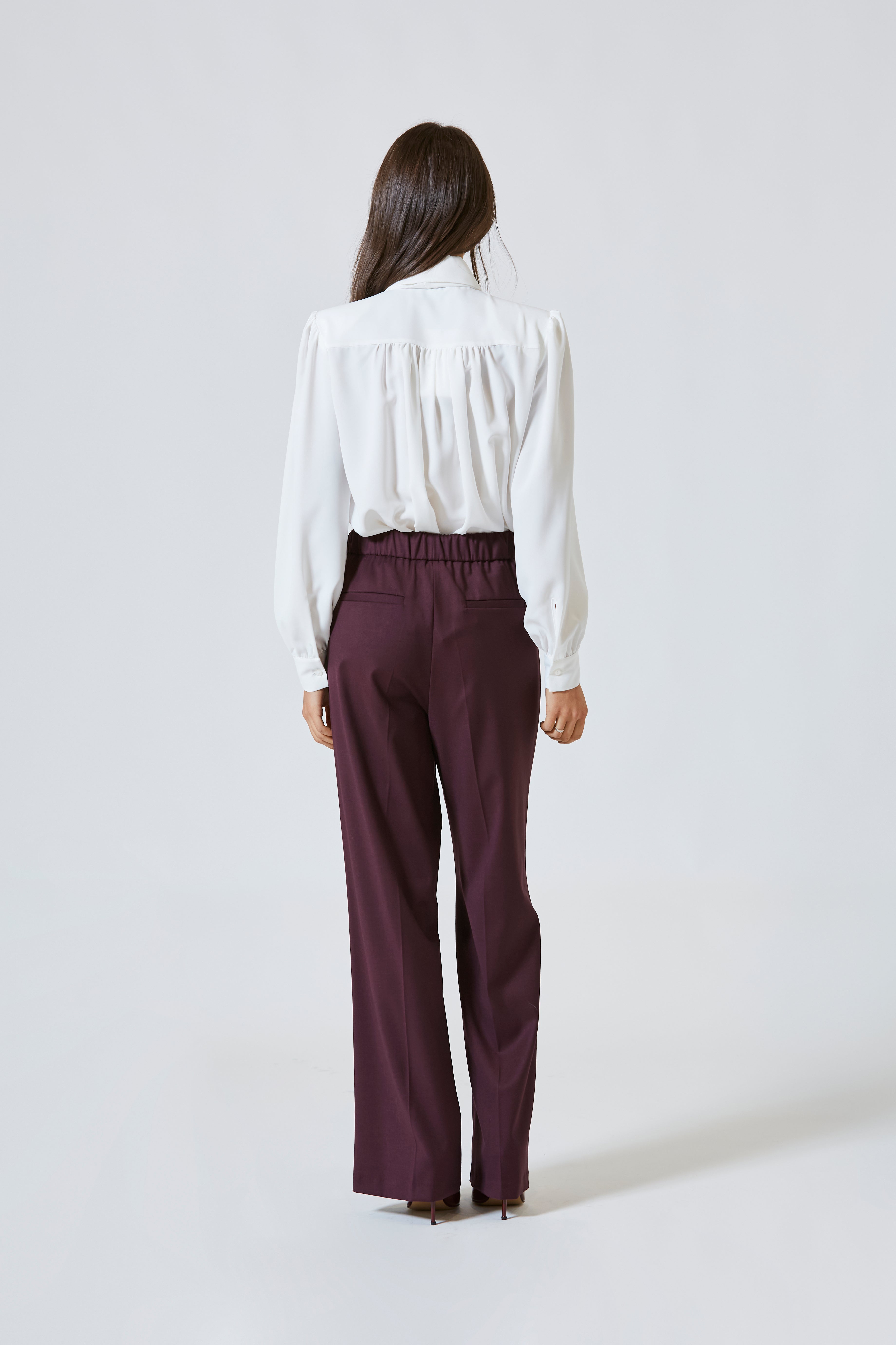 Questo pantalone è versatile: si presta ad abbinamenti più formali con camicie e blazer coordinati, ma sa vivere anche con maglie morbide o top minimal, esaltando la femminilità con discrezione e modernità.