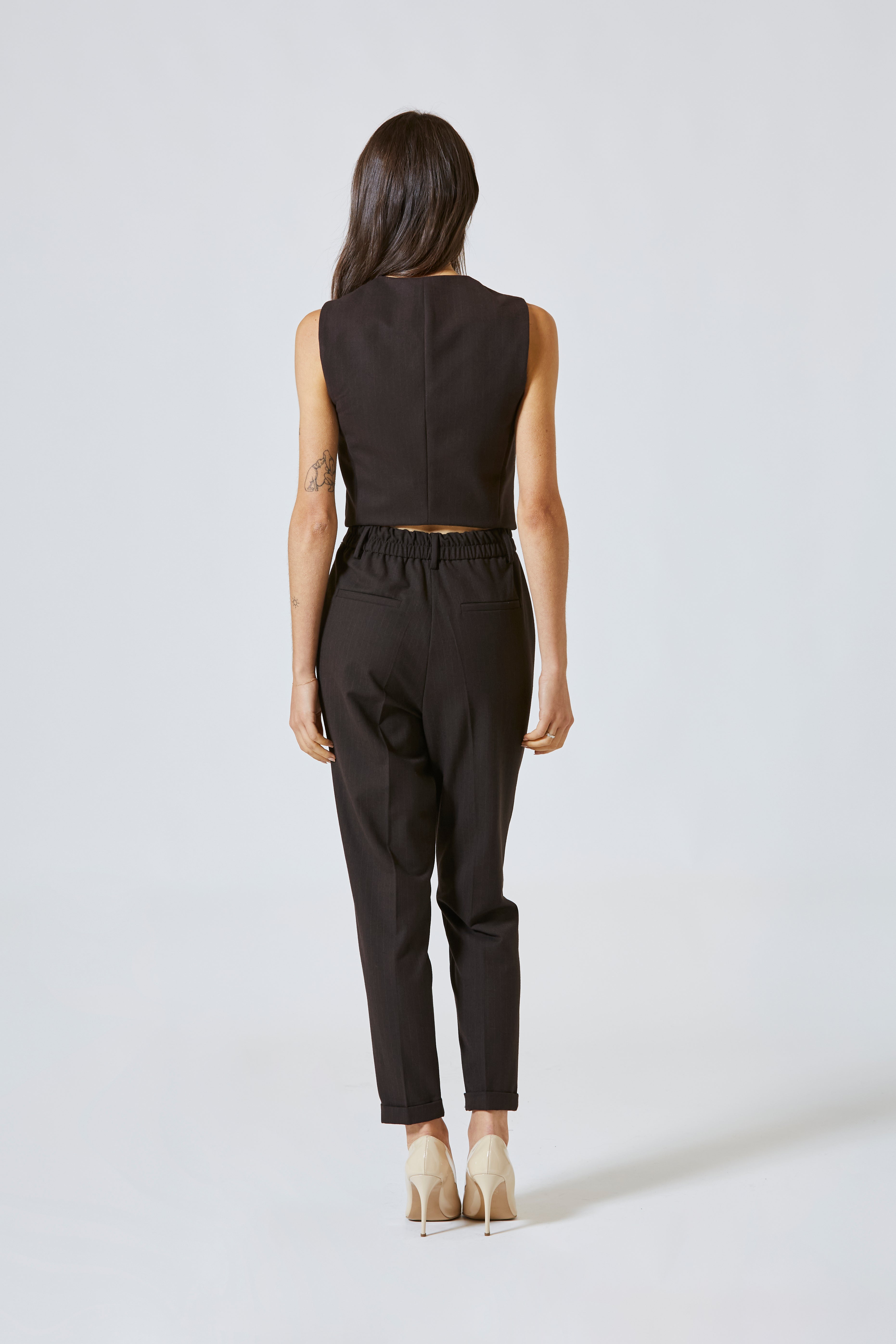 Realizzato in tessuto pregiato Made in Italy, con la stessa trama gessata fine e raffinata del gilet coordinato, questo pantalone unisce la tradizione sartoriale alla funzionalità contemporanea. Le righe verticali scorrono come un'eco visiva di sicurezza e sobrietà, disegnando la figura con discrezione, senza mai risultare rigide o scontate.