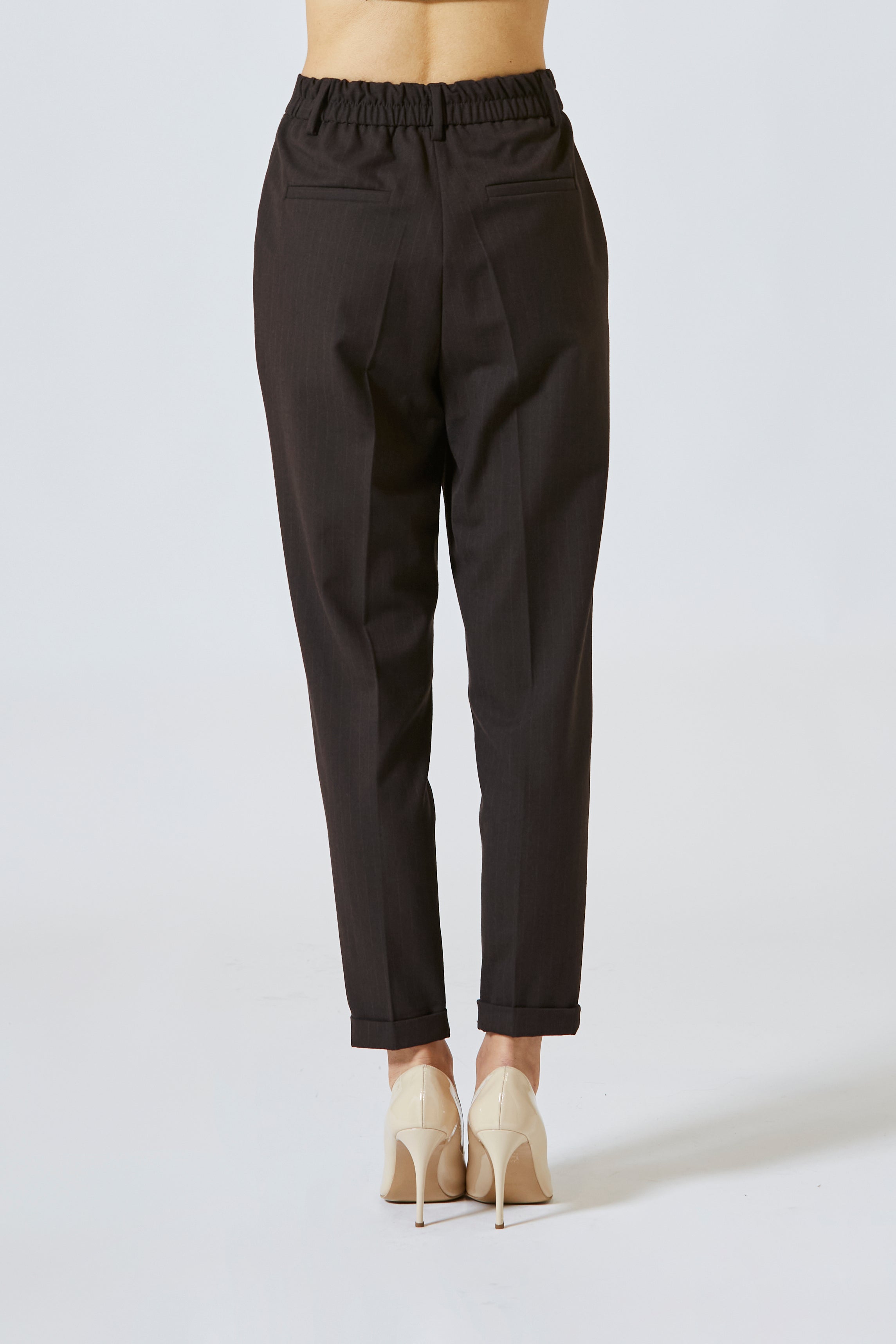 Ma è nella vita elastica che il capo rivela il suo spirito più libero: un dettaglio apparentemente casuale, in realtà studiato nei minimi particolari per garantire comfort assoluto e vestibilità impeccabile. Nessuna costrizione, solo libertà di movimento, eleganza senza sforzo. È il pantalone che si indossa al mattino e si dimentica, tanto è comodo, tanto è naturale.