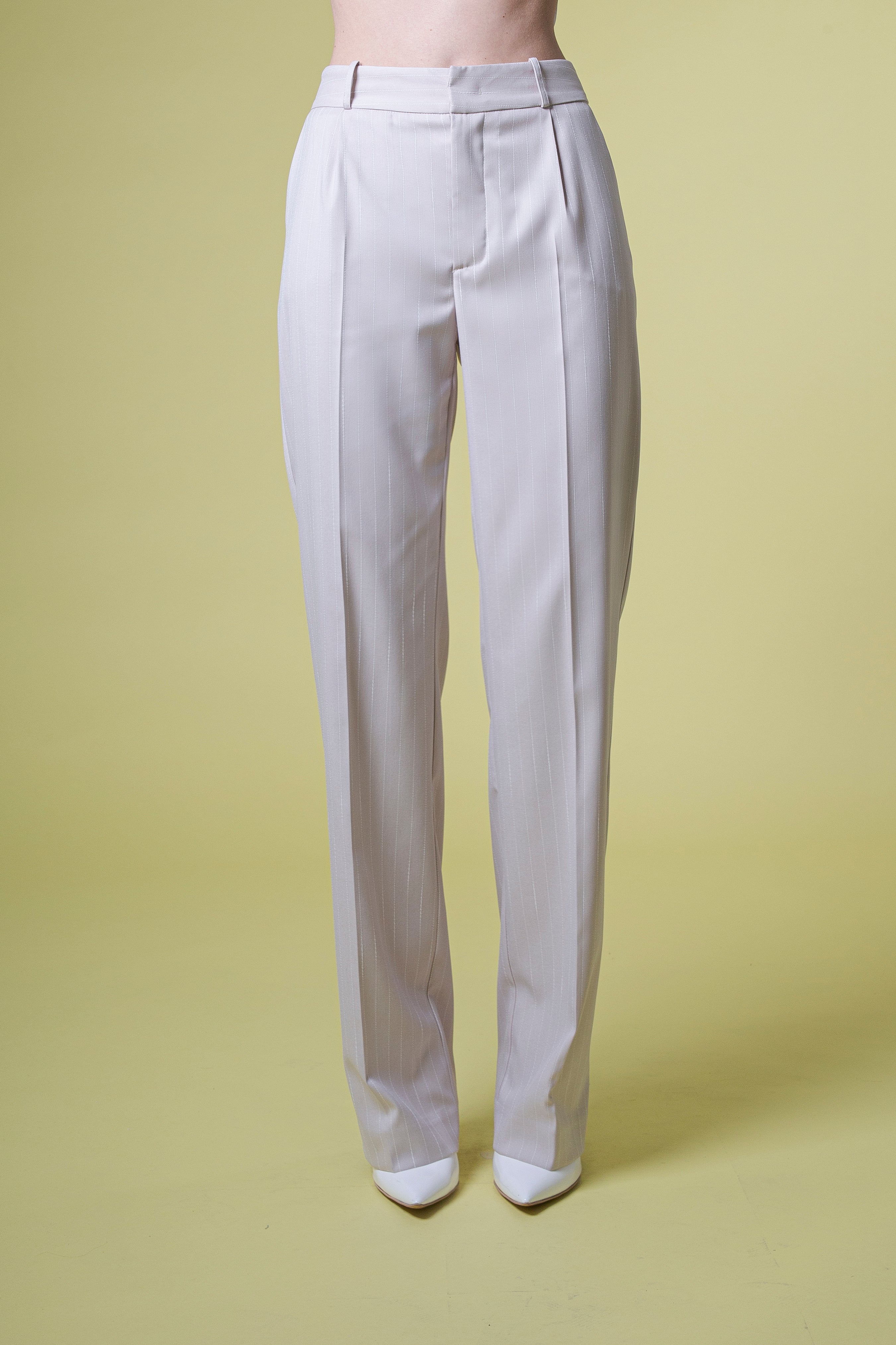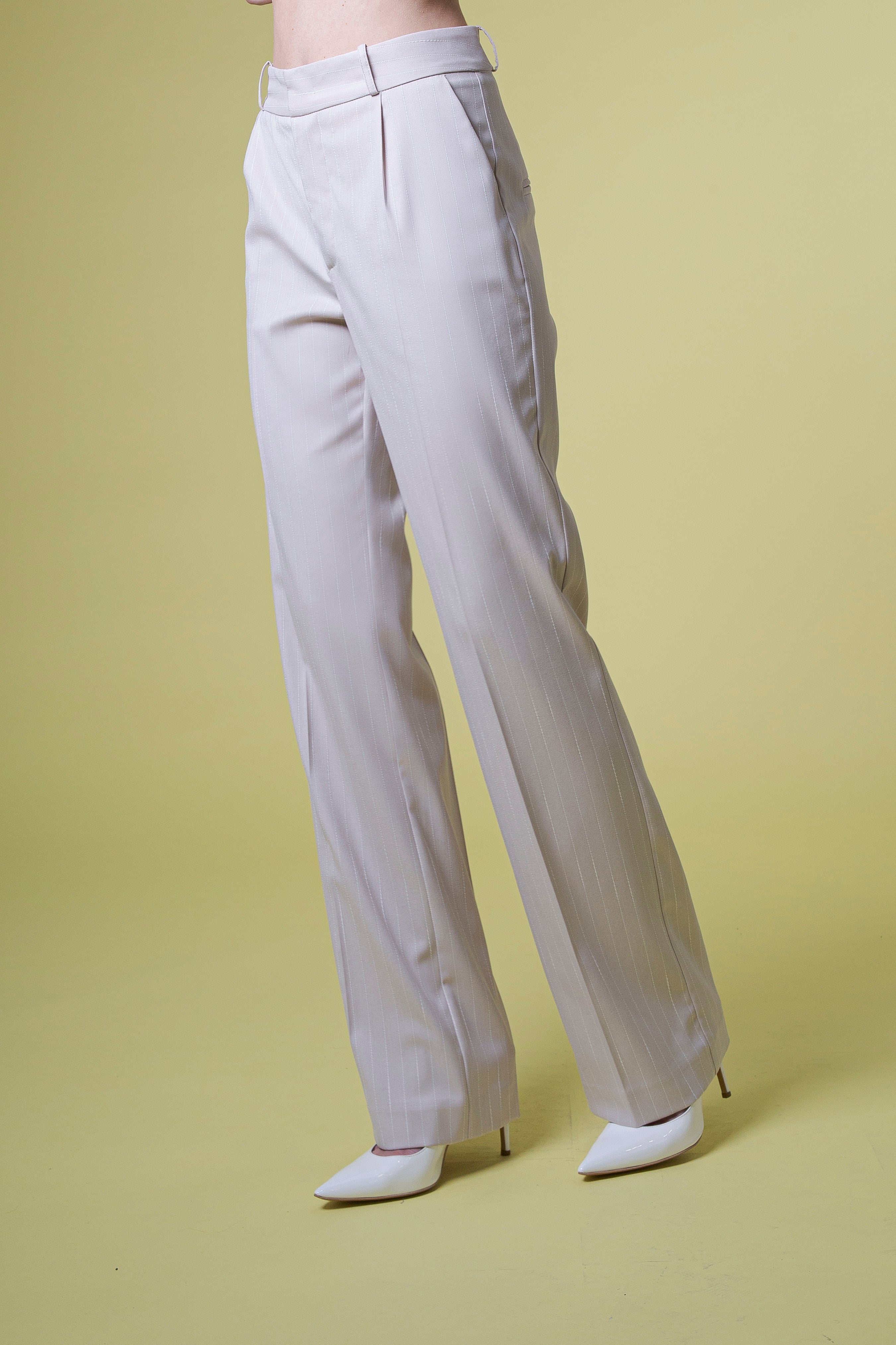 Il pantalone gessato a completo rappresenta la perfetta continuazione della giacca doppiopetto, fondendo rigore sartoriale e linea moderna in un unico capo dal fascino deciso. Il taglio dritto scivola lungo la gamba con naturalezza, regalando eleganza e fluidità al movimento, mentre le pinces sul davanti definiscono la vita con precisione, valorizzando la silhouette e conferendo struttura senza rinunciare al comfort.