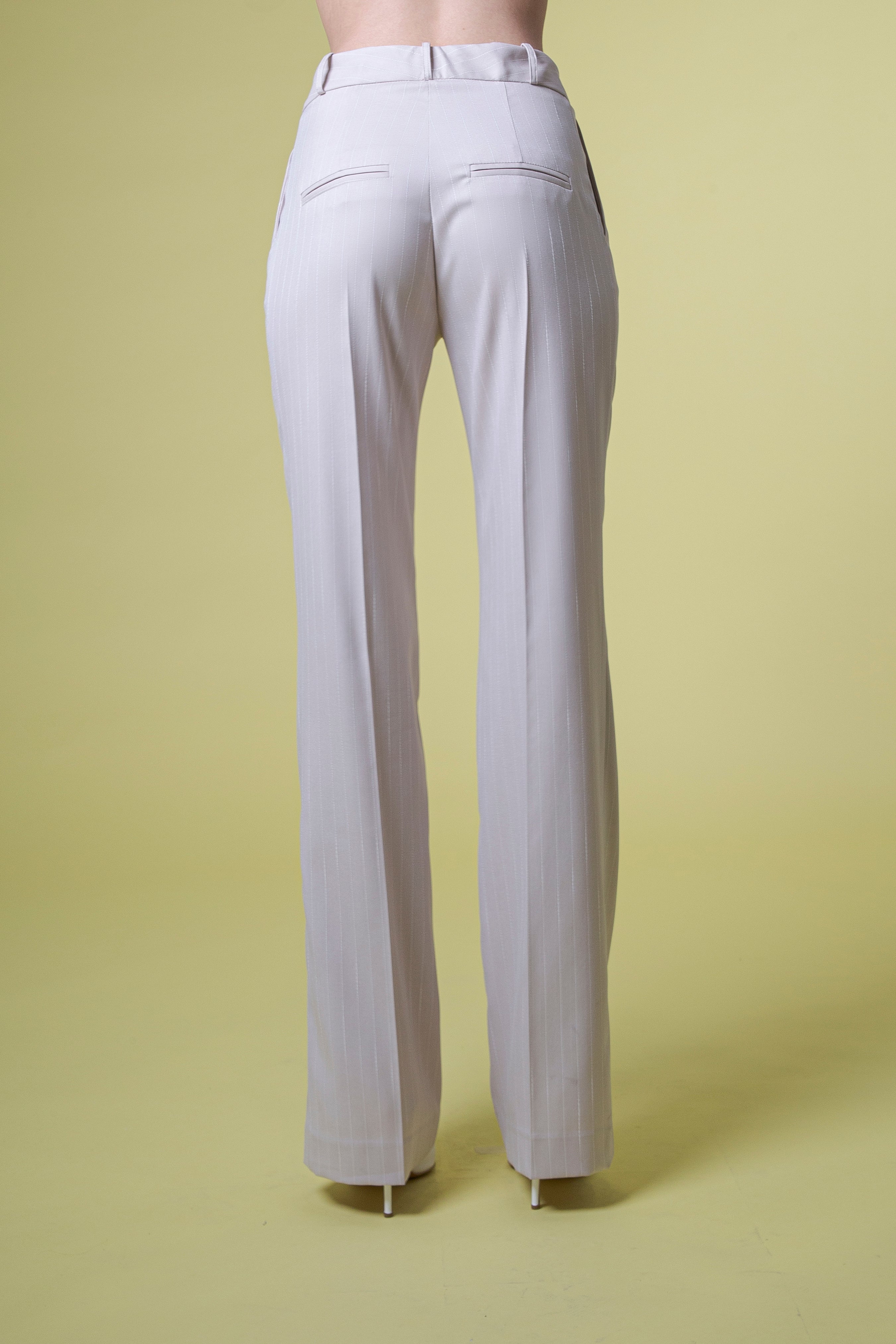 Il tessuto gessato, raffinato e sofisticato, riprende il motivo della giacca, creando un completo armonioso e coerente, dove ogni dettaglio parla di cura sartoriale e stile senza tempo. La combinazione di linee pulite e proporzioni equilibrate rende questo pantalone perfetto per chi ama l’eleganza classica reinterpretata in chiave contemporanea, capace di distinguersi con discrezione e autorevolezza.