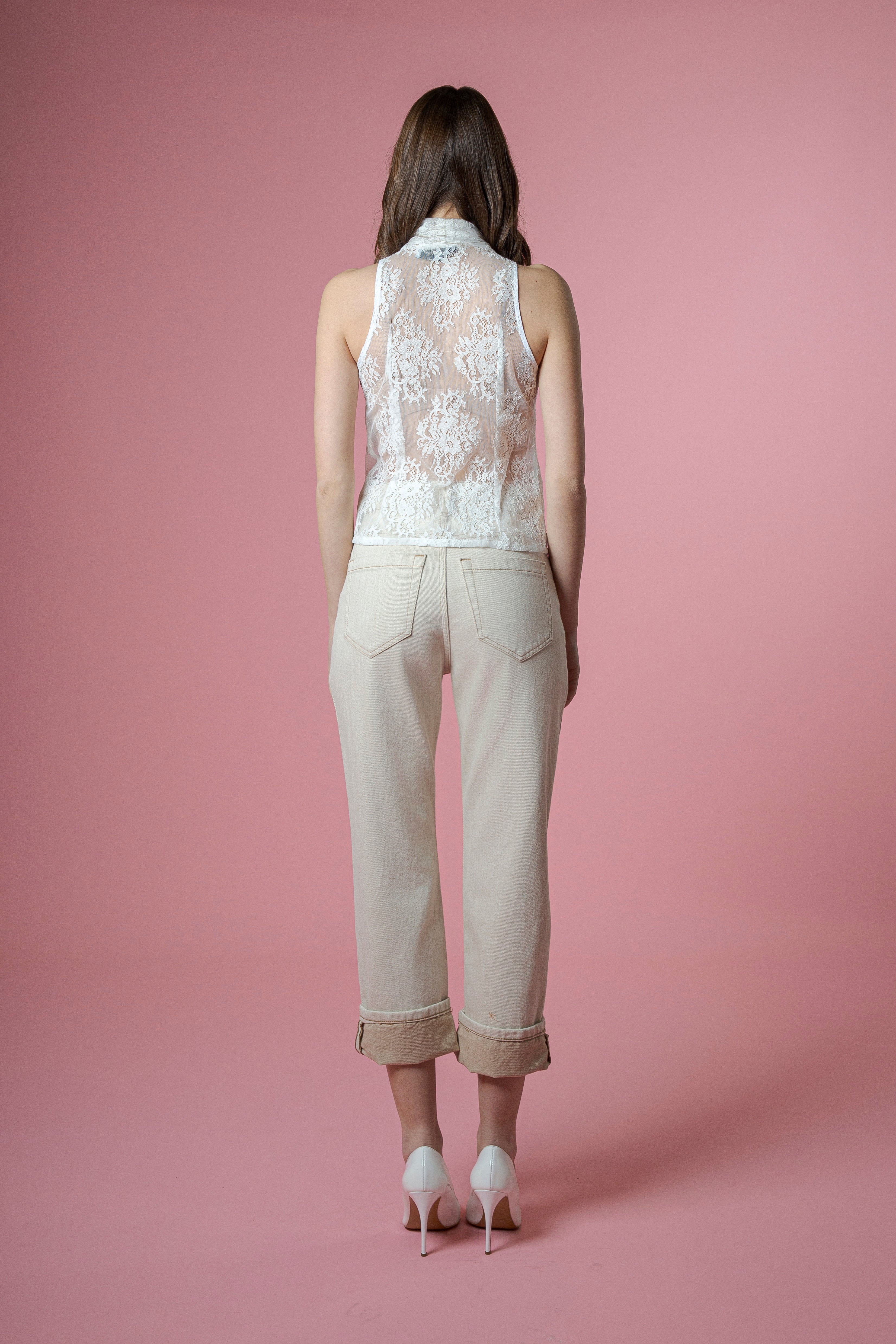 Il taglio pinocchietto avvolge i fianchi con morbidezza, lasciando spazio al corpo senza stringere, mentre il fondo leggermente più stretto disegna una silhouette armoniosa e decisa. La risvolta alla caviglia diventa il gesto finale di una composizione sartoriale: un dettaglio semplice ma studiato, che cattura lo sguardo senza gridare, donando ritmo e movimento alla figura e aggiungendo un tocco di carattere casual-chic.