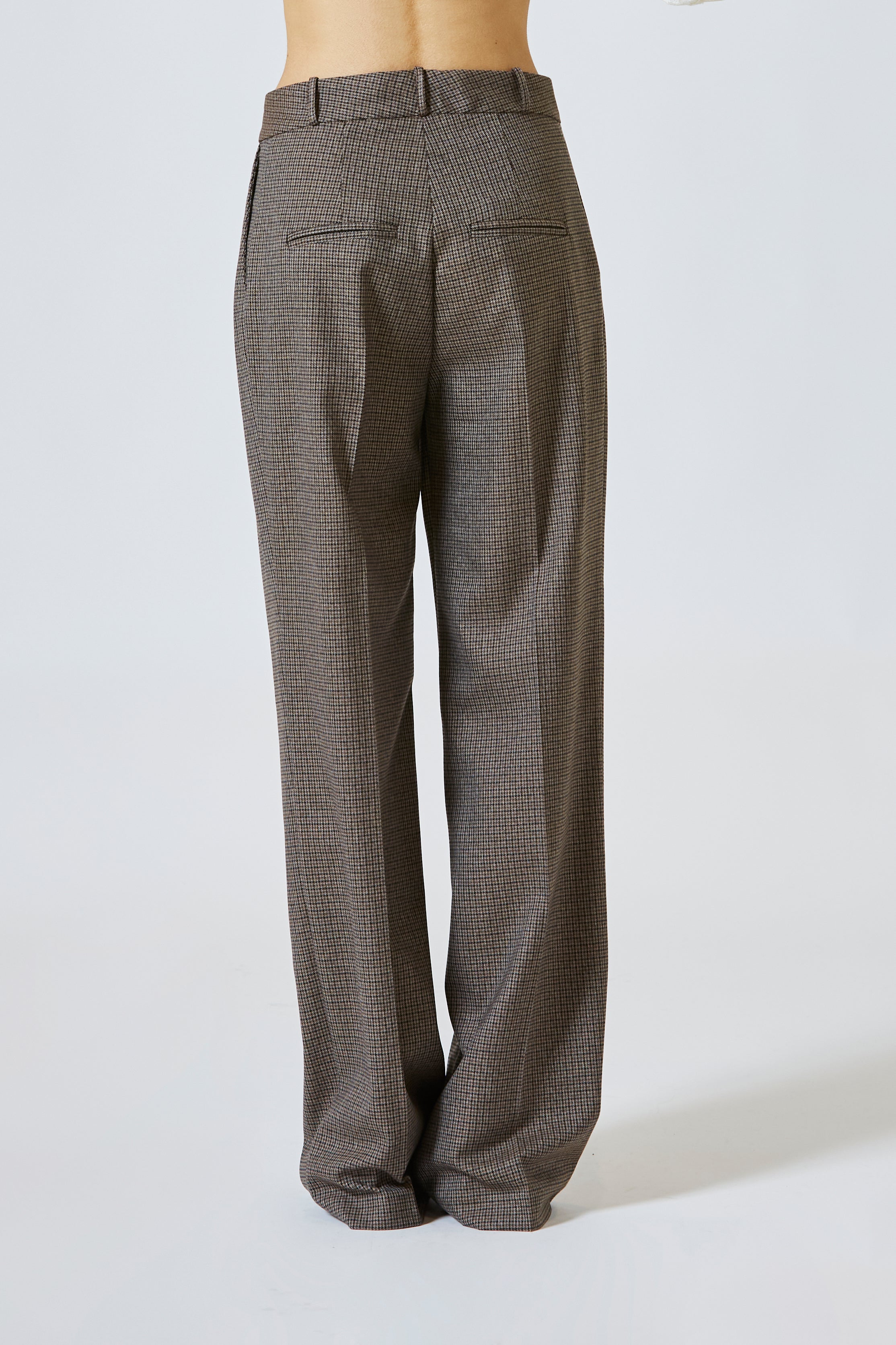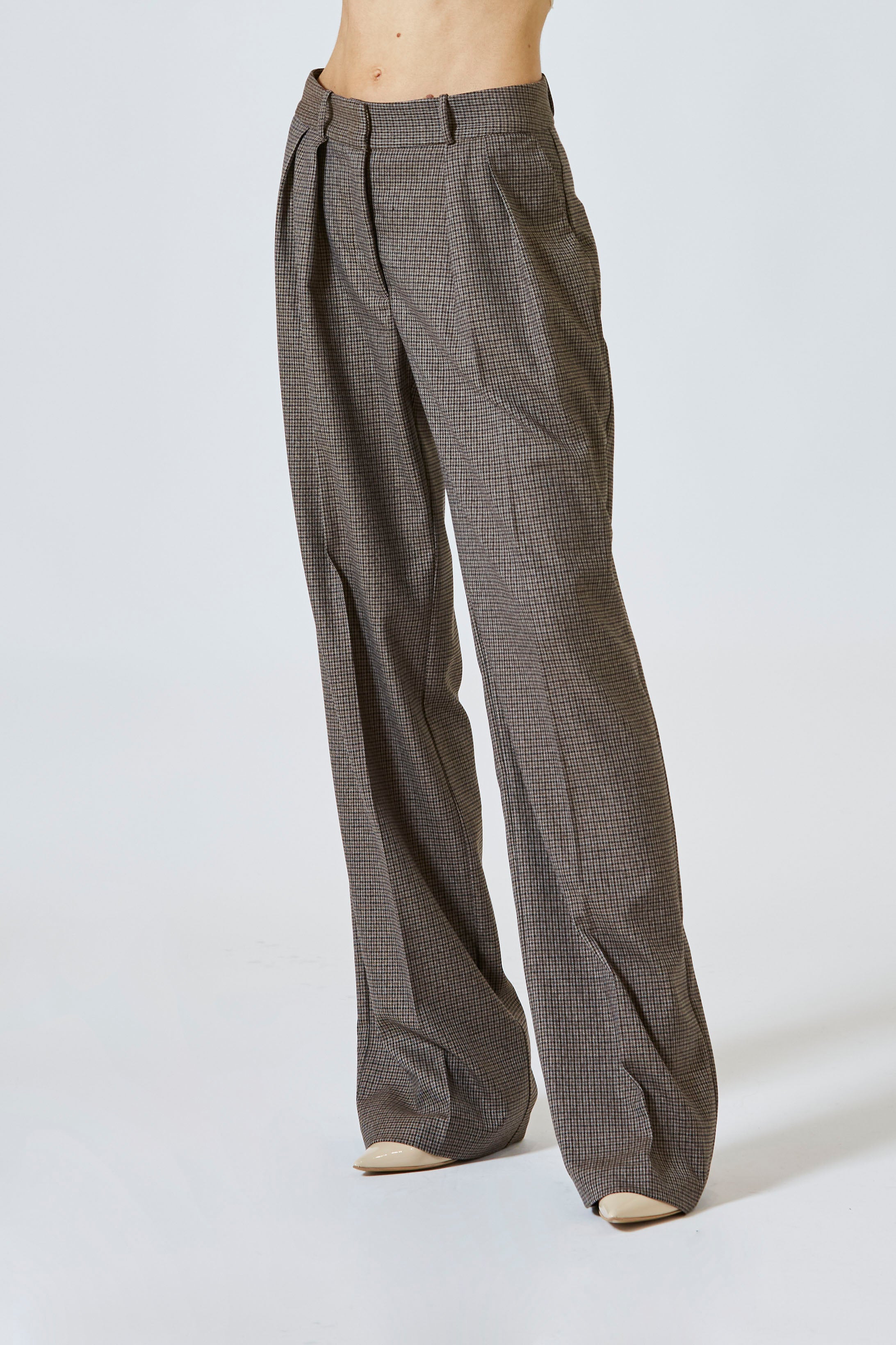 Le pinces sul davanti raccontano la grazia del gesto sartoriale, quel tocco d’arte che sa modellare la forma senza costringerla. Il tessuto, disegnato da un piccolo quadro elegante e intramontabile, cattura la luce con sobrietà, sussurrando un’eleganza che vive nei dettagli.